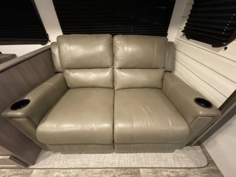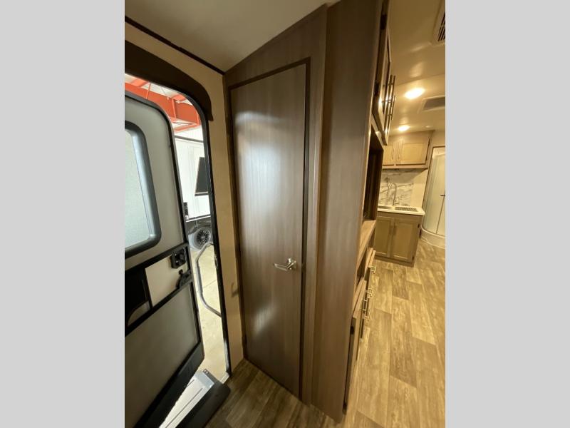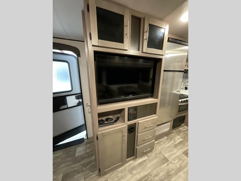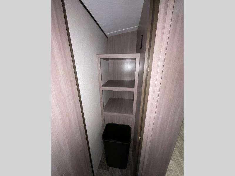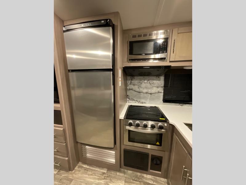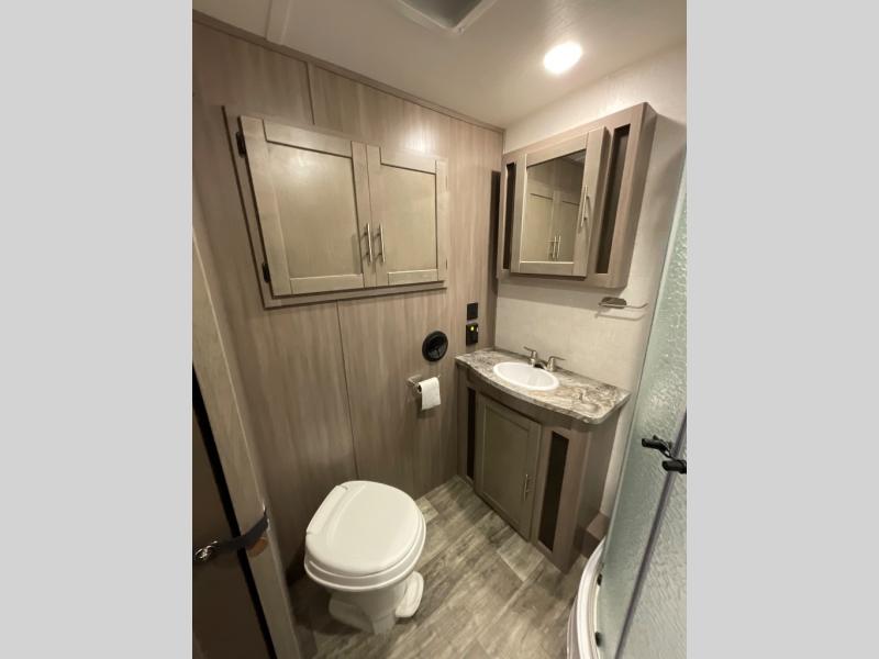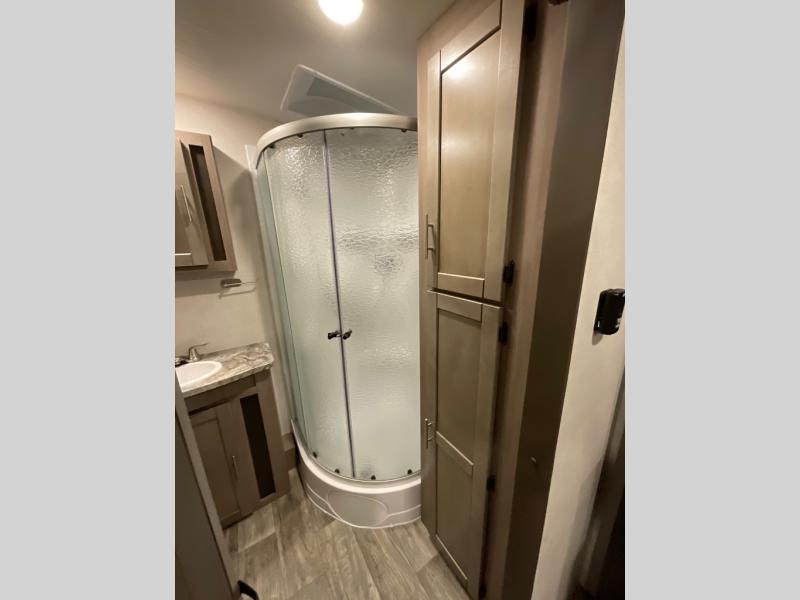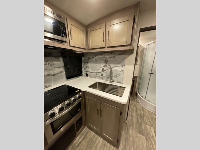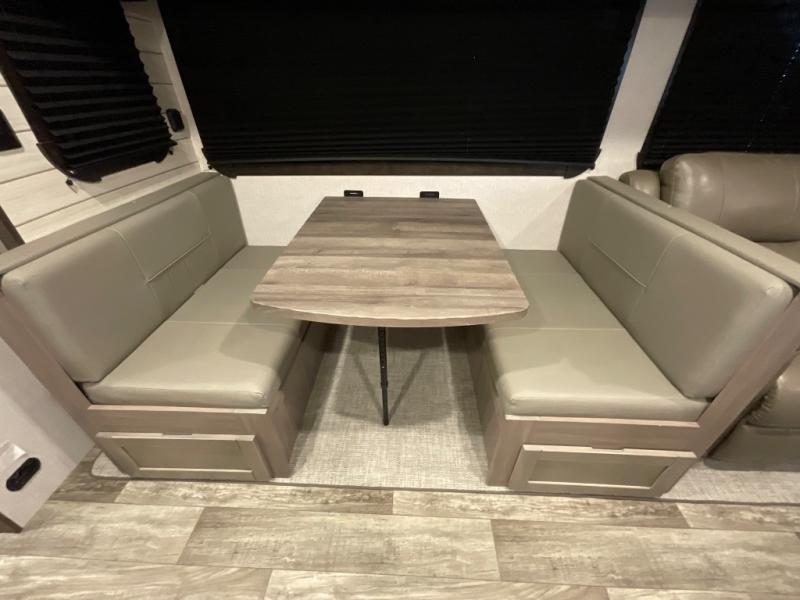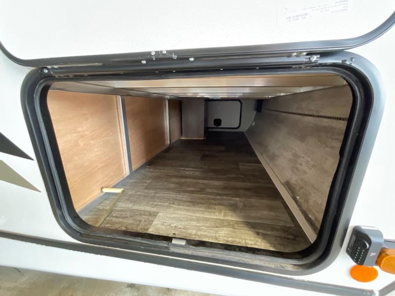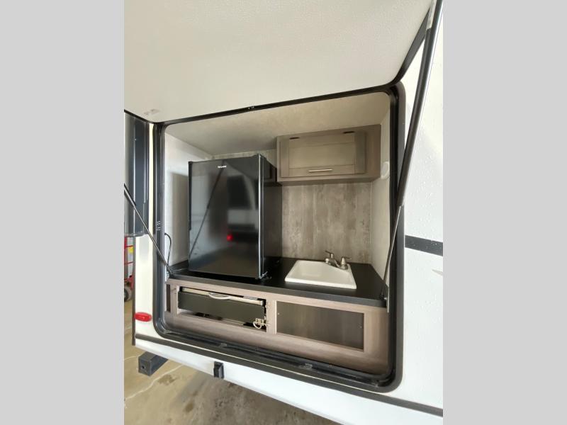 You will love the added interior space you have in this travel trailer thanks to the large slide out in the main living area. Here, you'll enjoy playing cards at the XL booth dinette and relaxing on the tri-fold sofa. Make home-cooked meals on the glass top range or use the exterior camp kitchen. There is even an exterior refrigerator for cold drinks, and the power awning will shade you from the hot summer sun. This model features a full rear bath for added privacy, and the shower skylight will allow natural light in. The front private bedroom includes a king bed, dual wardrobes, plus a shoe storage and pet station for your convenience!