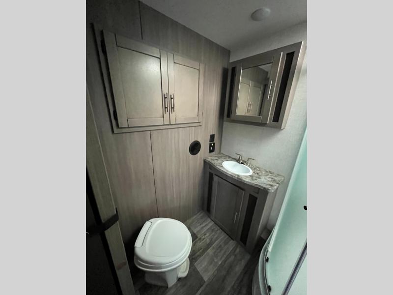 You will love the added interior space you have in this travel trailer thanks to the large slide out in the main living area. Here, you'll enjoy playing cards at the XL booth dinette and relaxing on the tri-fold sofa. Make home-cooked meals on the glass top range or use the exterior camp kitchen. There is even an exterior refrigerator for cold drinks, and the power awning will shade you from the hot summer sun. This model features a full rear bath for added privacy, and the shower skylight will allow natural light in. The front private bedroom includes a king bed, dual wardrobes, plus a shoe storage and pet station for your convenience!