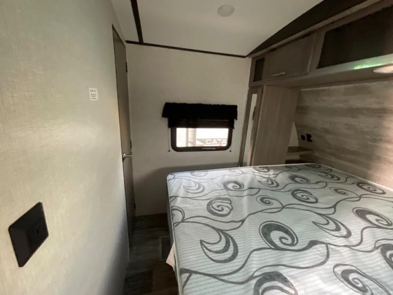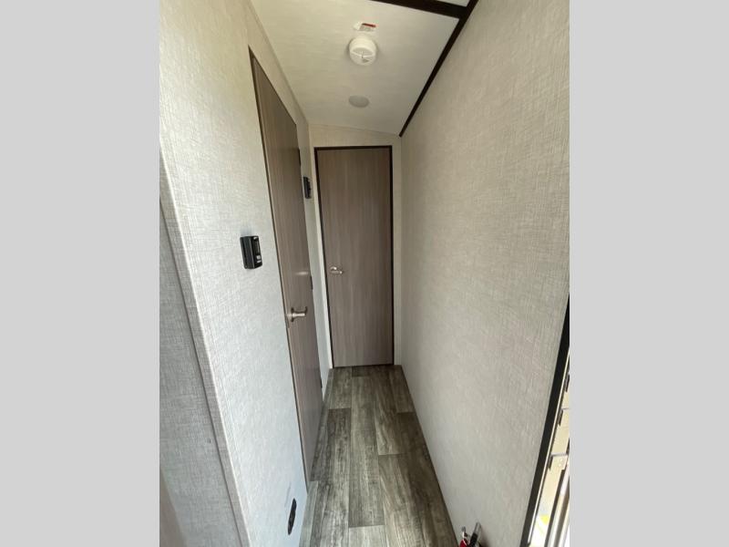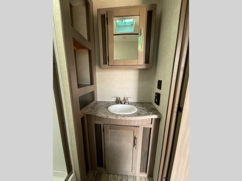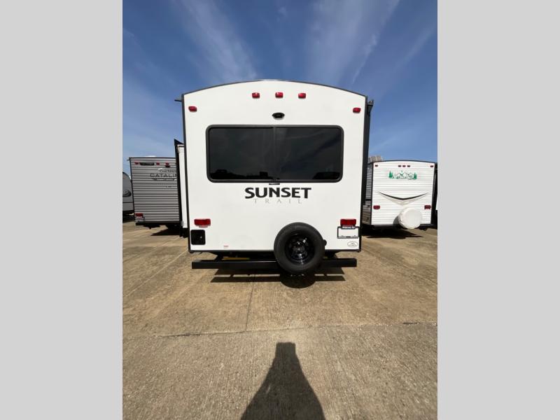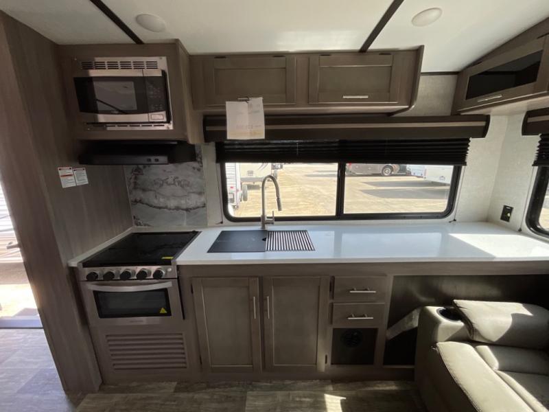 With any Sunset Trail travel trailer by CrossRoads RV, the interior offers a stainless steel farmhouse single bowl sink with a cover, solid surface countertops in the kitchen, a 12 volt refrigerator, USB ports in the bedroom and main area, and a Connexx entertainment TV with soundbar for inside enjoyment. Also included is the Extreme Weather package with maximum insulation with reflective foil, a 30,000 BTU furnace, and a 2" heat duct in the enclosed underbelly for four seasons of traveling. And the Blade Air system offers 20% more airflow and re-engineered components on the A/C. The HyperDeck flooring is water resistant, fiberglass reinforced and has polypropylene layers. Make your lightweight and comfortable RV decision today!