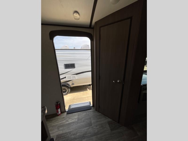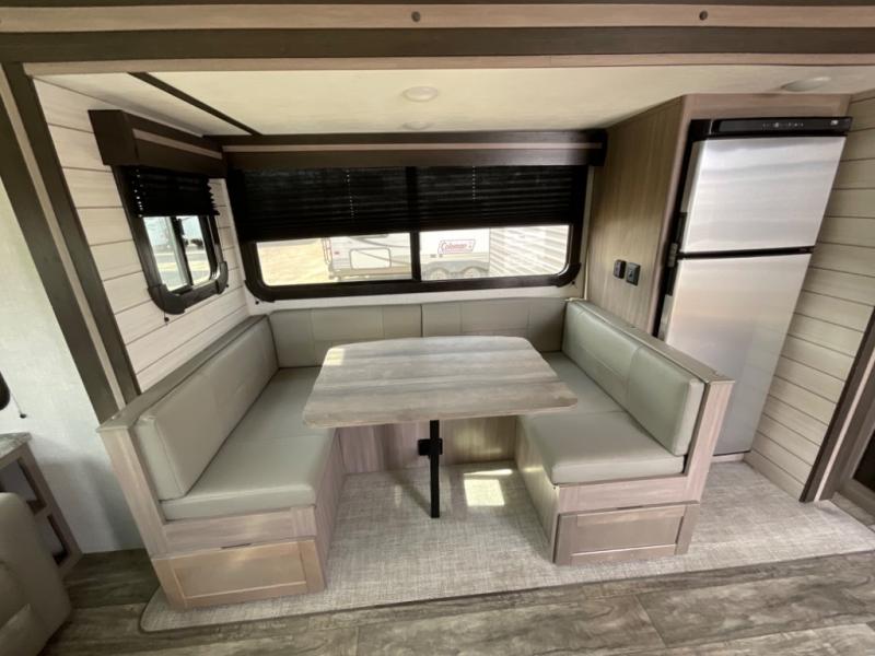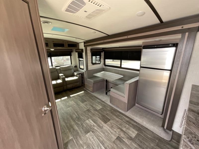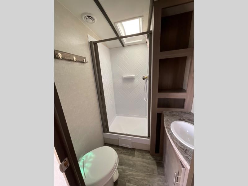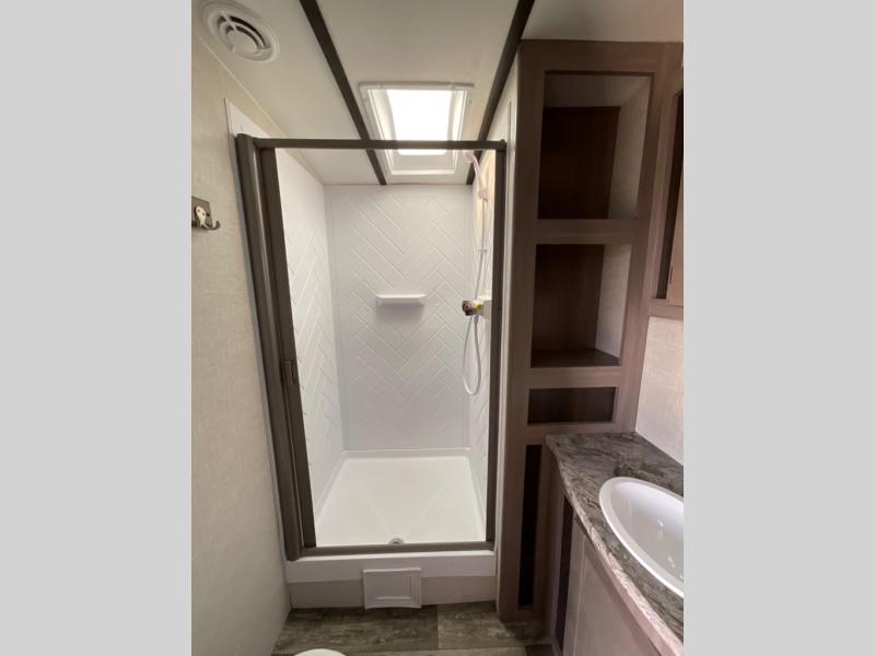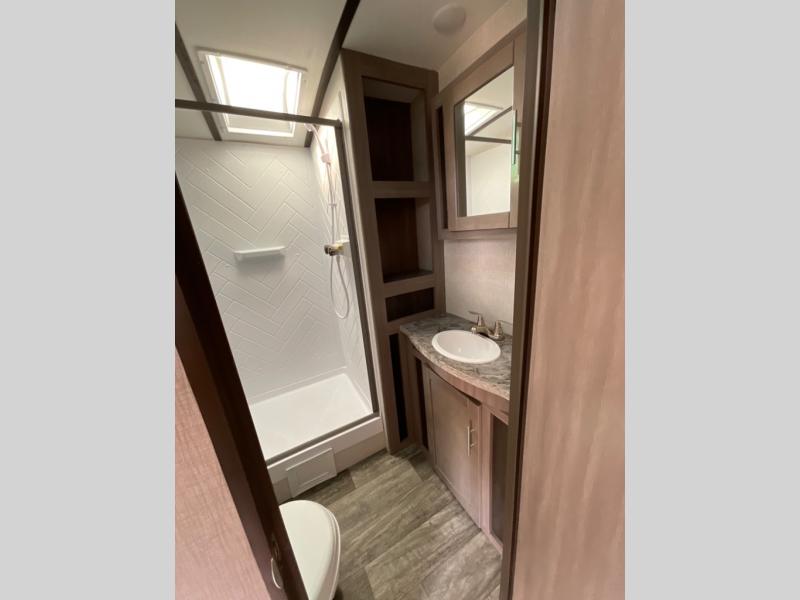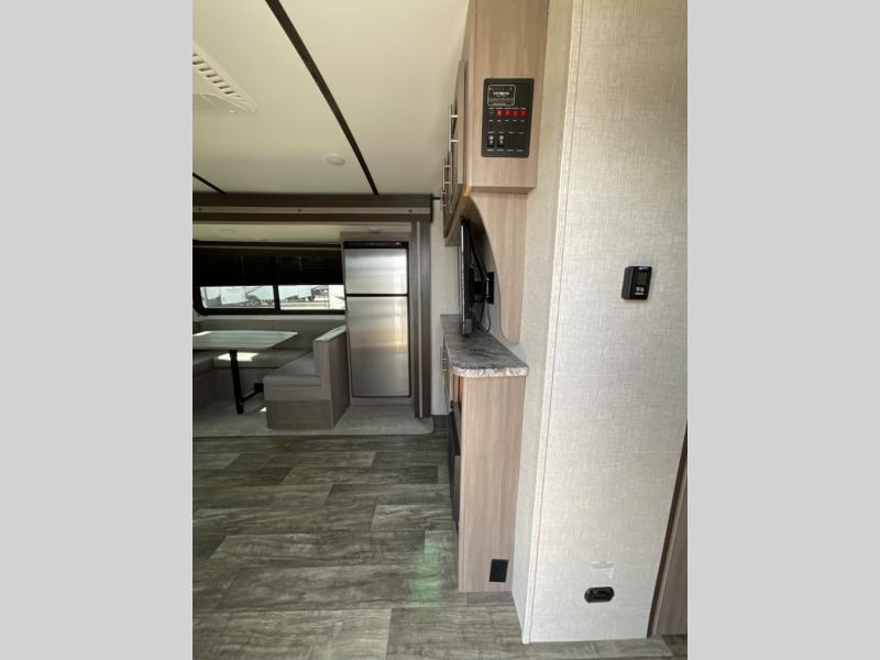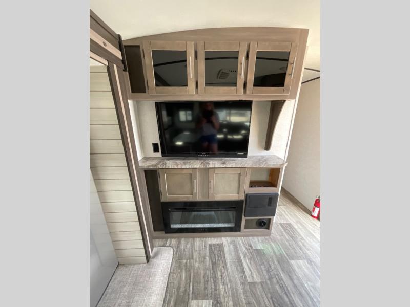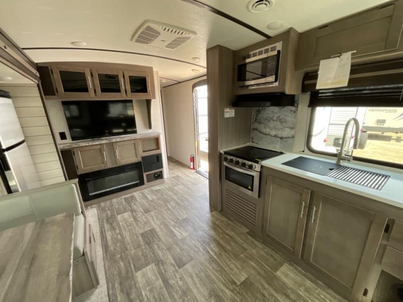 Eat, sleep, relax, and play in this travel trailer that can sleep four people each night. You can dine around the U-shaped dinette and this area can also convert to comfortable sleeping space for the grandkids at night. You will enjoy the 60" theater seating that sits directly across from the entertainment center and fireplace for convenience. The chef of the family can prepare meals on the glass top range or use the stainless steel microwave. This model includes a full bath with a 30" x 36" shower, plus the skylight will provide natural light as you get ready for the day. You will feel right at home in the front private bedroom that includes wardrobes on either side of the king bed, a closet with a wardrobe, plus a pet station for Fluffy!
