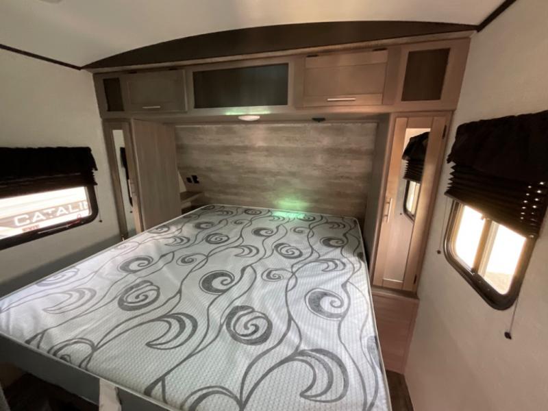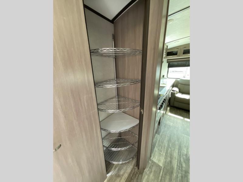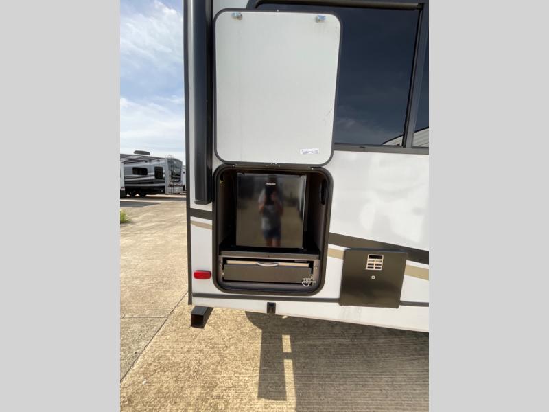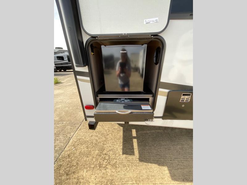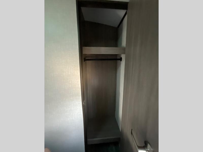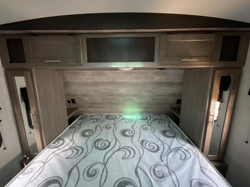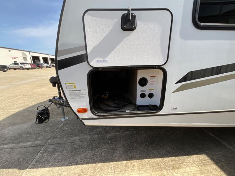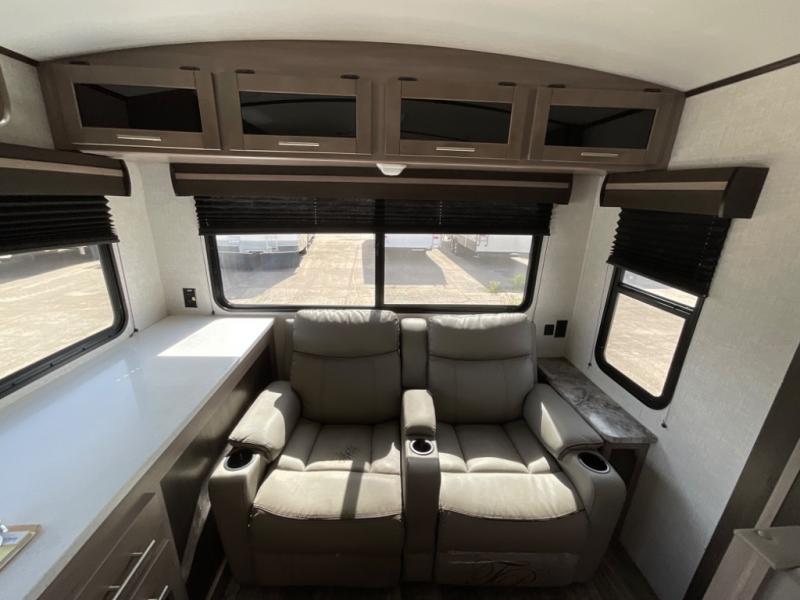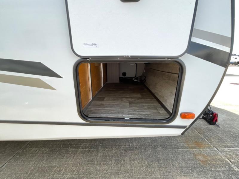 Eat, sleep, relax, and play in this travel trailer that can sleep four people each night. You can dine around the U-shaped dinette and this area can also convert to comfortable sleeping space for the grandkids at night. You will enjoy the 60" theater seating that sits directly across from the entertainment center and fireplace for convenience. The chef of the family can prepare meals on the glass top range or use the stainless steel microwave. This model includes a full bath with a 30" x 36" shower, plus the skylight will provide natural light as you get ready for the day. You will feel right at home in the front private bedroom that includes wardrobes on either side of the king bed, a closet with a wardrobe, plus a pet station for Fluffy!