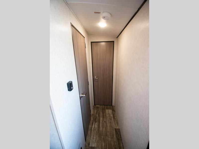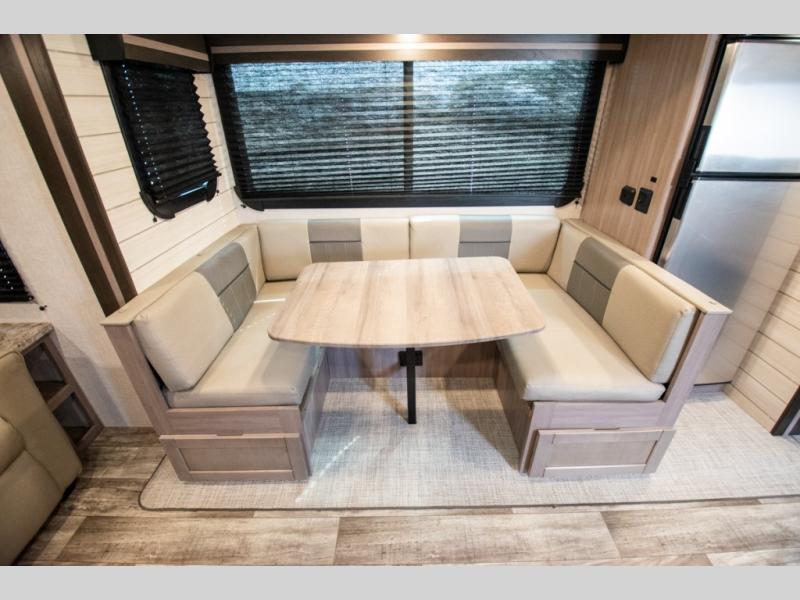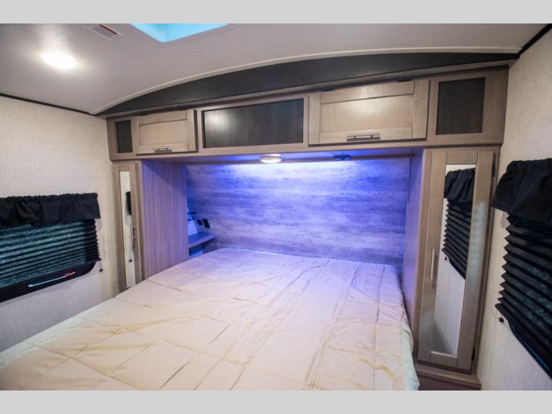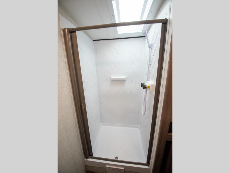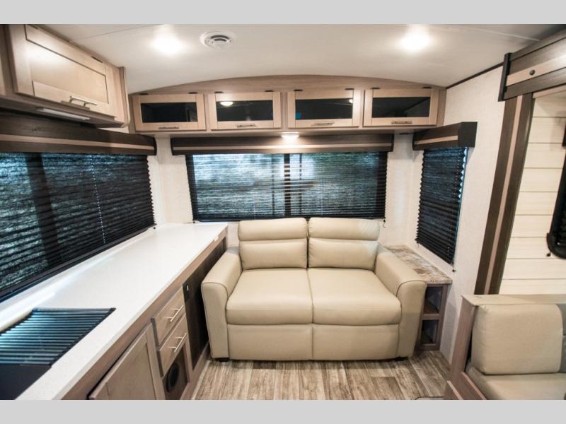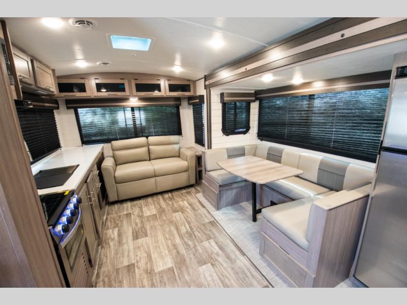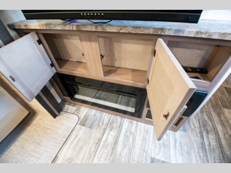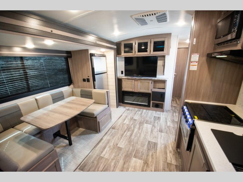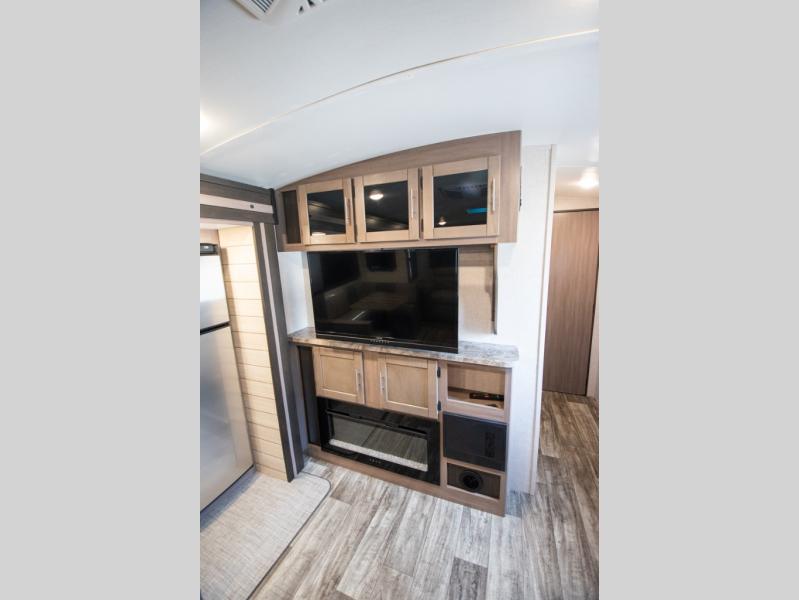 Eat, sleep, relax, and play in this travel trailer that can sleep four people each night. You can dine around the U-shaped dinette and this area can also convert to comfortable sleeping space for the grandkids at night. You will enjoy the 60" theater seating that sits directly across from the entertainment center and fireplace for convenience. The chef of the family can prepare meals on the glass top range or use the stainless steel microwave. This model includes a full bath with a 30" x 36" shower, plus the skylight will provide natural light as you get ready for the day. You will feel right at home in the front private bedroom that includes wardrobes on either side of the king bed, a closet with a wardrobe, plus a pet station for Fluffy!