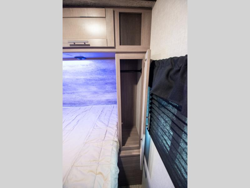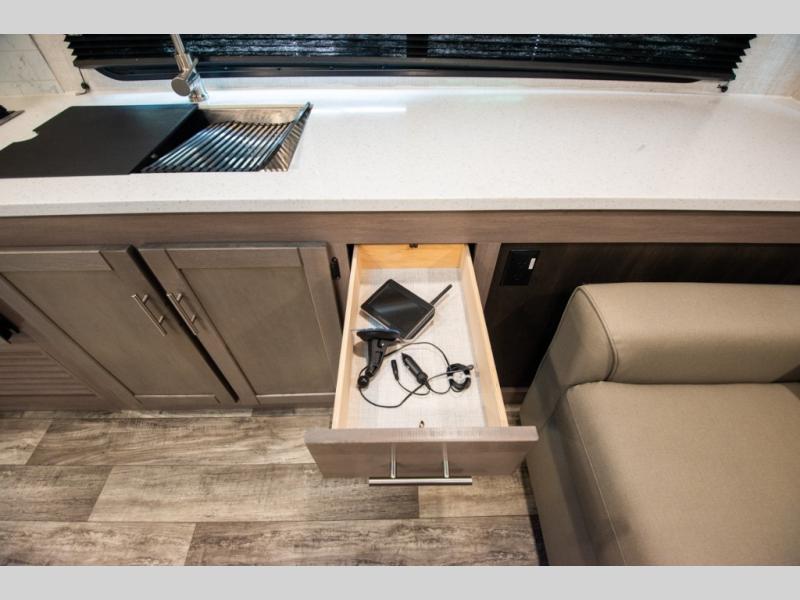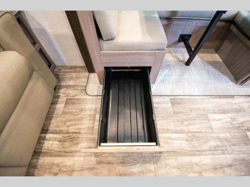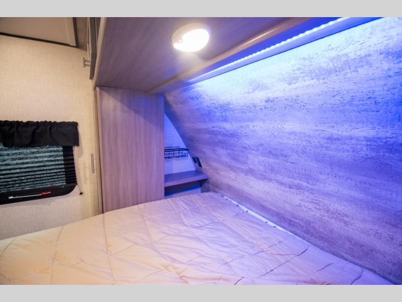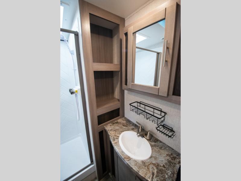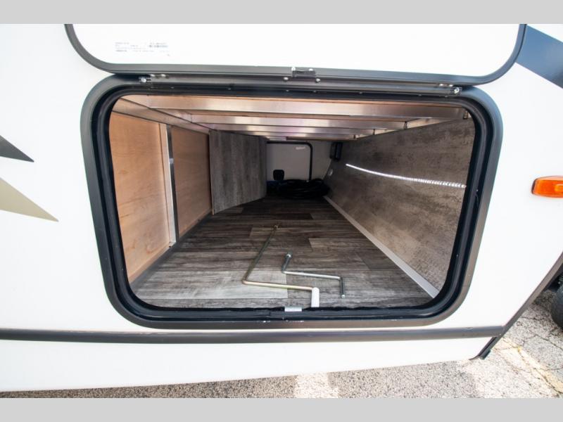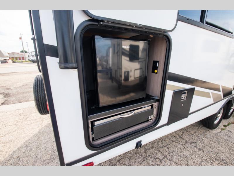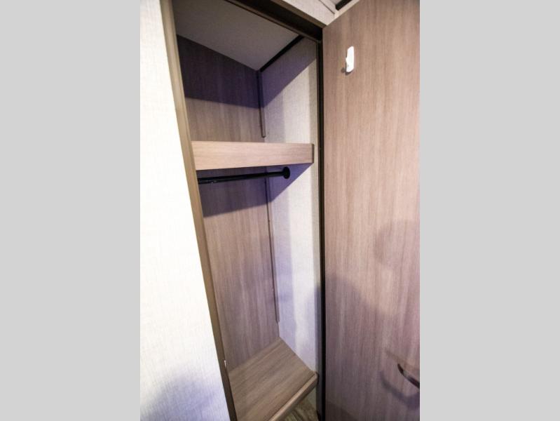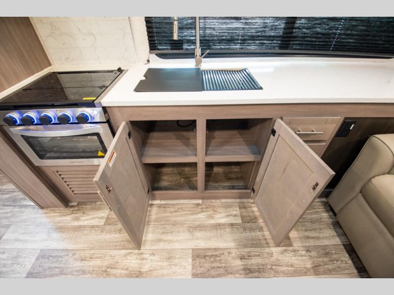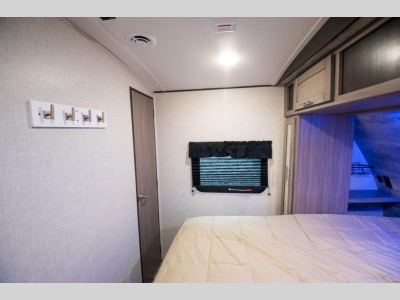 Eat, sleep, relax, and play in this travel trailer that can sleep four people each night. You can dine around the U-shaped dinette and this area can also convert to comfortable sleeping space for the grandkids at night. You will enjoy the 60" theater seating that sits directly across from the entertainment center and fireplace for convenience. The chef of the family can prepare meals on the glass top range or use the stainless steel microwave. This model includes a full bath with a 30" x 36" shower, plus the skylight will provide natural light as you get ready for the day. You will feel right at home in the front private bedroom that includes wardrobes on either side of the king bed, a closet with a wardrobe, plus a pet station for Fluffy!