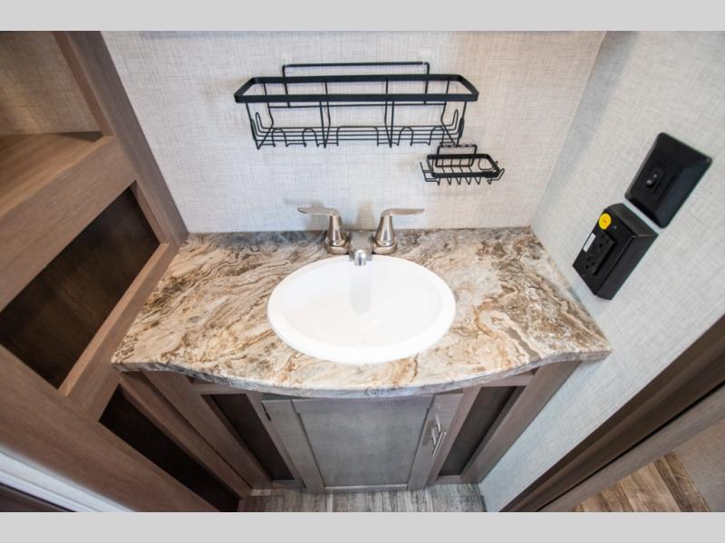 With any Sunset Trail travel trailer by CrossRoads RV, the interior offers a stainless steel farmhouse single bowl sink with a cover, solid surface countertops in the kitchen, a 12 volt refrigerator, USB ports in the bedroom and main area, and a Connexx entertainment TV with soundbar for inside enjoyment. Also included is the Extreme Weather package with maximum insulation with reflective foil, a 30,000 BTU furnace, and a 2" heat duct in the enclosed underbelly for four seasons of traveling. And the Blade Air system offers 20% more airflow and re-engineered components on the A/C. The HyperDeck flooring is water resistant, fiberglass reinforced and has polypropylene layers. Make your lightweight and comfortable RV decision today!
