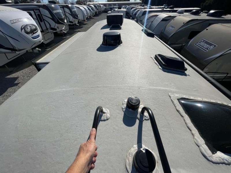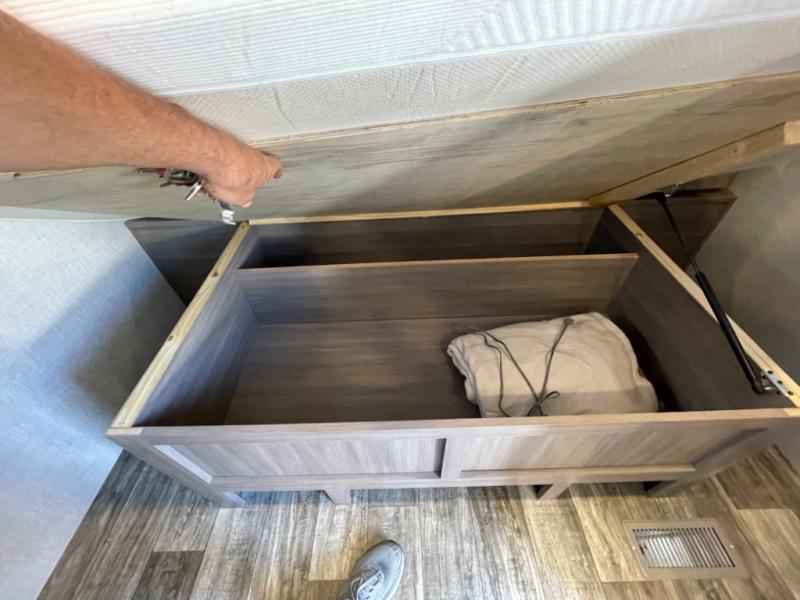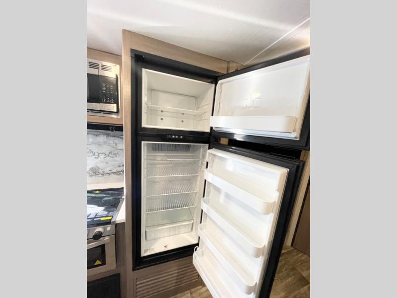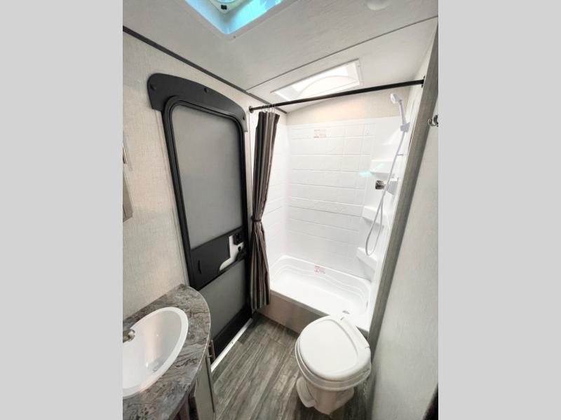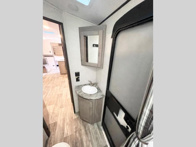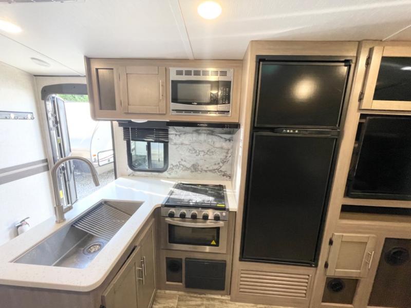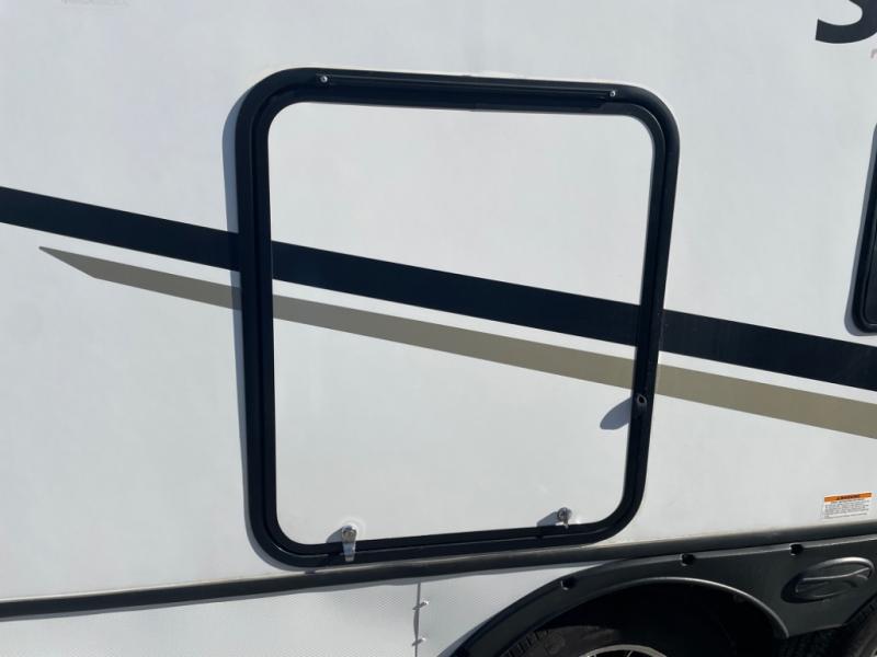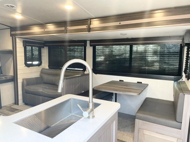 With any Sunset Trail travel trailer by CrossRoads RV, the interior offers a stainless steel farmhouse single bowl sink with a cover, solid surface countertops in the kitchen, a 12 volt refrigerator, USB ports in the bedroom and main area, and a Connexx entertainment TV with soundbar for inside enjoyment. Also included is the Extreme Weather package with maximum insulation with reflective foil, a 30,000 BTU furnace, and a 2" heat duct in the enclosed underbelly for four seasons of traveling. And the Blade Air system offers 20% more airflow and re-engineered components on the A/C. The HyperDeck flooring is water resistant, fiberglass reinforced and has polypropylene layers. Make your lightweight and comfortable RV decision today!