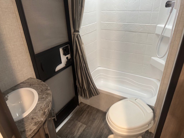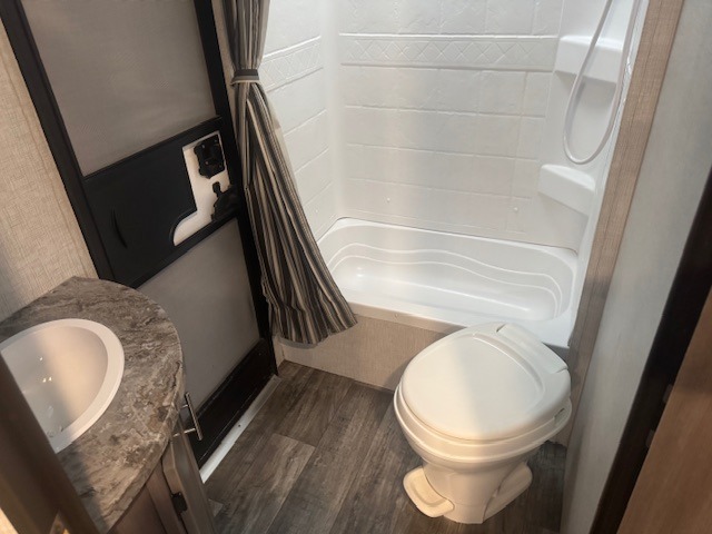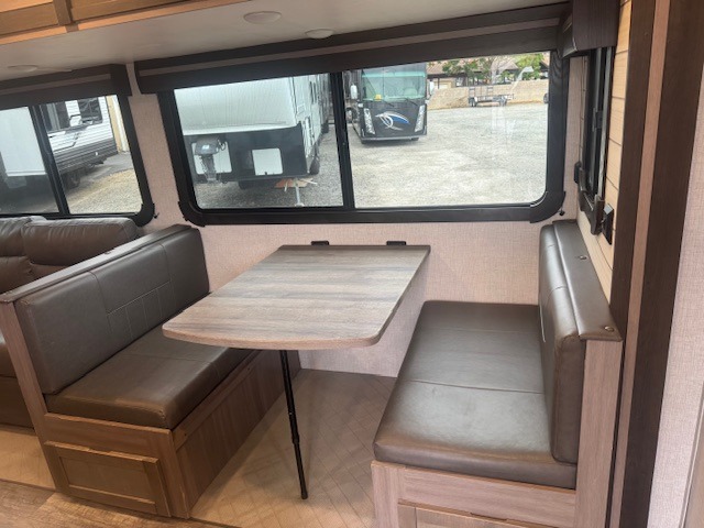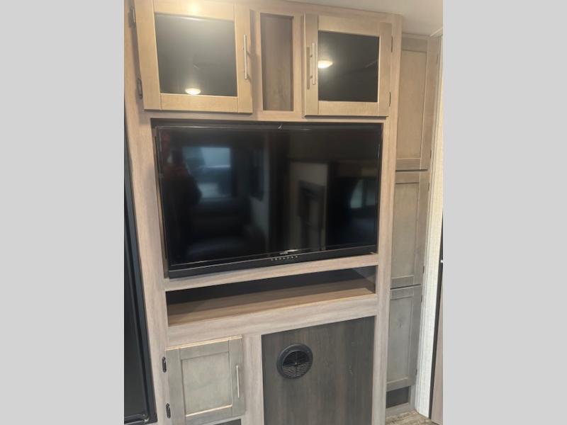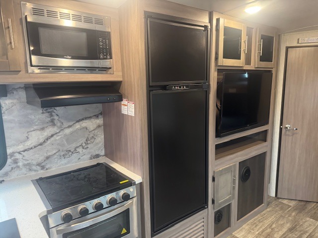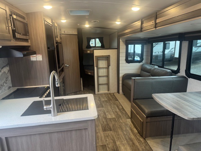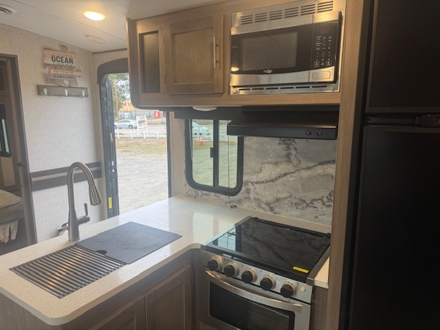 With any Sunset Trail travel trailer by CrossRoads RV, the interior offers a stainless steel farmhouse single bowl sink with a cover, solid surface countertops in the kitchen, a 12 volt refrigerator, USB ports in the bedroom and main area, and a Connexx entertainment TV with soundbar for inside enjoyment. Also included is the Extreme Weather package with maximum insulation with reflective foil, a 30,000 BTU furnace, and a 2" heat duct in the enclosed underbelly for four seasons of traveling. And the Blade Air system offers 20% more airflow and re-engineered components on the A/C. The HyperDeck flooring is water resistant, fiberglass reinforced and has polypropylene layers. Make your lightweight and comfortable RV decision today!