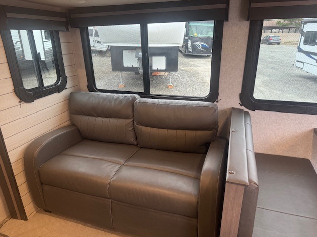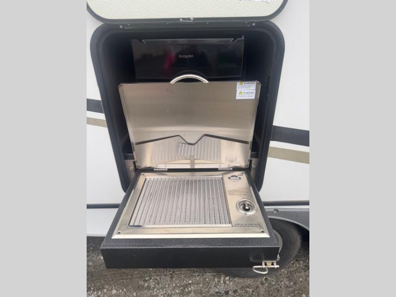 This travel trailer can comfortably sleep ten people each night, so invite the cousins for whole-family fun! The kids are sure to love the double-size bunks, and the owners will have their own private bedroom up front with a king bed. Within the large slide out you'll find the XL booth dinette which can sleep two, plus the tri-fold sofa that can be replaced by an optional theater seating if you choose. Whip up dinner in a flash on the glass top range or use the exterior camp kitchen. The full bath includes its own exterior entrance door for convenience, and there is a power awning with LED lights for the perfect outdoor living space!