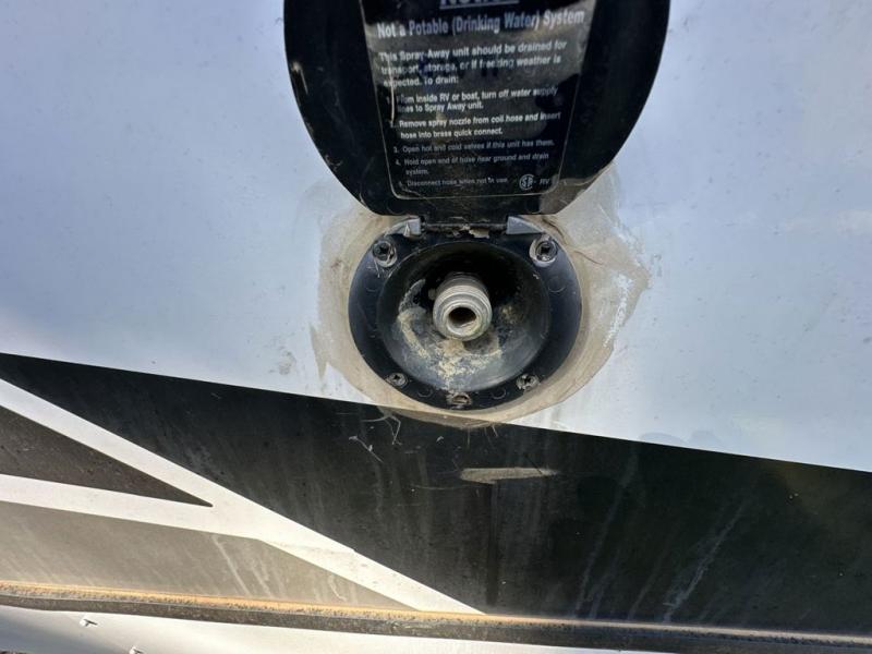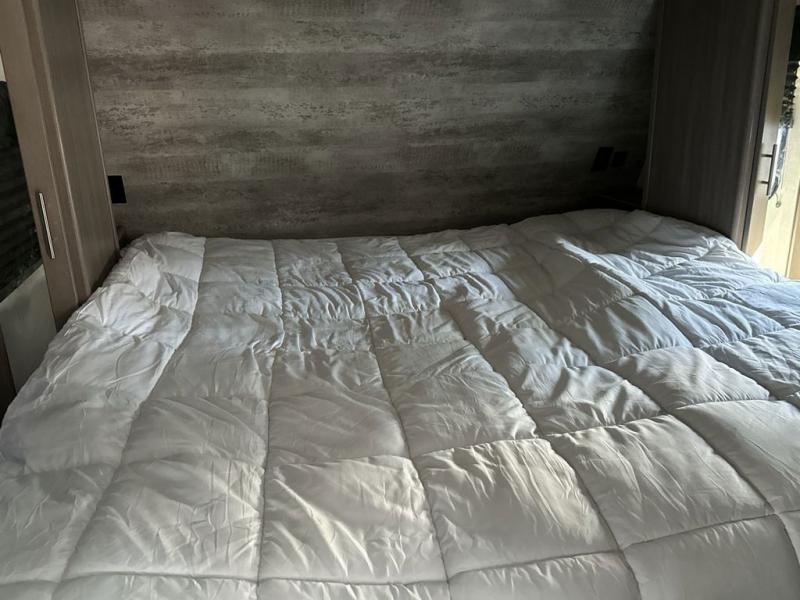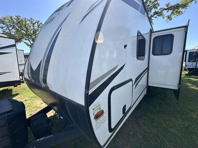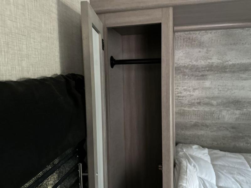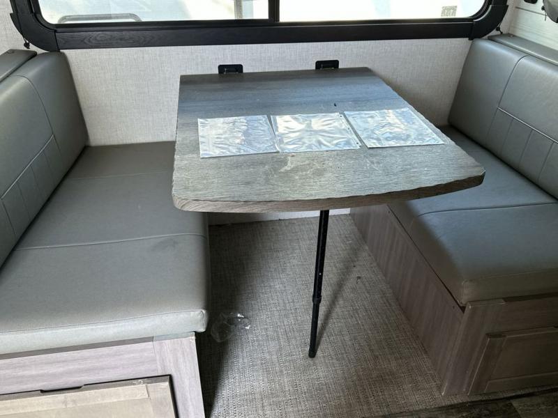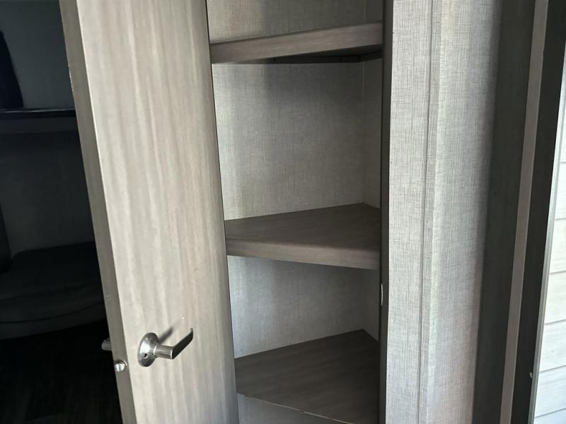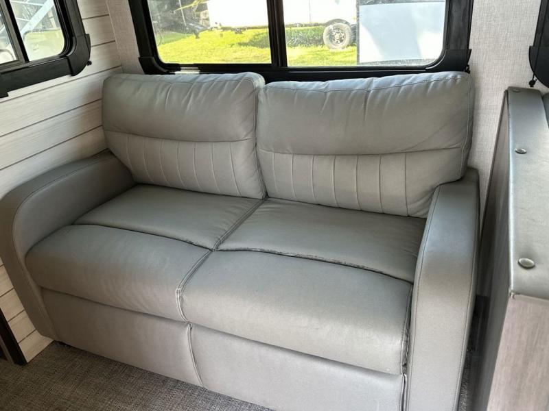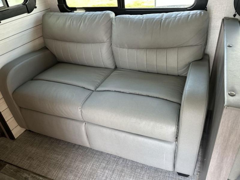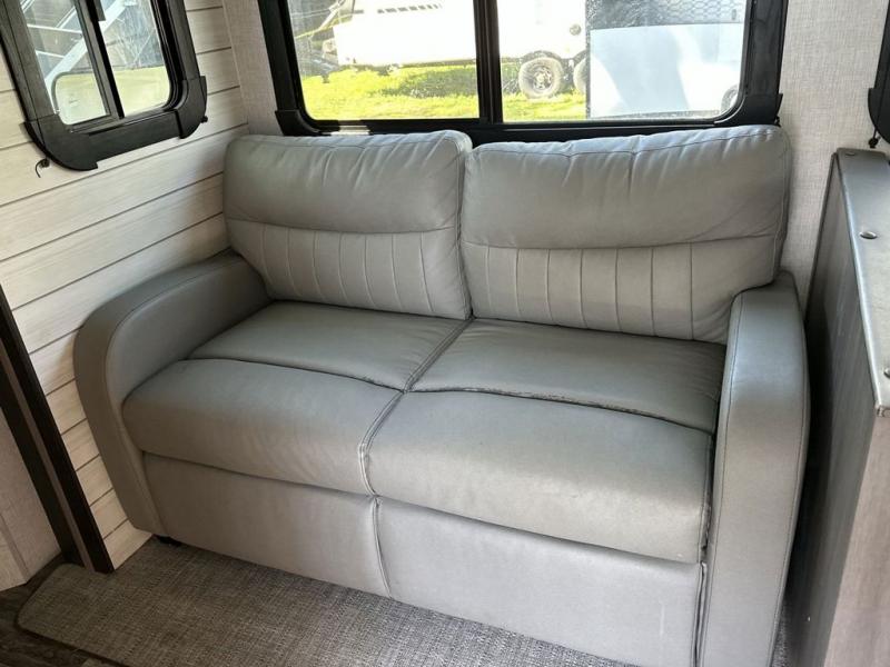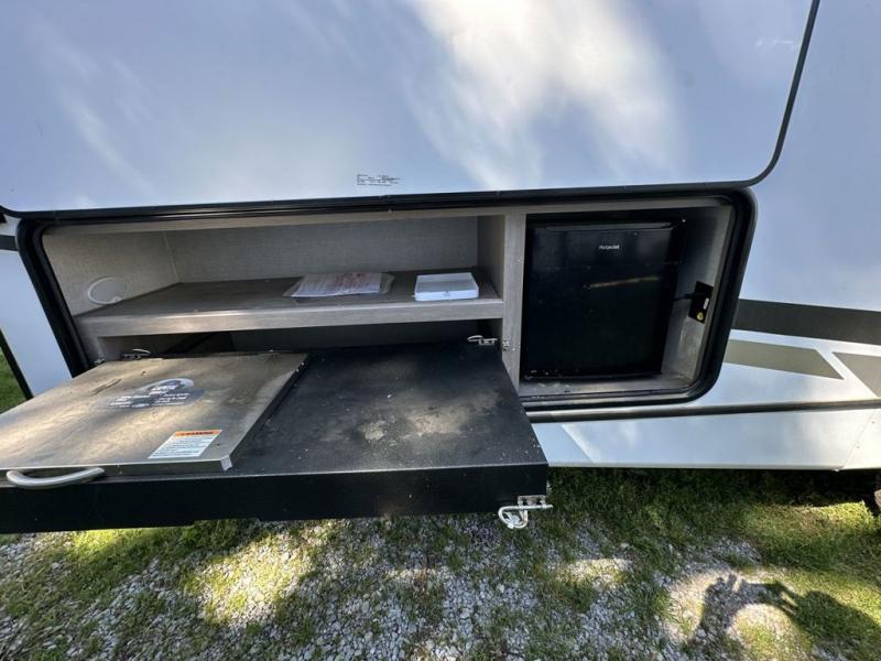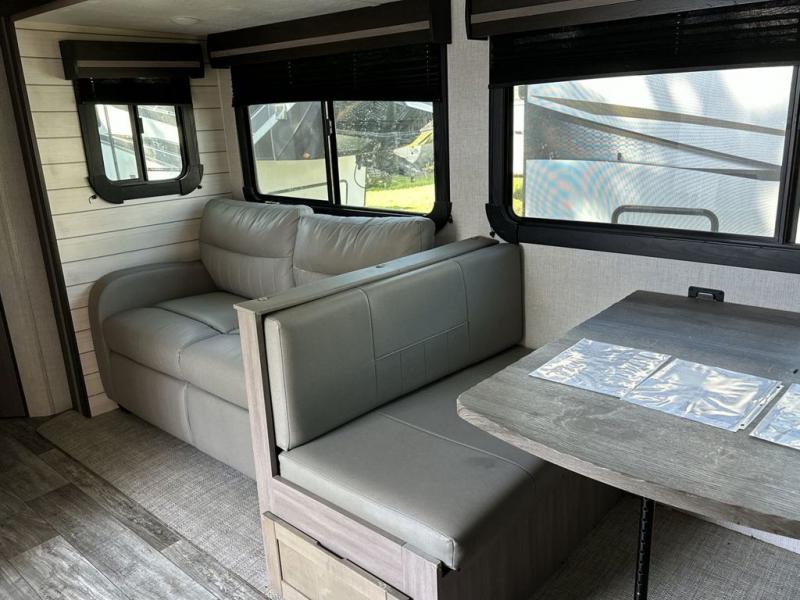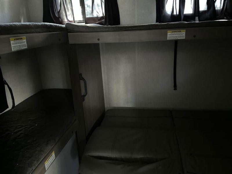 Everyone will have a great time camping in this travel trailer! From the rear private bunkhouse with a 60" fold-up sofa below a 28" x 64" flip-up bunk, a set of 28" x 74" bunk beds, and a wardrobe to the outside kitchen which even has a refrigerator to keep your beverage cold while you cook. There is a front private bedroom with a king bed that has wardrobes on either side and an overhead cabinet above it to store your items. The kids can even bring a friend or two along to sleep on the 80" x 42" XL booth dinette and the tri-fold sofa. The full bathroom has a 30" x 36" shower and a linen closet so everyone can stay squeaky clean!