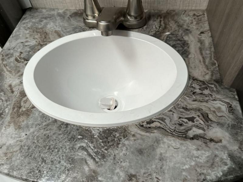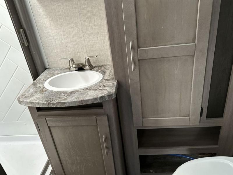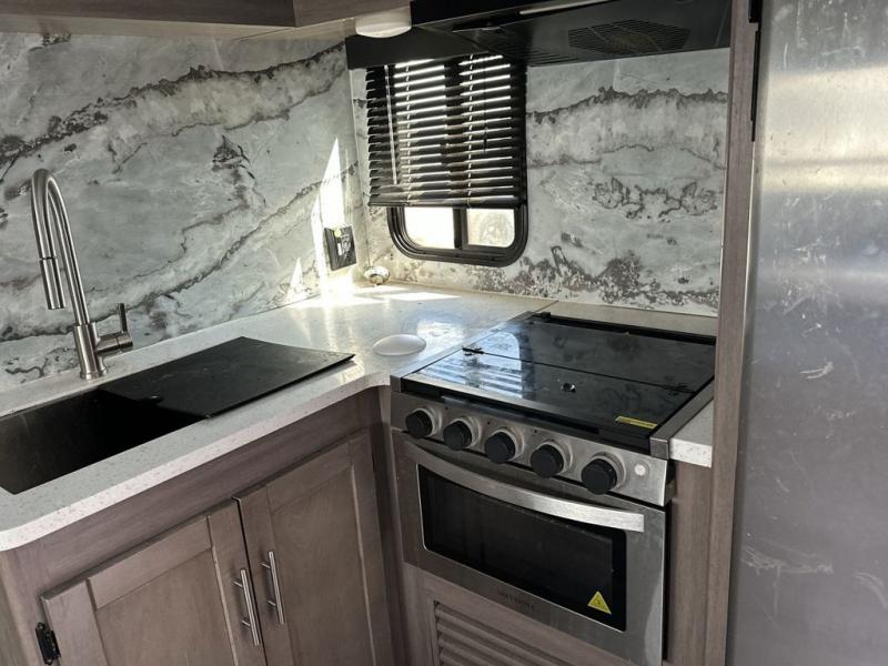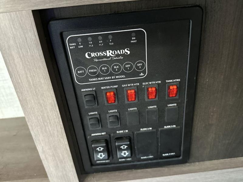 With any Sunset Trail travel trailer by CrossRoads RV, the interior offers a stainless steel farmhouse single bowl sink with a cover, solid surface countertops in the kitchen, a 12 volt refrigerator, USB ports in the bedroom and main area, and a Connexx entertainment TV with soundbar for inside enjoyment. Also included is the Extreme Weather package with maximum insulation with reflective foil, a 30,000 BTU furnace, and a 2" heat duct in the enclosed underbelly for four seasons of traveling. And the Blade Air system offers 20% more airflow and re-engineered components on the A/C. The HyperDeck flooring is water resistant, fiberglass reinforced and has polypropylene layers. Make your lightweight and comfortable RV decision today!