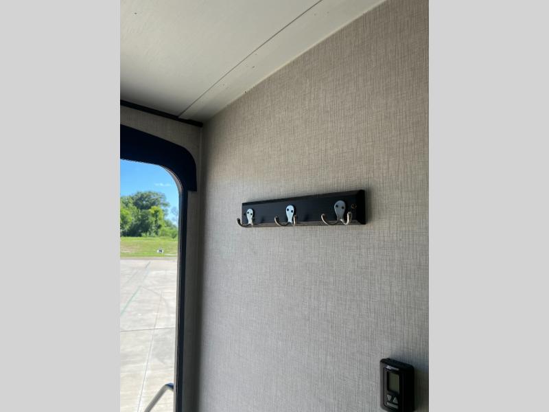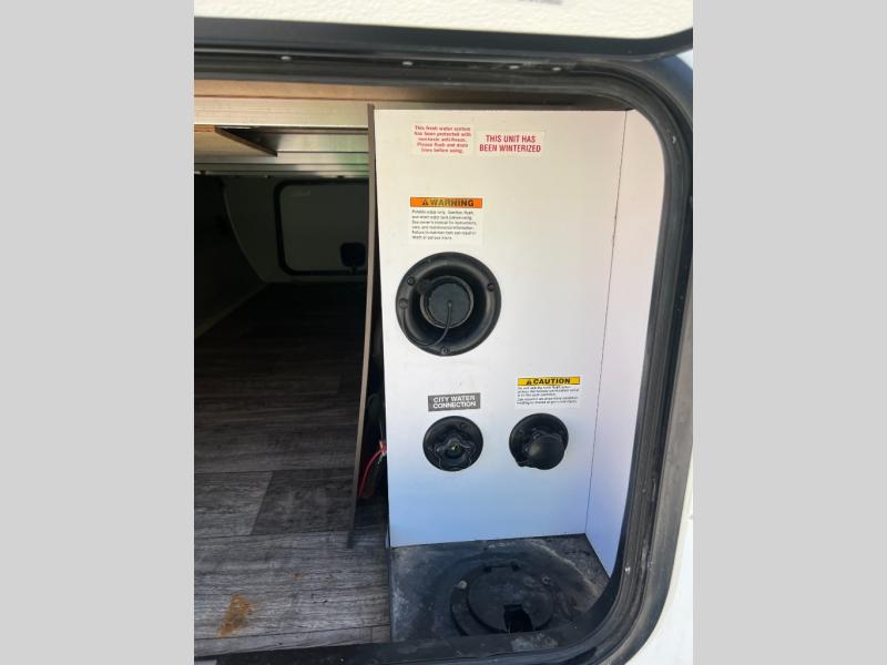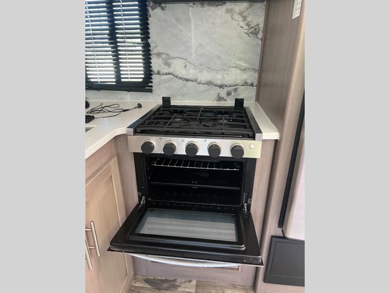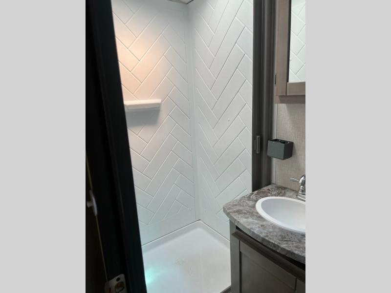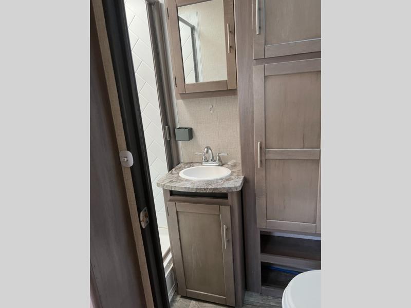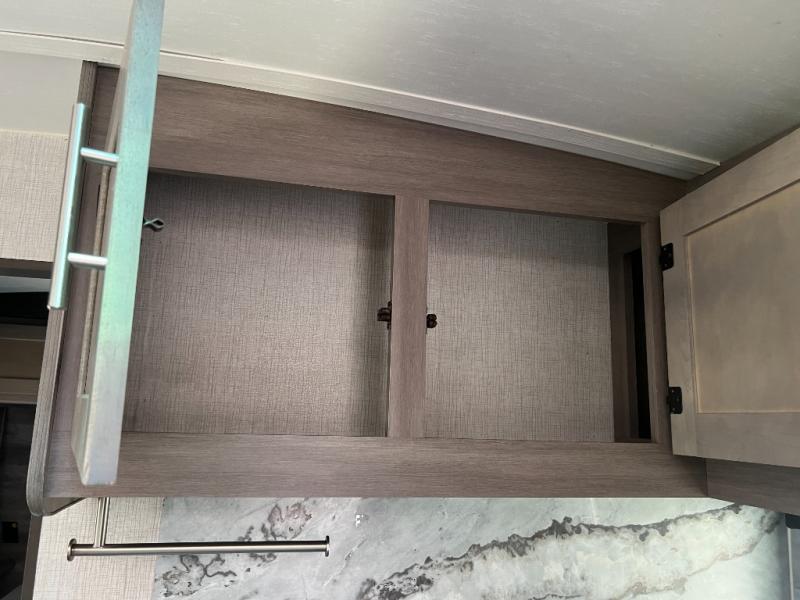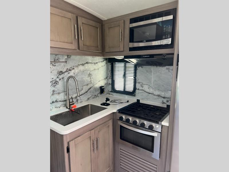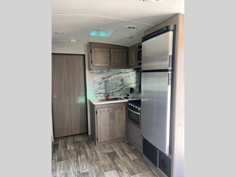 With any Sunset Trail travel trailer by CrossRoads RV, the interior offers a stainless steel farmhouse single bowl sink with a cover, solid surface countertops in the kitchen, a 12 volt refrigerator, USB ports in the bedroom and main area, and a Connexx entertainment TV with soundbar for inside enjoyment. Also included is the Extreme Weather package with maximum insulation with reflective foil, a 30,000 BTU furnace, and a 2" heat duct in the enclosed underbelly for four seasons of traveling. And the Blade Air system offers 20% more airflow and re-engineered components on the A/C. The HyperDeck flooring is water resistant, fiberglass reinforced and has polypropylene layers. Make your lightweight and comfortable RV decision today!
