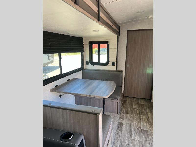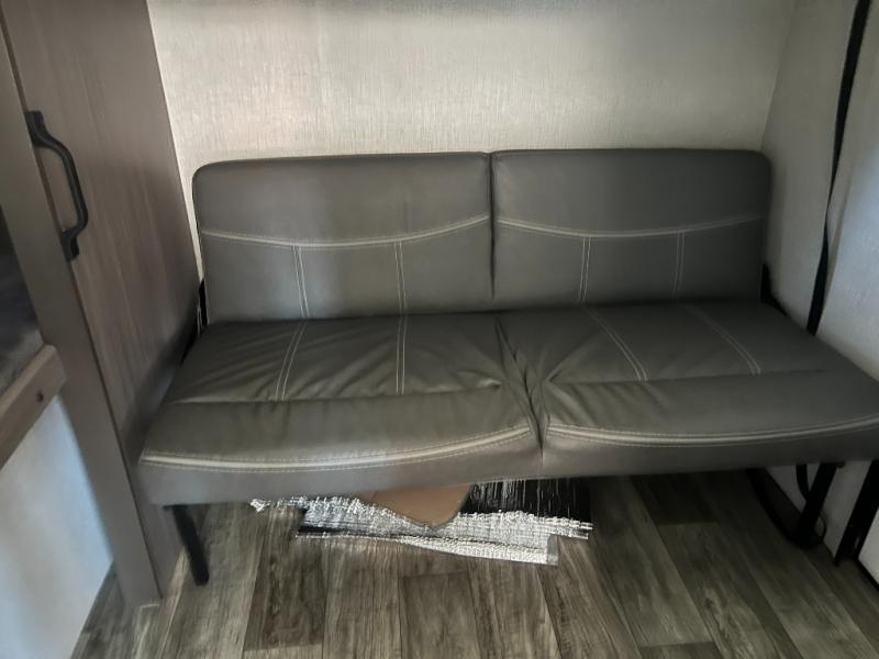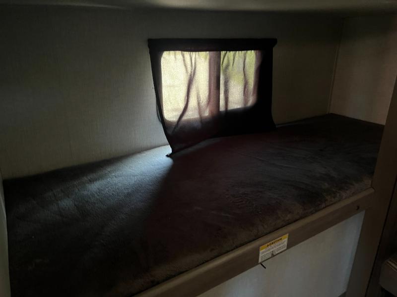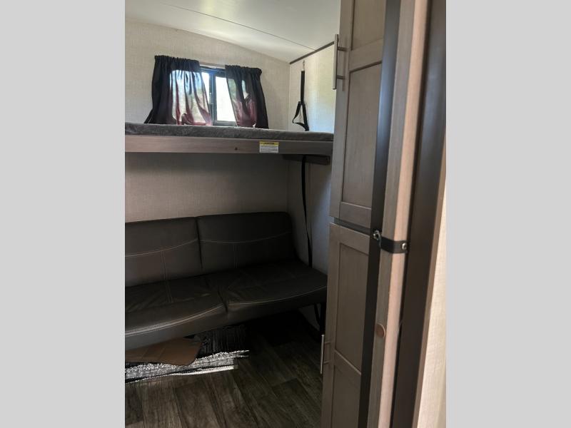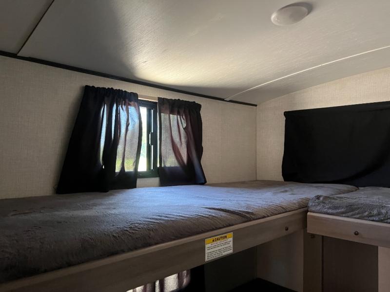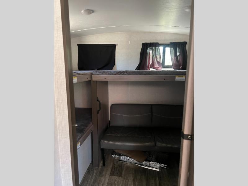 Everyone will have a great time camping in this travel trailer! From the rear private bunkhouse with a 60" fold-up sofa below a 28" x 64" flip-up bunk, a set of 28" x 74" bunk beds, and a wardrobe to the outside kitchen which even has a refrigerator to keep your beverage cold while you cook. There is a front private bedroom with a king bed that has wardrobes on either side and an overhead cabinet above it to store your items. The kids can even bring a friend or two along to sleep on the 80" x 42" XL booth dinette and the tri-fold sofa. The full bathroom has a 30" x 36" shower and a linen closet so everyone can stay squeaky clean!
