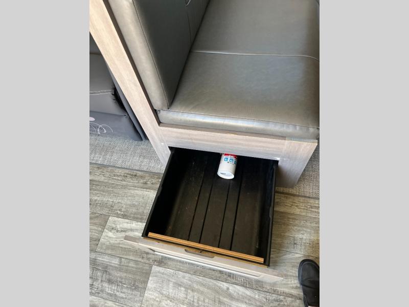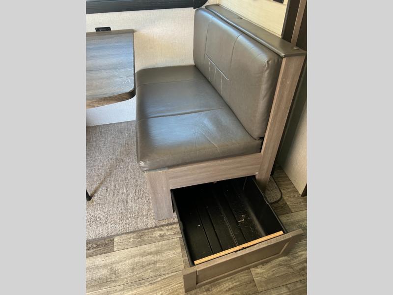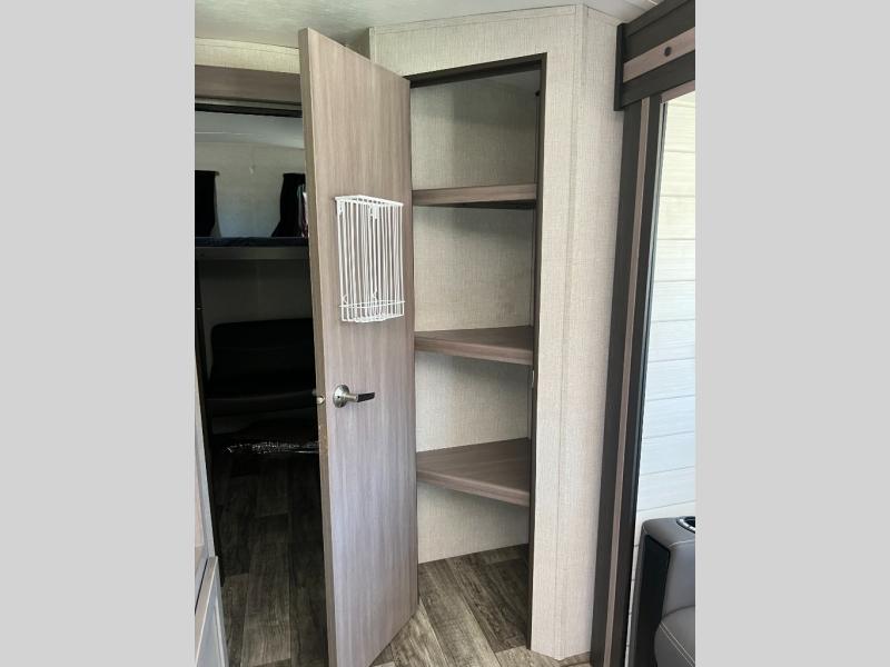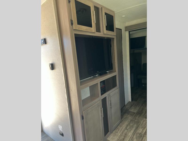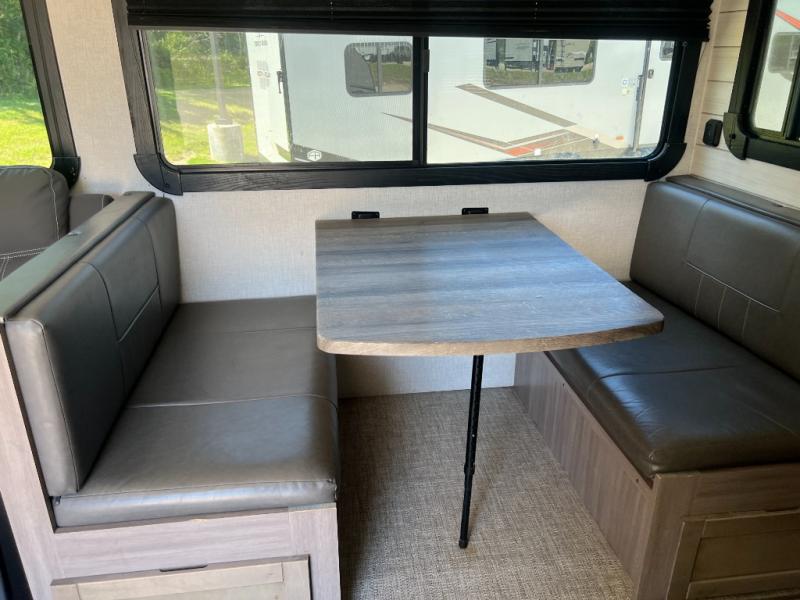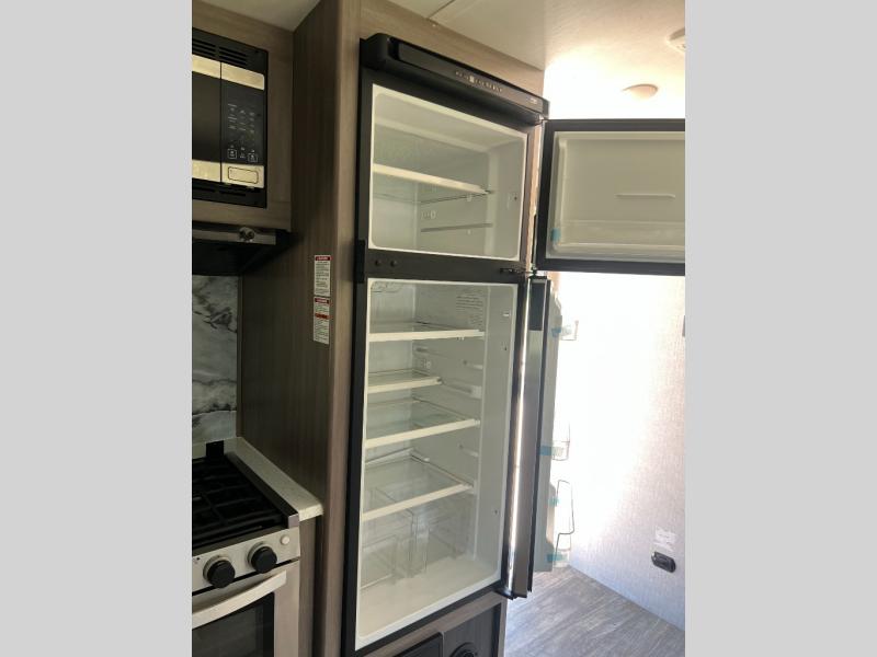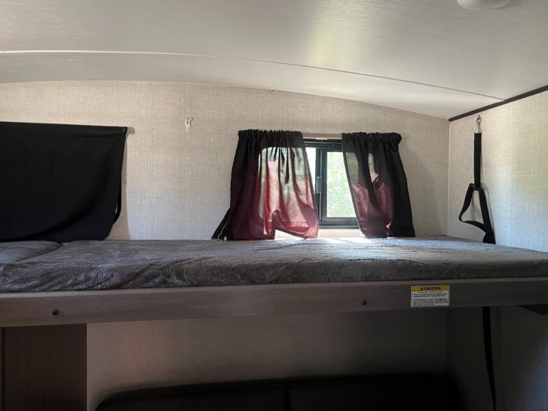 Everyone will have a great time camping in this travel trailer! From the rear private bunkhouse with a 60" fold-up sofa below a 28" x 64" flip-up bunk, a set of 28" x 74" bunk beds, and a wardrobe to the outside kitchen which even has a refrigerator to keep your beverage cold while you cook. There is a front private bedroom with a king bed that has wardrobes on either side and an overhead cabinet above it to store your items. The kids can even bring a friend or two along to sleep on the 80" x 42" XL booth dinette and the tri-fold sofa. The full bathroom has a 30" x 36" shower and a linen closet so everyone can stay squeaky clean!