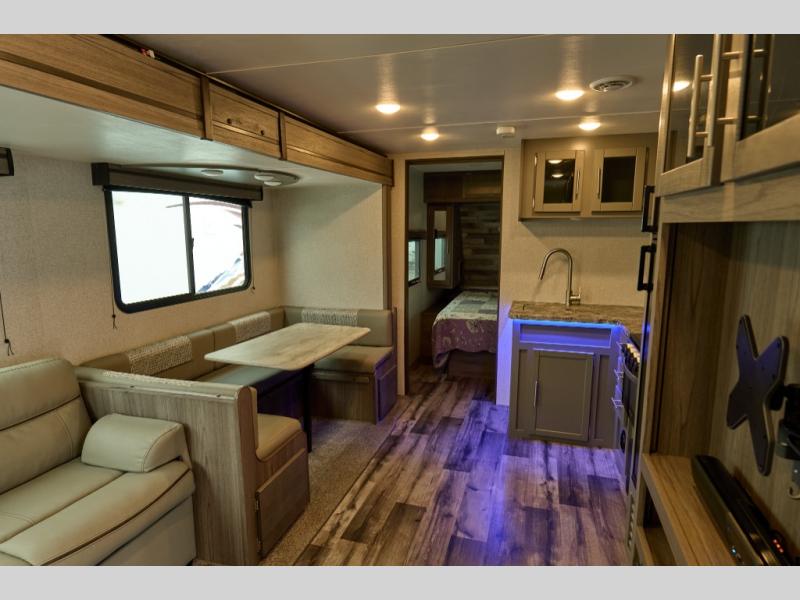 Nothing says fun like camping with your whole family or a larger group. This travel trailer lets you do just that since it can sleep ten people. Your guests will claim the double-size bunks as their own, and you and your spouse will appreciate their own private bedroom up front. You'll find additional sleeping space within the large slide out on the tri-fold sofa and U-shaped dinette. This model includes plenty of storage space, including a large pantry, overhead compartments, plus a medicine cabinet in the bathroom. Whether you're taking a rest on the king bed, relaxing in front of the fireplace, or sitting under the power awning with LED lights, you will fall in love with this travel trailer!