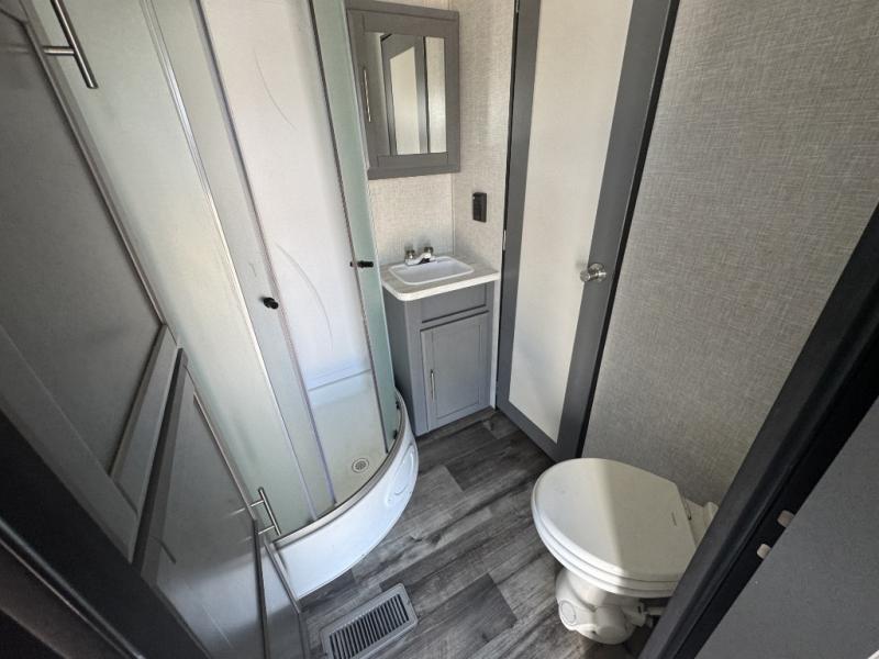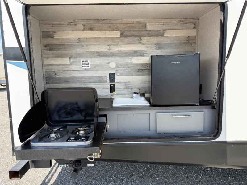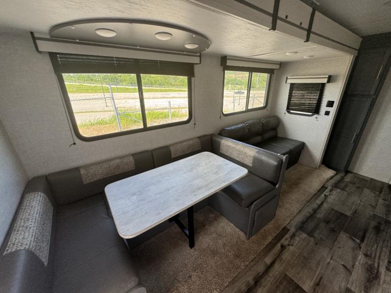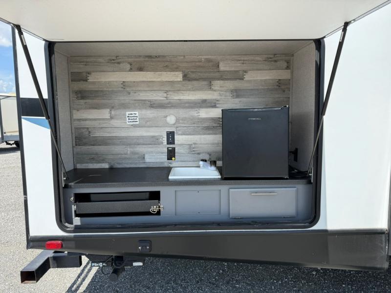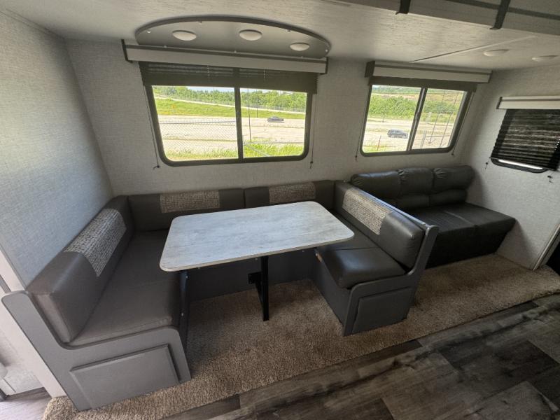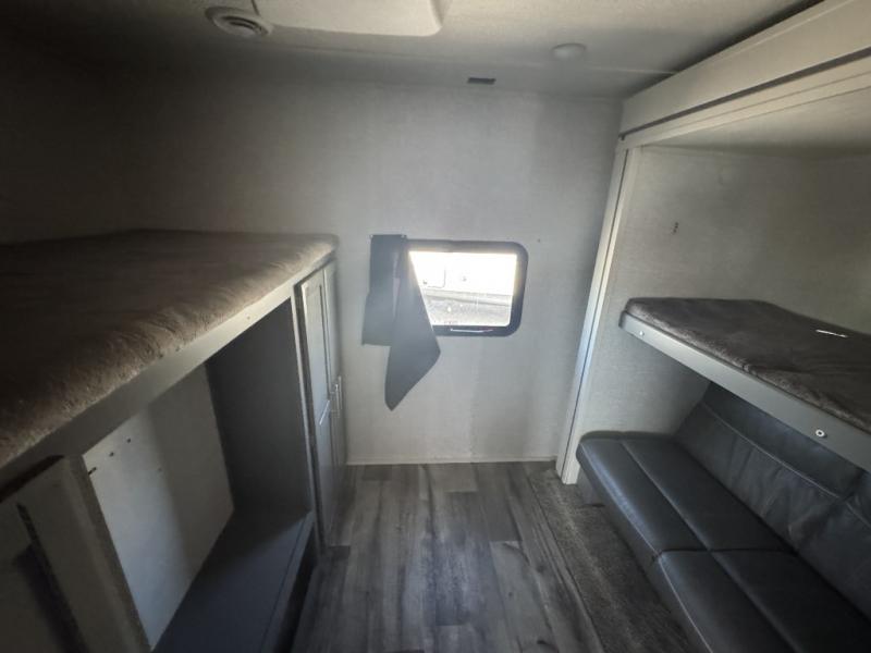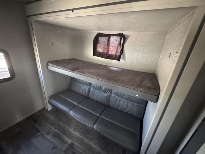 A front master bedroom for you and your spouse, plus a rear private bunkhouse with a half bath make this travel trailer perfect for a large group. Within the large slide out you'll find a U-shaped dinette and a tri-fold sofa, and there is a second slide out in the bunkhouse for added space. The chef of the family can choose to cook indoors or outdoors on the outside kitchen, and the power awning with LED lights will create an inviting space. This model also includes plenty of storage, including two pantries, dual shirt closets in the master bedroom, plus overhead compartments throughout!