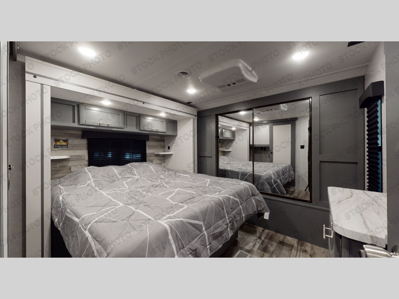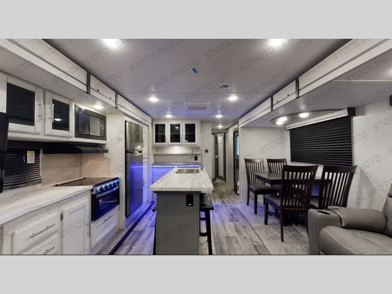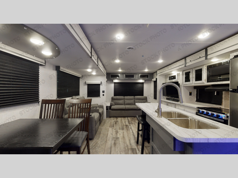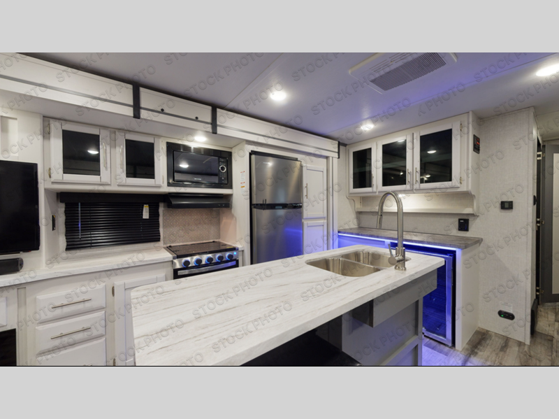 Whether you're relaxing on the theater seats, preparing a meal at the kitchen island, or taking a rest on the slide out king bed, you will enjoy every minute spent in this travel trailer. Your guests will love to sit at the stools around the kitchen island, or they can play a game around the U-shaped dinette. This model includes a hutch with a wine cooler to serve your guests, and the pantry can store snacks for everyone. When it's time to call it a night, the front private bedroom will feel just like home with its king bed and a large front wardrobe. There is even a space that has been prepped to add an optional washer and dryer if you choose!