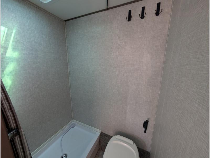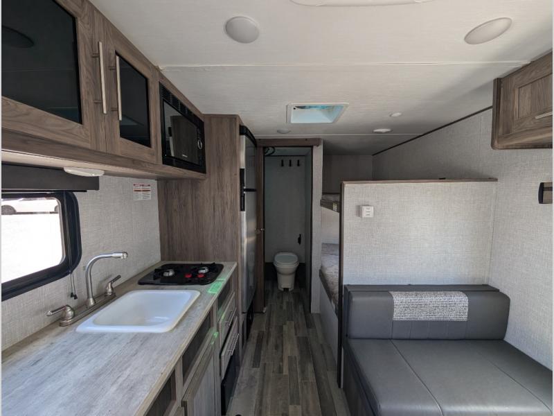 This Zinger Lite travel trailer is perfect for your next family vacation or weekend at the lake with friends. With room for five, this unit gives you the space you need to pack up the kids and the dog and get ready to hit the road! With an RV queen bed and bunk beds, everyone will have a place to sleep. The 38" booth dinette can comfortably hold one to two little ones or an adult guest. Use the oven with an LED glass top to make a home-cooked meal and easily store your dry goods in the maple cabinet drawers. Enjoy extra privacy with a rear corner bath that includes a 36" tub. This unit features multiple overhead compartments, so bring along the board games and other valuables from home.