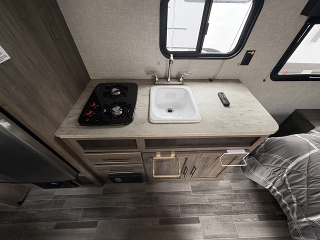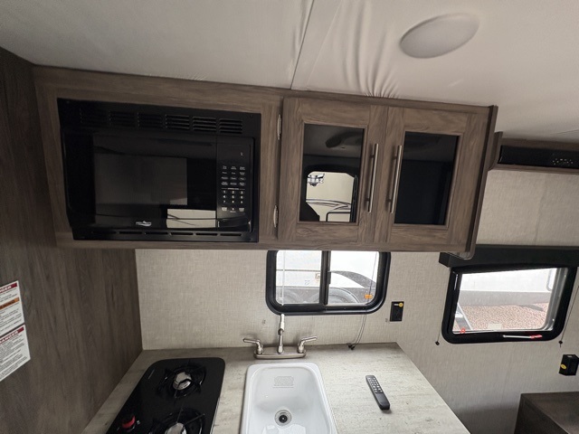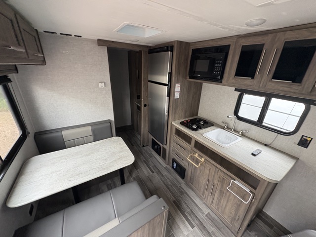You and your spouse will love camping in this Zinger Lite travel trailer! The full rear bathroom has a 36" tub for you to rinse off the day and a linen closet to store your towels. You can prepare home-cooked meals with the cooktop and enjoy eating them at the 24" x 38" booth dinette with a sound bar by the overhead cabinets above it. You will also start each day feeling ready to go after sleeping on the front RV queen bed with shirt closets on either side to keep your clothes looking their best!