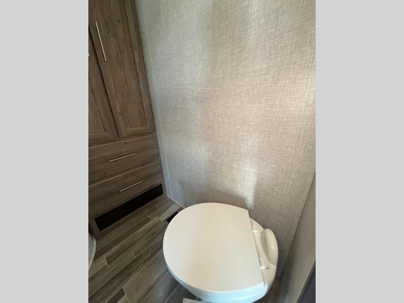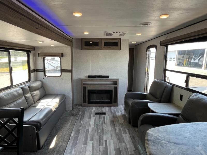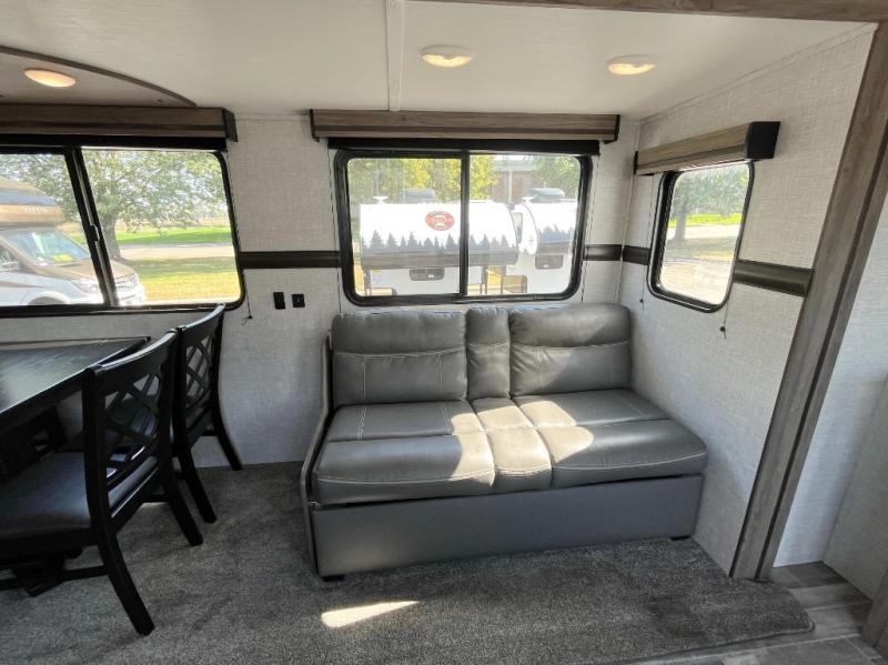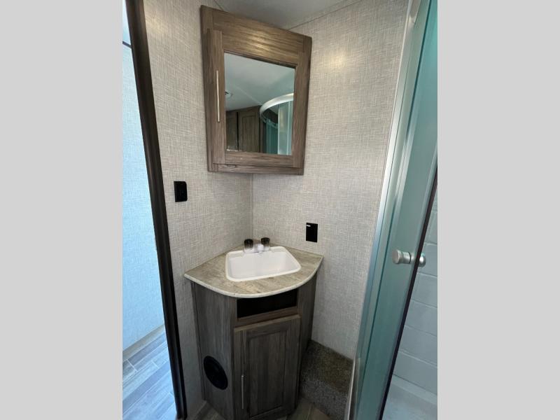 The chef of your group will love cooking in this rear kitchen travel trailer! It not only features a 10-cu. ft. refrigerator, an oven with an LED glass top, and a pressed countertop with a sink cover, but also a stainless steel sink with a stainless steel high-rise faucet and lots of counter space to prep your meals. While the chef is preparing dinner, you can socialize at the U-shaped dinette or 60" jackknife sofa slide while two others sit in the chairs with an end table in between to set a cup of coffee. There is even an outside kitchen, so you can take the fun outdoors while still cooking dinner. The full bathroom has a 34" radius shower with a linen closet next to it for you to grab a towel without dripping water all over the place. Head to the front private bedroom and grab your pajamas from one of the two shirt closets or even from the overhead cabinets above the 60" x 74" RV queen bed!