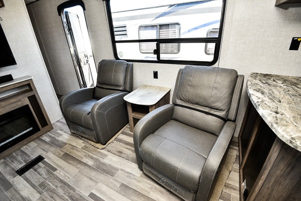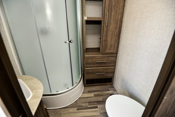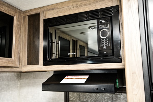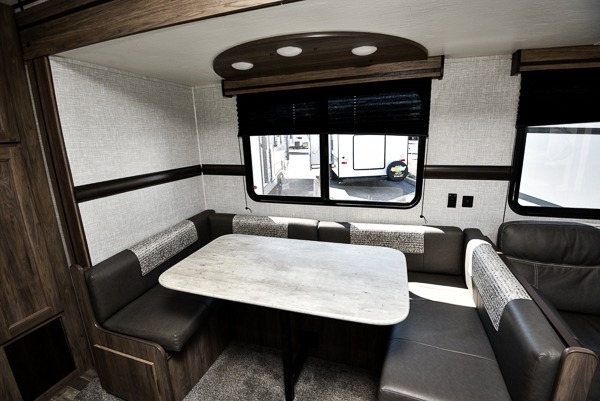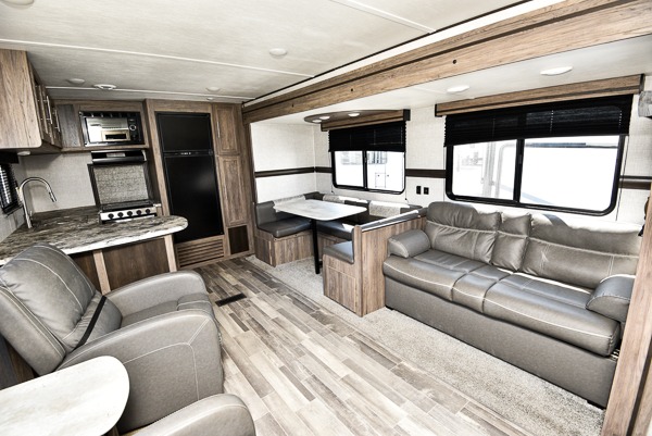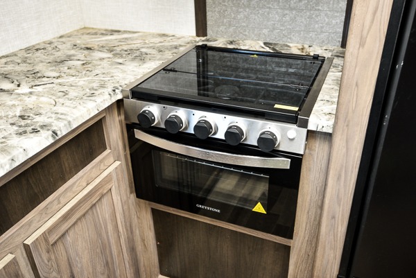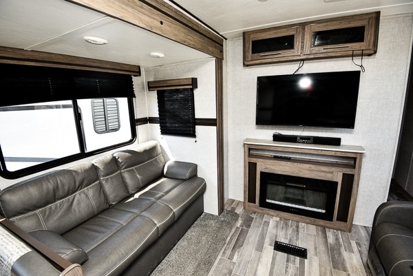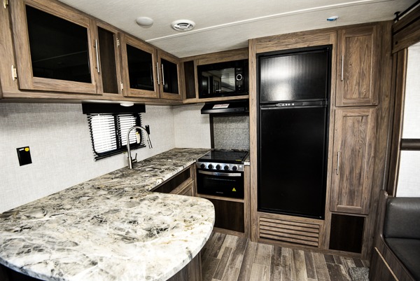 The chef of your group will love cooking in this rear kitchen travel trailer! It not only features a 10-cu. ft. refrigerator, an oven with an LED glass top, and a pressed countertop with a sink cover, but also a stainless steel sink with a stainless steel high-rise faucet and lots of counter space to prep your meals. While the chef is preparing dinner, you can socialize at the U-shaped dinette or 60" jackknife sofa slide while two others sit in the chairs with an end table in between to set a cup of coffee. There is even an outside kitchen, so you can take the fun outdoors while still cooking dinner. The full bathroom has a 34" radius shower with a linen closet next to it for you to grab a towel without dripping water all over the place. Head to the front private bedroom and grab your pajamas from one of the two shirt closets or even from the overhead cabinets above the 60" x 74" RV queen bed!