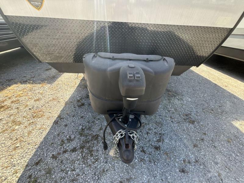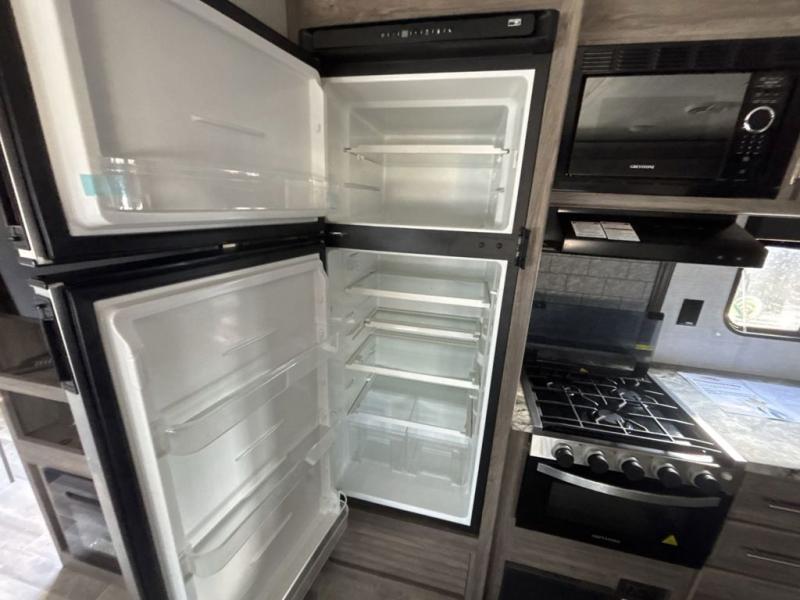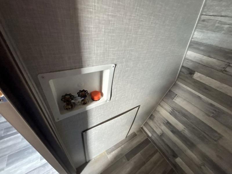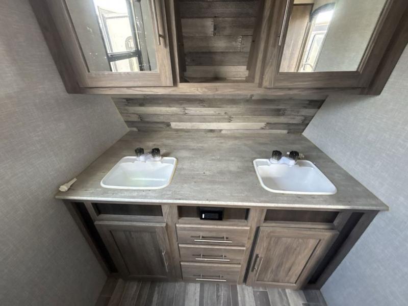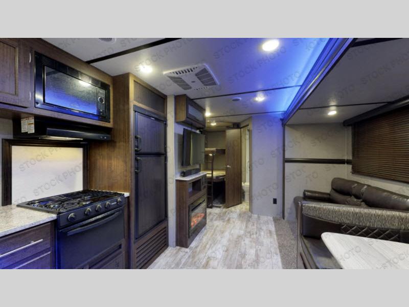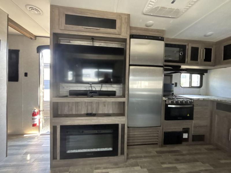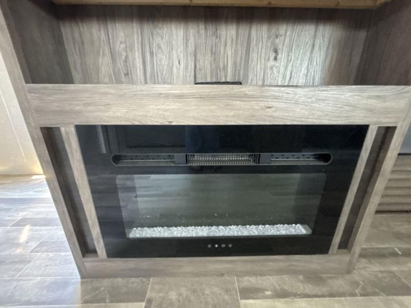 Head out on your greatest adventure with this travel trailer! You will feel right at home with the rear private bedroom featuring a 60" x 74" RV queen bed with shirt closets on either side and overhead cabinets above to store your items. The full front bathroom allows two to get ready at once with the dual-sink vanity, and the closet is prepped to add the optional washer and dryer for you to wash your clothes and in result, pack less clothes. The dual entry doors make for a smooth flow of traffic in and out of the unit, and the 60" jackknife sofa across from the entertainment center with a fireplace and 39" TV is the perfect place to wind down your nights!