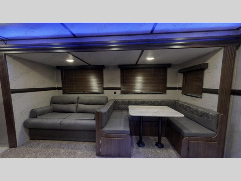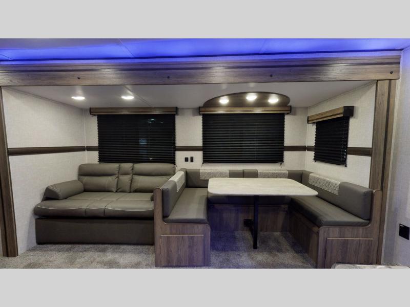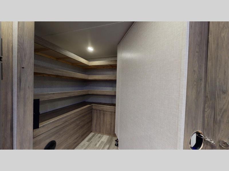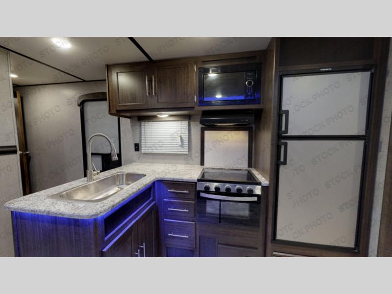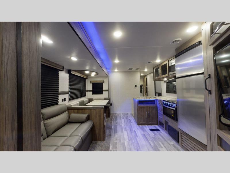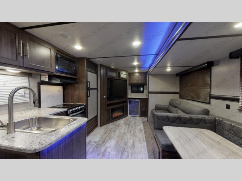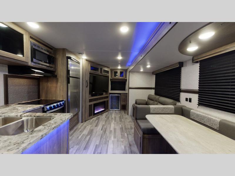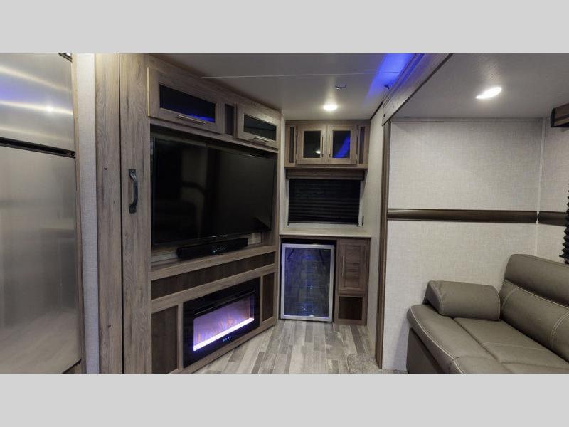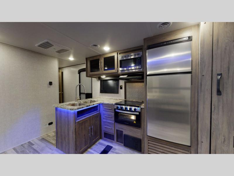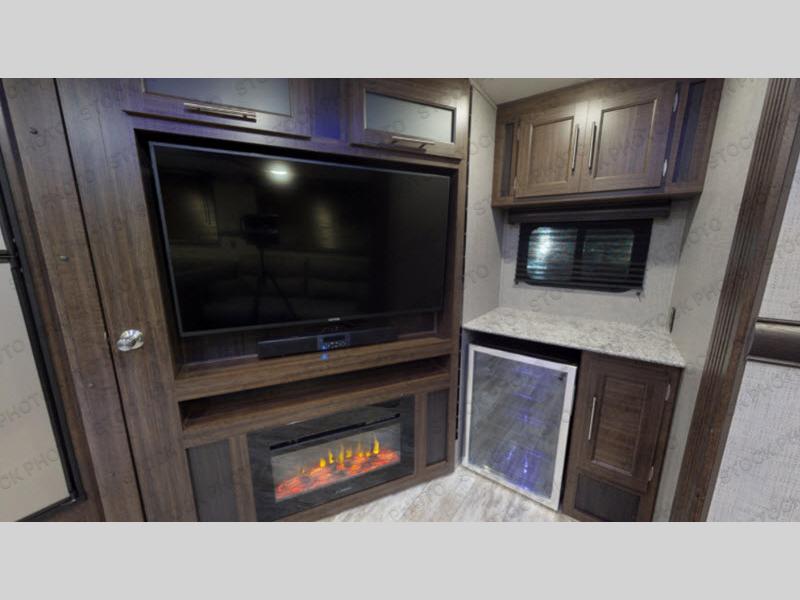 You will enjoy a good night's rest each night in this travel trailer with the 60" x 74" RV queen bed in the front private bedroom, plus there is a closet prepped to add the optional washer and dryer to enjoy clean clothes throughout your entire trip. In the rear you will find the perfect atmosphere to relax at night with the 60" jackknife sofa, the swiveling entertainment center with a fireplace and a 50" TV, and even a wine cooler to keep your beverage close by and cool. During the day you can stay outdoors as long as you want, you can even stay outside while cooking dinner thanks to the outside kitchen which has counter space to prepare your meal too!