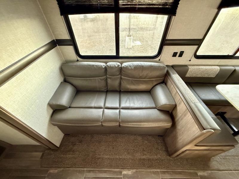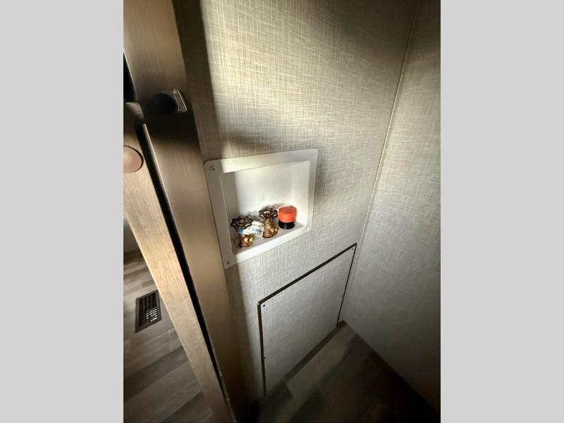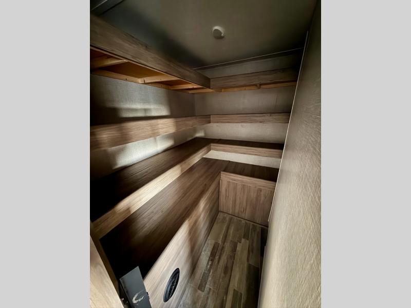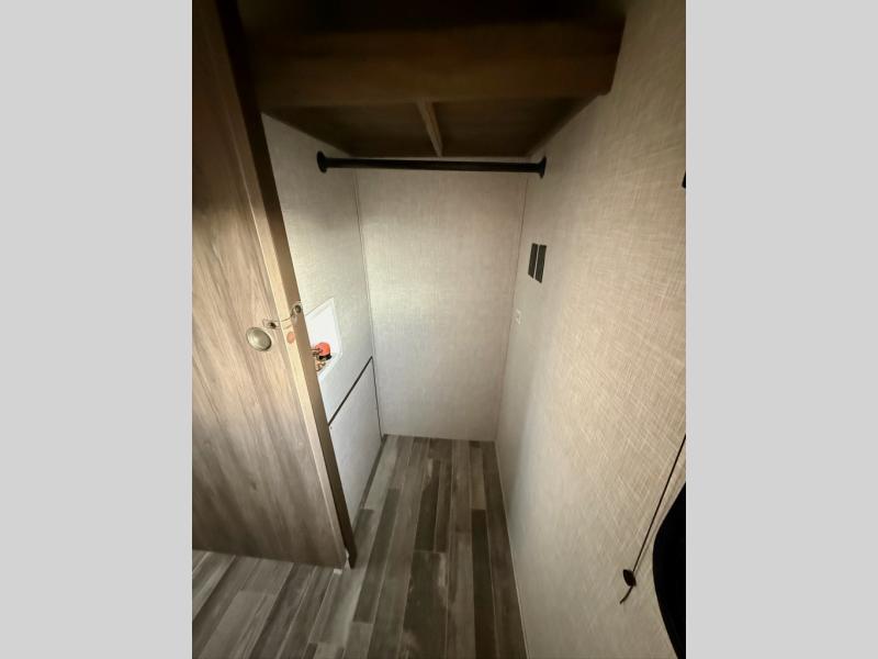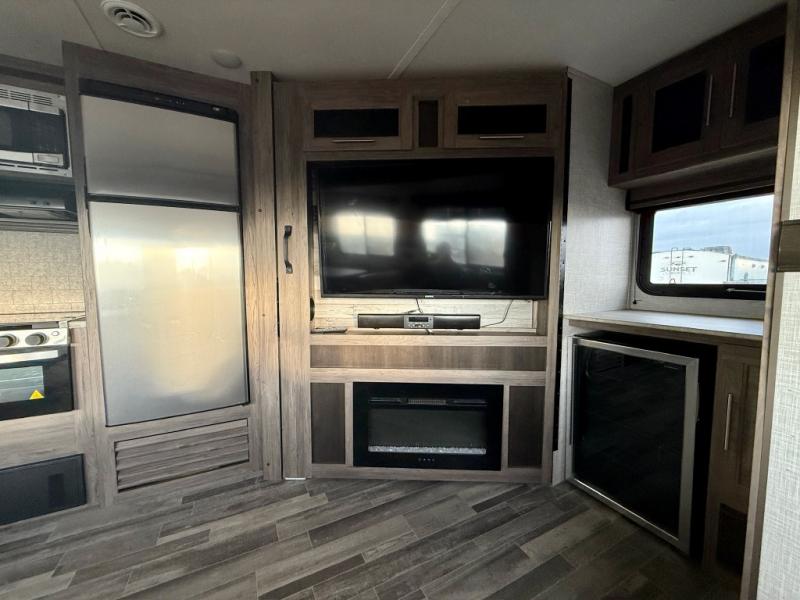 You will enjoy a good night's rest each night in this travel trailer with the 60" x 74" RV queen bed in the front private bedroom, plus there is a closet prepped to add the optional washer and dryer to enjoy clean clothes throughout your entire trip. In the rear you will find the perfect atmosphere to relax at night with the 60" jackknife sofa, the swiveling entertainment center with a fireplace and a 50" TV, and even a wine cooler to keep your beverage close by and cool. During the day you can stay outdoors as long as you want, you can even stay outside while cooking dinner thanks to the outside kitchen which has counter space to prepare your meal too!