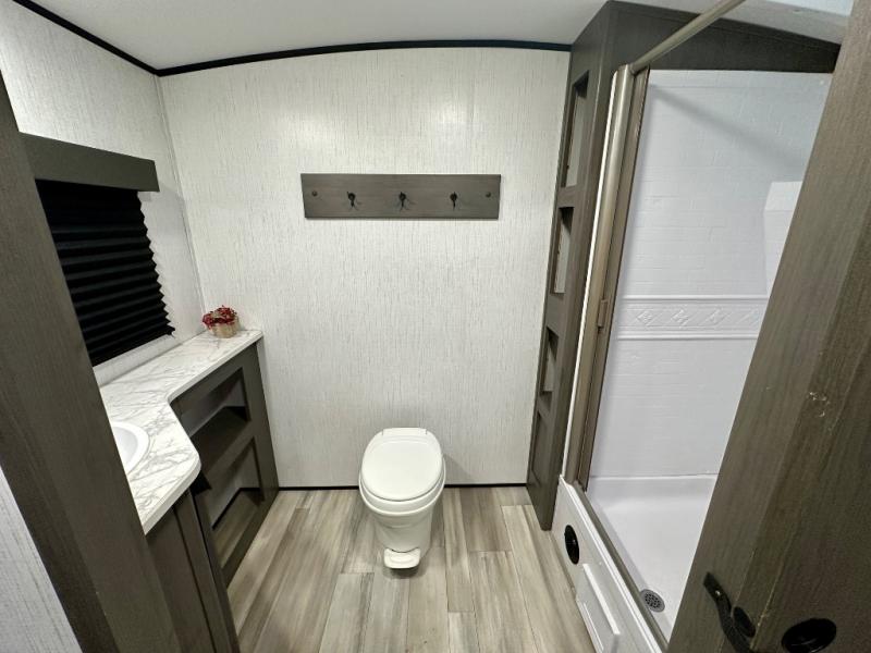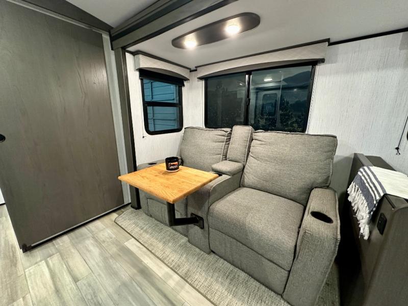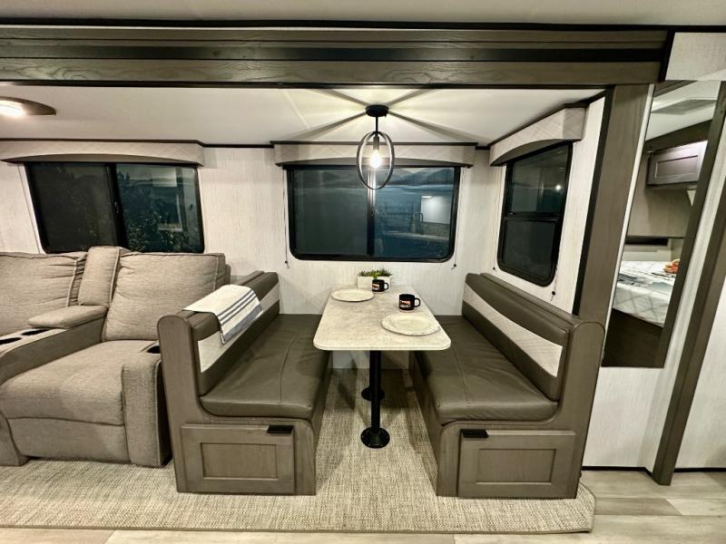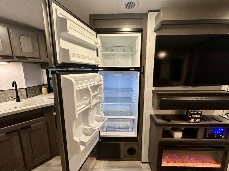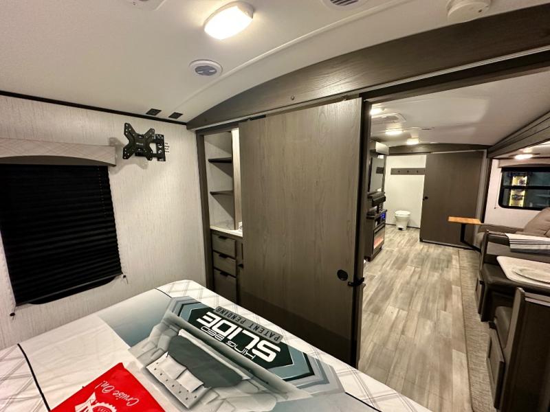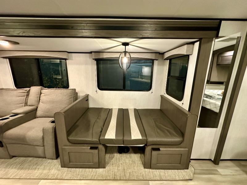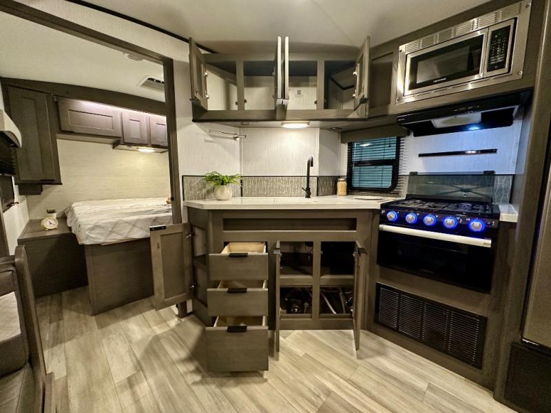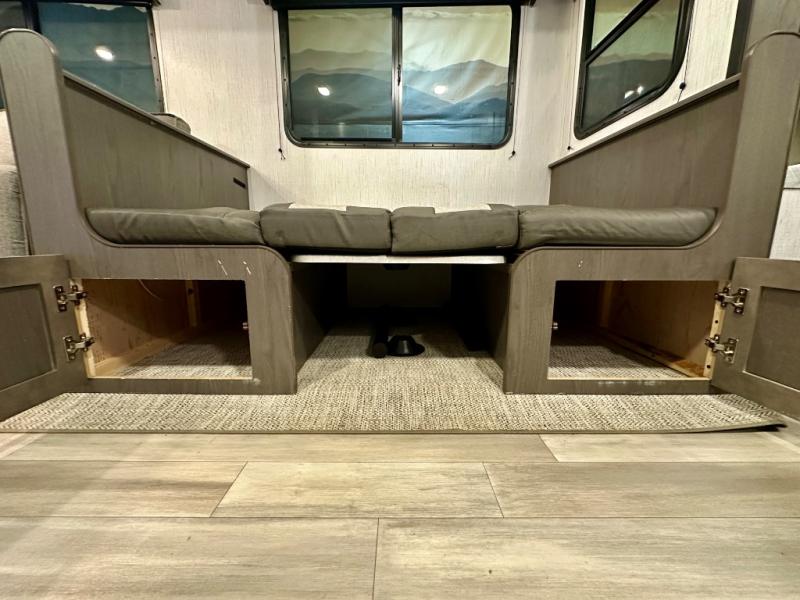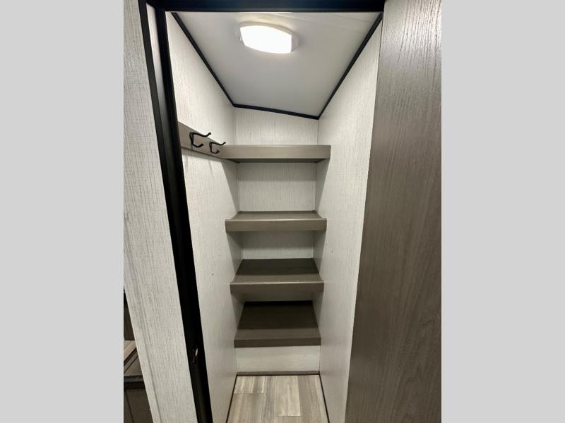 Plan out your summer vacations in this spacious travel trailer for five to six people. The large slide out will allow the dog plenty of space to nap after a long hike, and there is a full bath on board to clean up. The chef will have everything they need to prepare a delicious lunch on the three burner cooktop, plus there is a walk-in pantry for dry goods and snacks. Your crew can dine at the booth dinette, or enjoy some fresh air under the 20' power awning with LED lights. You will feel right at home with a private bedroom up front that includes a king bed and dual wardrobes for all your clothes!