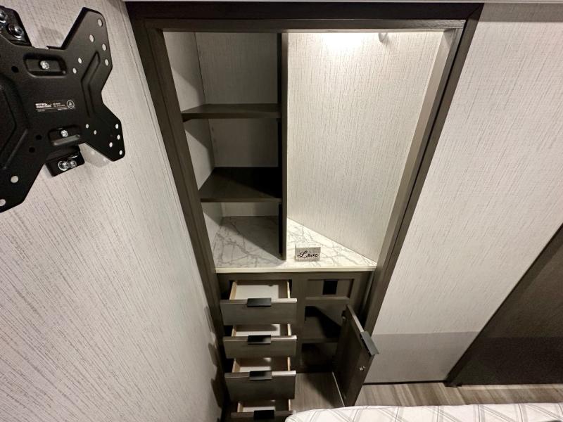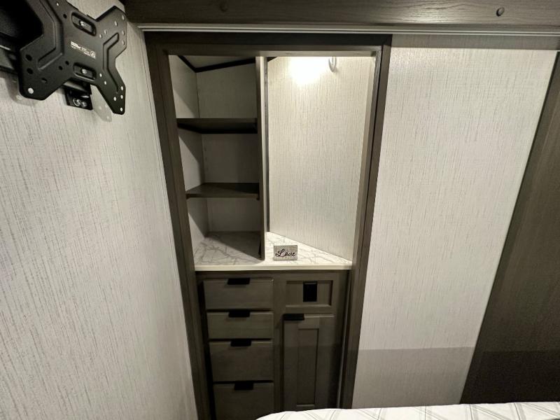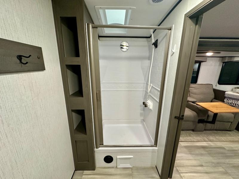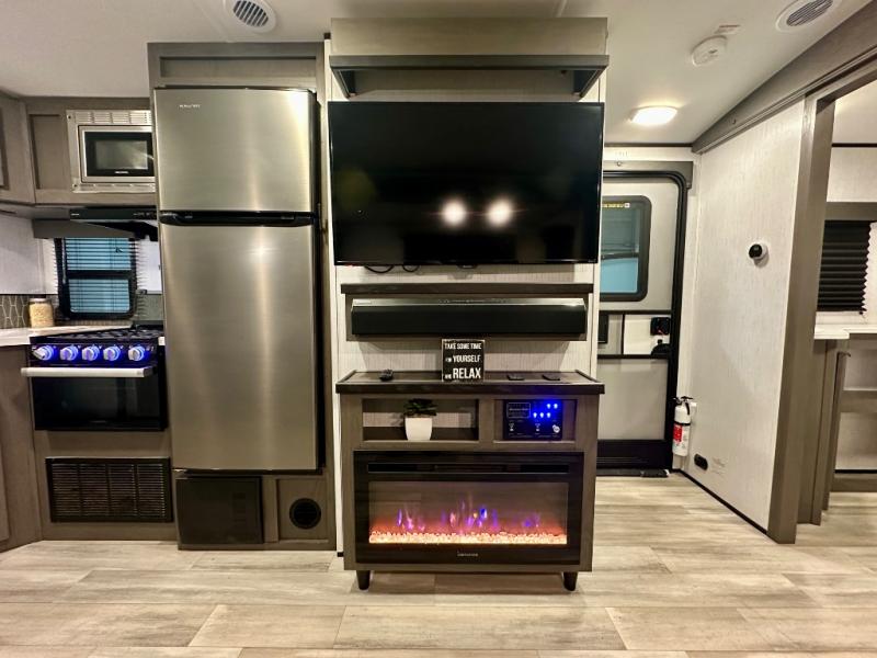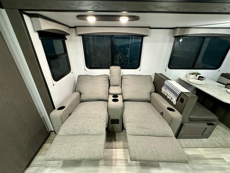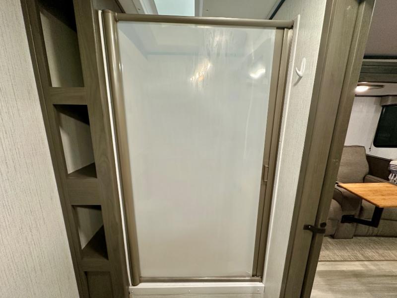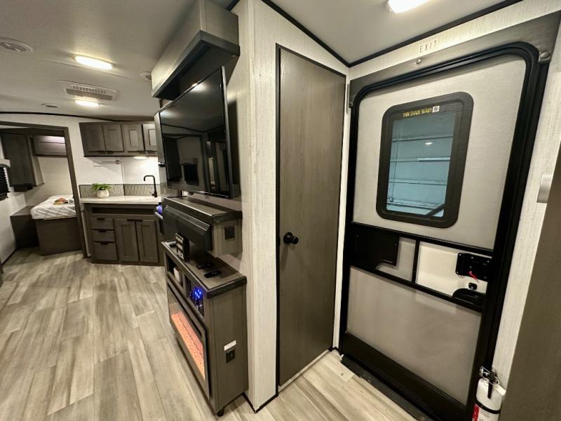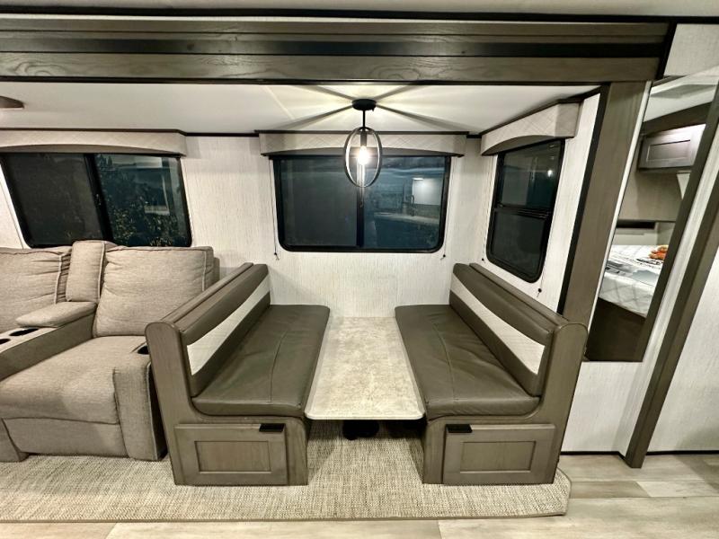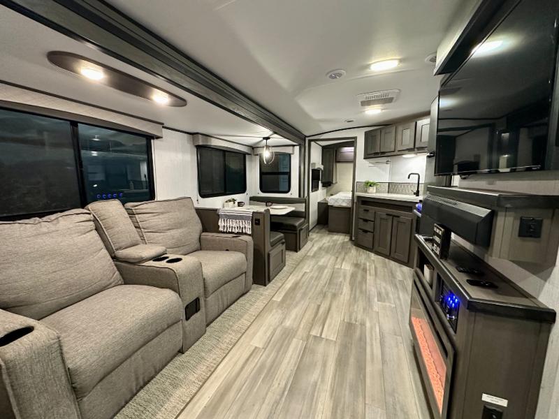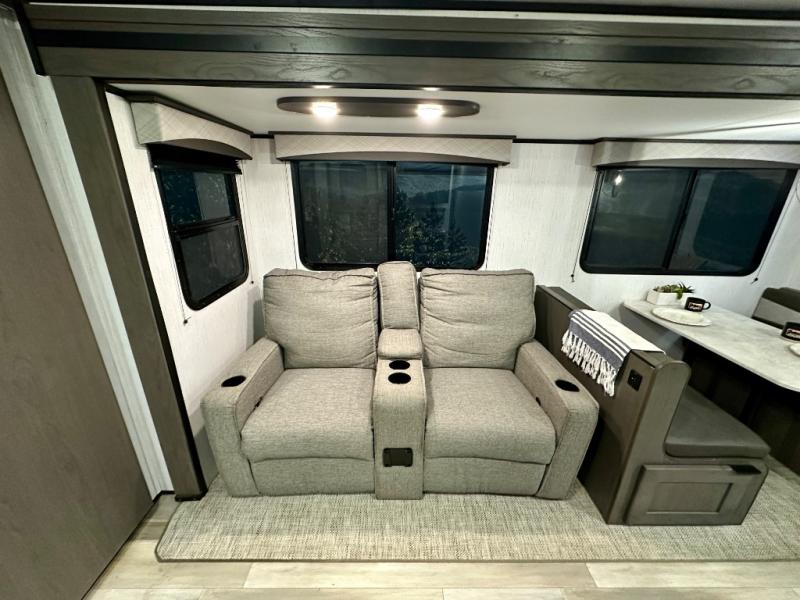 Plan out your summer vacations in this spacious travel trailer for five to six people. The large slide out will allow the dog plenty of space to nap after a long hike, and there is a full bath on board to clean up. The chef will have everything they need to prepare a delicious lunch on the three burner cooktop, plus there is a walk-in pantry for dry goods and snacks. Your crew can dine at the booth dinette, or enjoy some fresh air under the 20' power awning with LED lights. You will feel right at home with a private bedroom up front that includes a king bed and dual wardrobes for all your clothes!