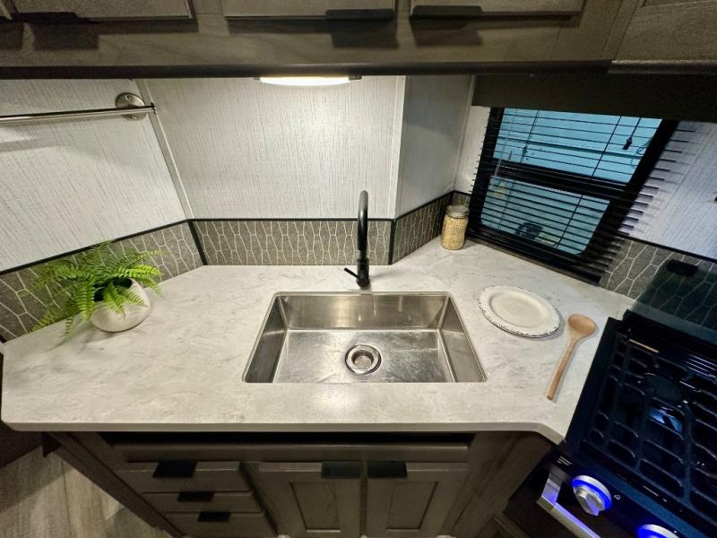 Each Embrace travel trailer by Cruiser is constructed with laminated rear wall and slide out ends, a 6' 11" aluminum roof, and 5/8" tongue and groove plywood flooring for durability. The industry leading E-Z lube axles will provide smooth towing from home to campground, and the heated and enclosed underbelly will allow you to camp well into the colder months. Inside, you'll love with the solid surface countertops, the charging station with 12V and USB ports, plus concealed cabinet door hinges for a more at-home feel. The Embrace also features the patent pending full belly storage system so you can bring along extra coolers, hiking gear, and tackle boxes with ease!