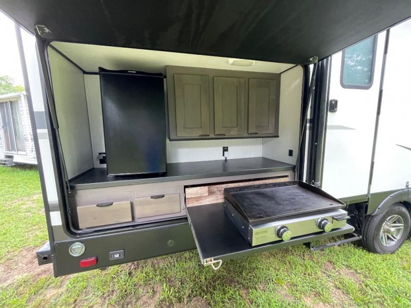 Double slides and double entry doors equal double the fun in this roomy travel trailer. Your guests will love the rear private bunkhouse that includes three bunks, plus a futon to relax on during the day. The full bath is close by and it includes its own exterior entry door for added convenience. Your crew can meet up in the main living area on the tri-fold sofa or at the booth dinette within the large slide out, or you may just want to head outdoors under the 19' power awning with LED lights. The chef can whip up dinner on the exterior kitchen, while the kids grab their scooters from the pass-through storage!
