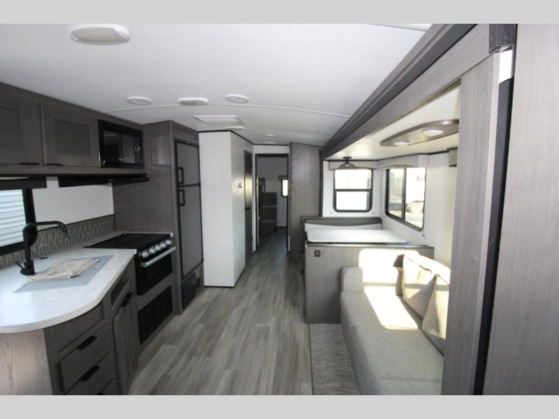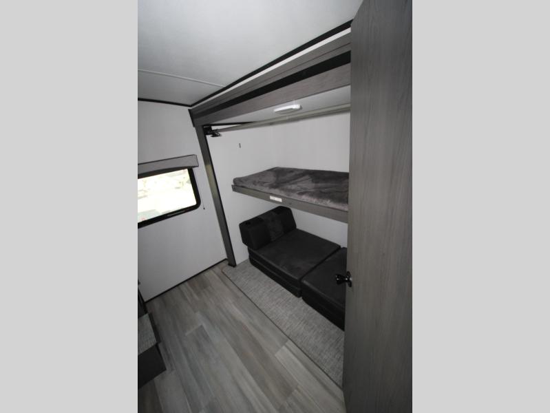 Double slides and double entry doors equal double the fun in this roomy travel trailer. Your guests will love the rear private bunkhouse that includes three bunks, plus a futon to relax on during the day. The full bath is close by and it includes its own exterior entry door for added convenience. Your crew can meet up in the main living area on the tri-fold sofa or at the booth dinette within the large slide out, or you may just want to head outdoors under the 19' power awning with LED lights. The chef can whip up dinner on the exterior kitchen, while the kids grab their scooters from the pass-through storage!