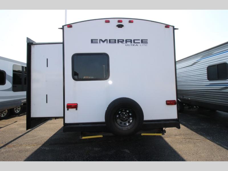 Each Embrace travel trailer by Cruiser is constructed with laminated rear wall and slide out ends, a 6' 11" aluminum roof, and 5/8" tongue and groove plywood flooring for durability. The industry leading E-Z lube axles will provide smooth towing from home to campground, and the heated and enclosed underbelly will allow you to camp well into the colder months. Inside, you'll love with the solid surface countertops, the charging station with 12V and USB ports, plus concealed cabinet door hinges for a more at-home feel. The Embrace also features the patent pending full belly storage system so you can bring along extra coolers, hiking gear, and tackle boxes with ease!