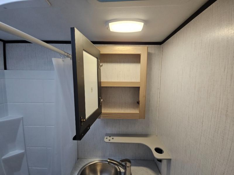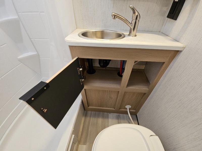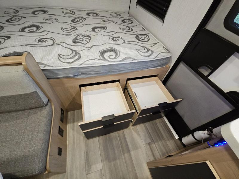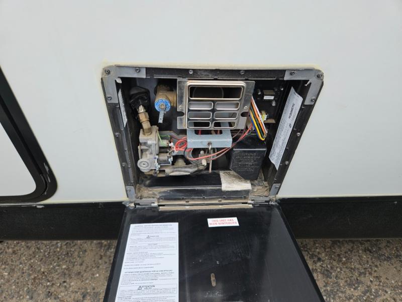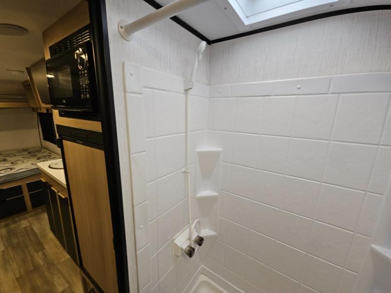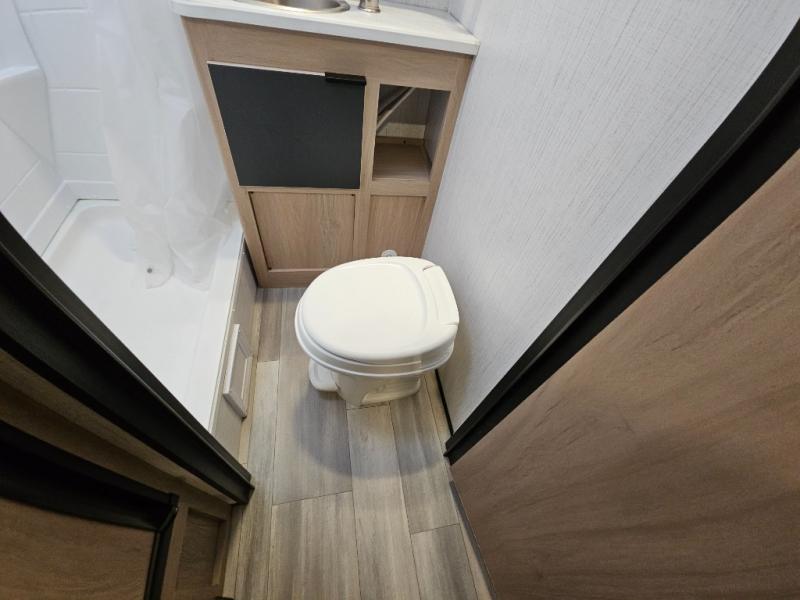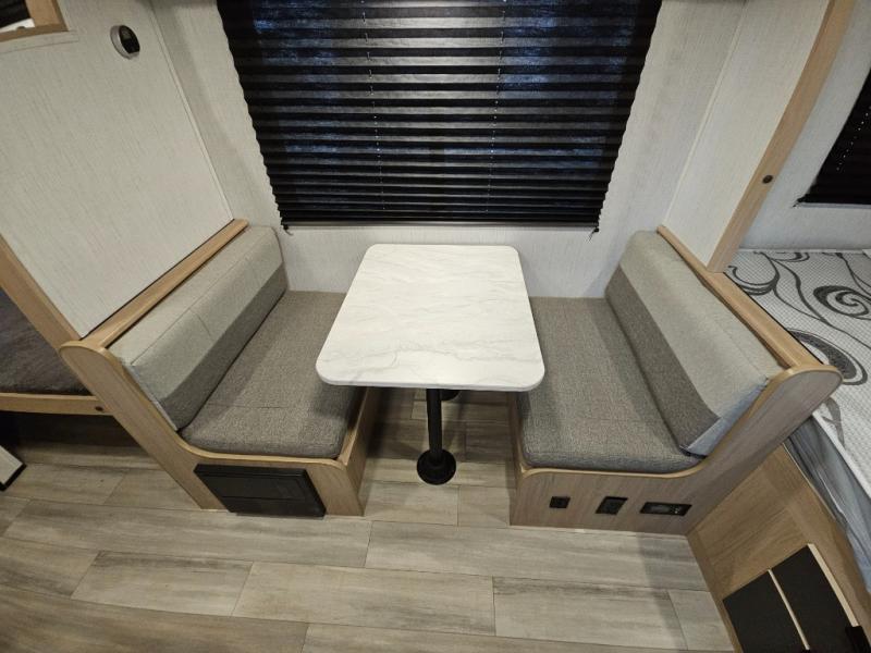The whole family can camp comfortably in this travel trailer! The kids can sleep on the set of double bunk beds and you can sleep on the front queen bed with drawers underneath to store your necessities. The booth dinette could also transform into an extra sleeping space when you aren't using it to enjoy a meal prepared with the two burner cooktop and 8 cu. ft. refrigerator. Everyone can stay squeaky clean with the shower in the rear corner bathroom. Don't leave any outdoor gear behind when you have a front exterior full pass-through storage area for it all!
