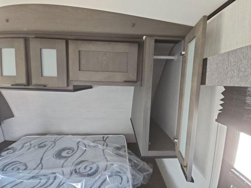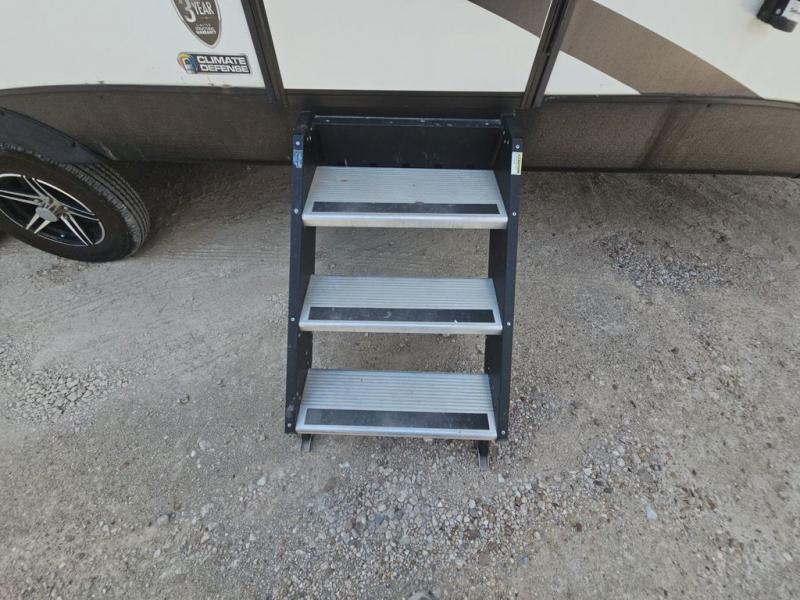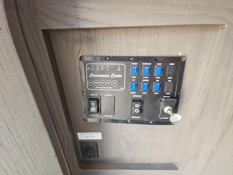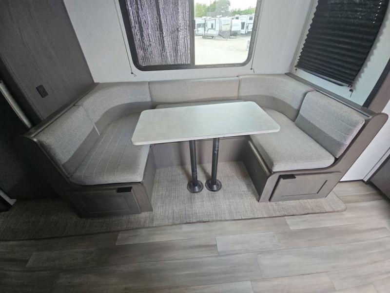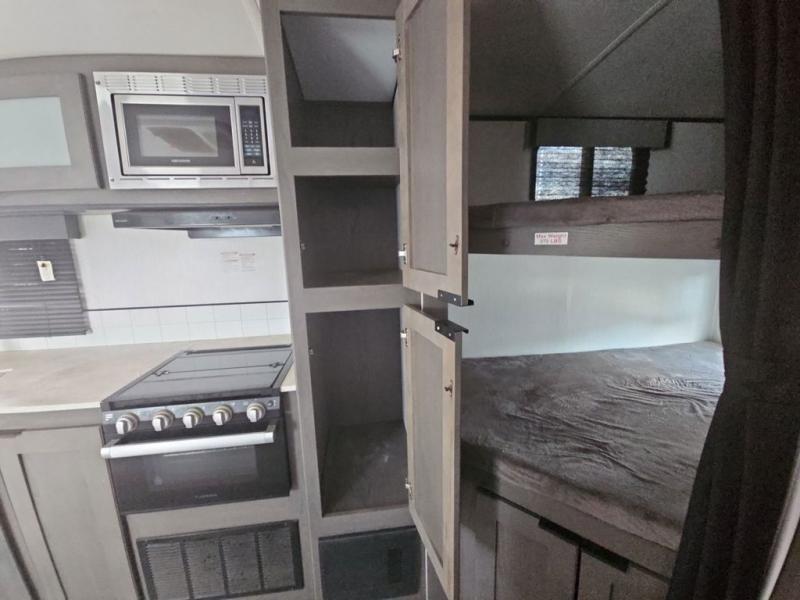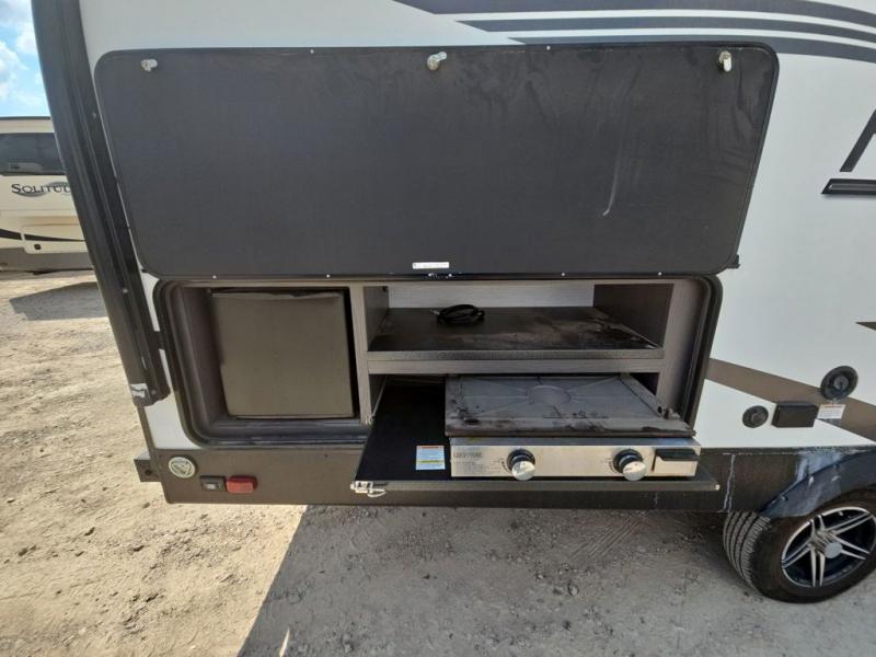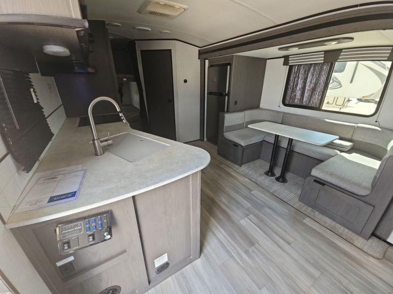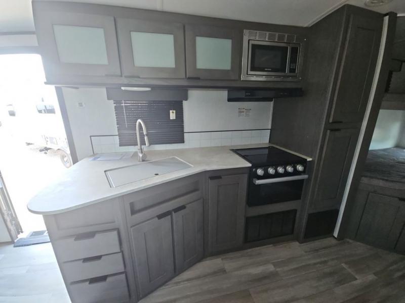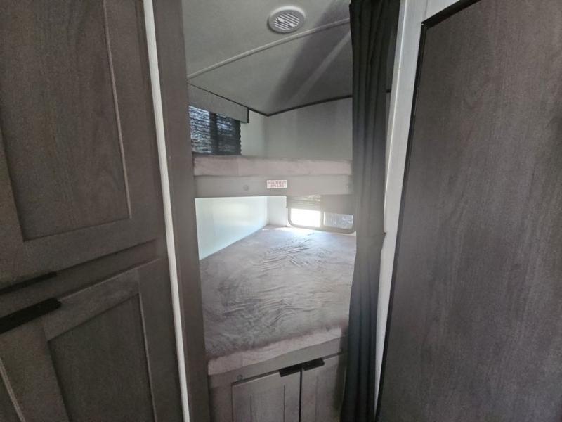 The whole family will love camping in this spacious travel trailer! There are double-size bunks for the little ones or your guests, a sliding king bed in the front private bedroom for you, plus a U-shaped dinette within the large slide out in the main living area to dine at or even sleep on. The chef can cook indoors on the three burner cooktop, or outdoors at the outside kitchen. And the rear corner full bathroom will keep everyone refreshed after being outdoors all day. There is a 19' patio awning to relax under and a full belly storage system to store the yard games in.