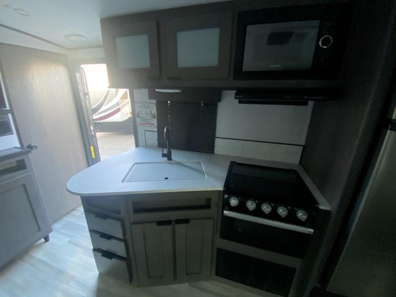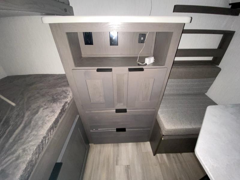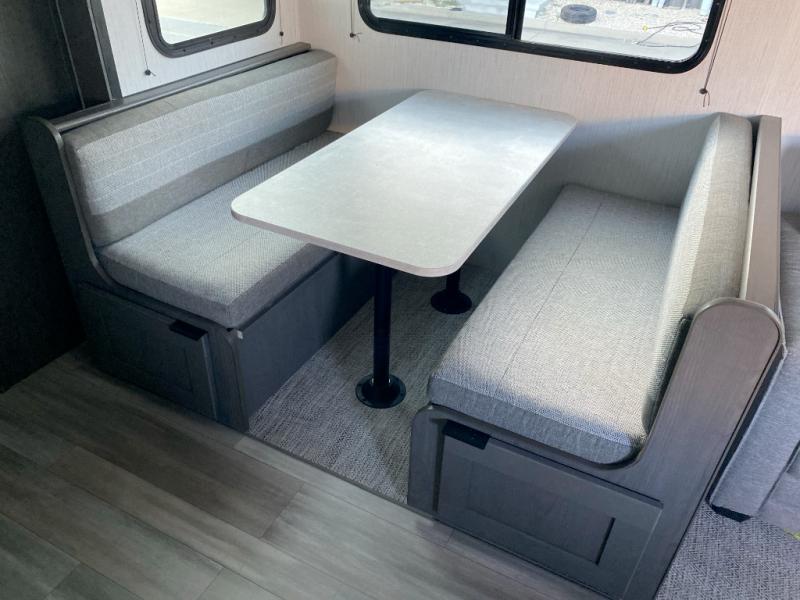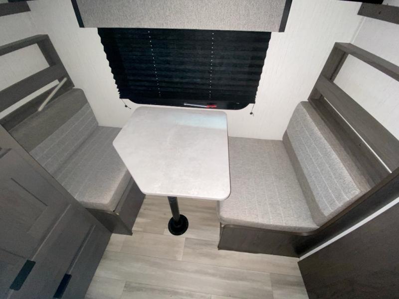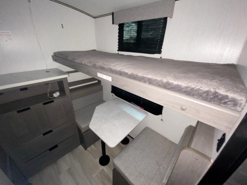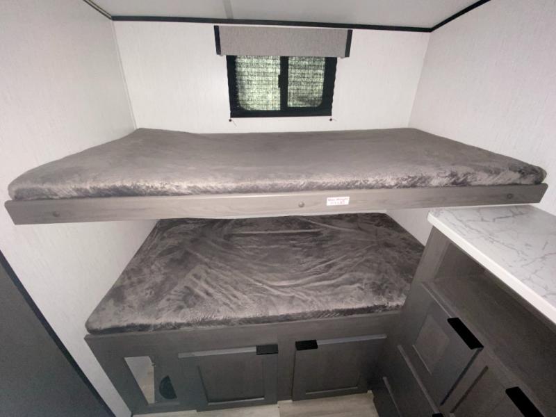 Everyone is going to love this travel trailer with a private bunkhouse! There are triple bunk beds, plus a dinette under one bunk for the kids or your friends to enjoy their own privacy, sleeping space and sitting area. You'll appreciate having your own front private bedroom with a king bed sliding system, and there is a booth dinette and sofa within the large slide out for more seating and sleeping space. Meals can be prepared on the three burner cooktop indoors, or outdoors on the outside cooktop. This model also includes a full belly storage system to bring along hiking and fishing gear, and a patio awning for protection from the elements.