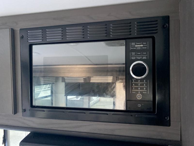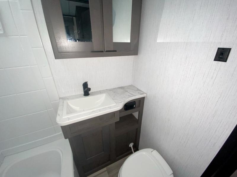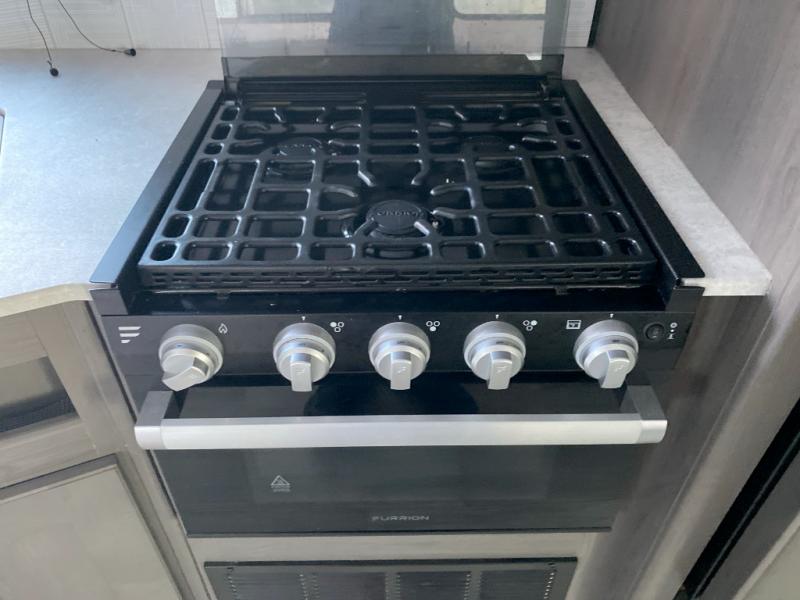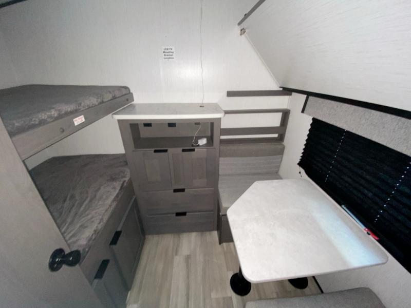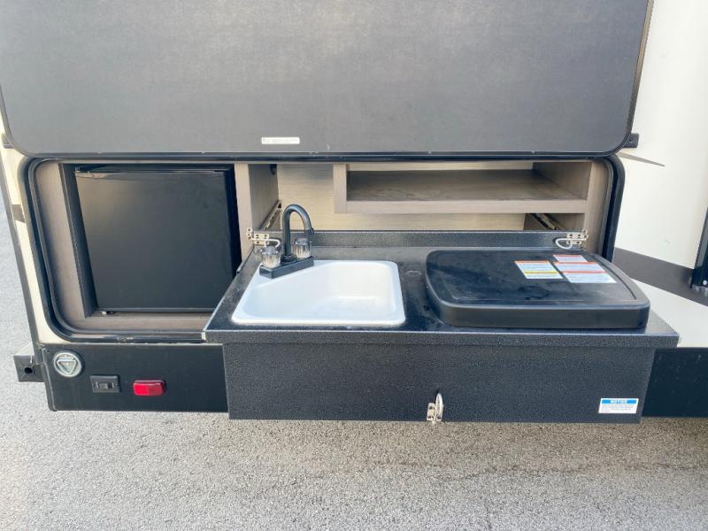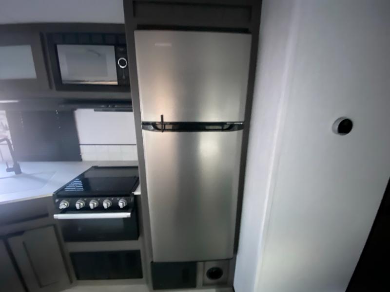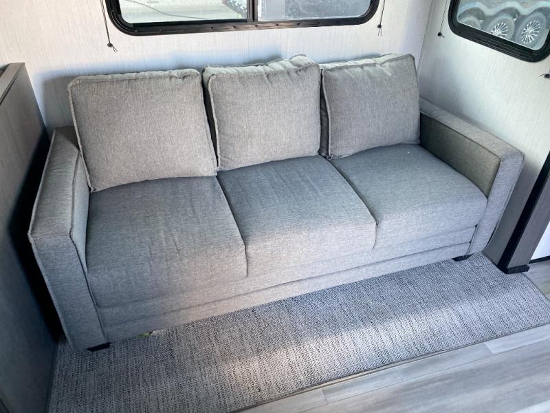 Everyone is going to love this travel trailer with a private bunkhouse! There are triple bunk beds, plus a dinette under one bunk for the kids or your friends to enjoy their own privacy, sleeping space and sitting area. You'll appreciate having your own front private bedroom with a king bed sliding system, and there is a booth dinette and sofa within the large slide out for more seating and sleeping space. Meals can be prepared on the three burner cooktop indoors, or outdoors on the outside cooktop. This model also includes a full belly storage system to bring along hiking and fishing gear, and a patio awning for protection from the elements.