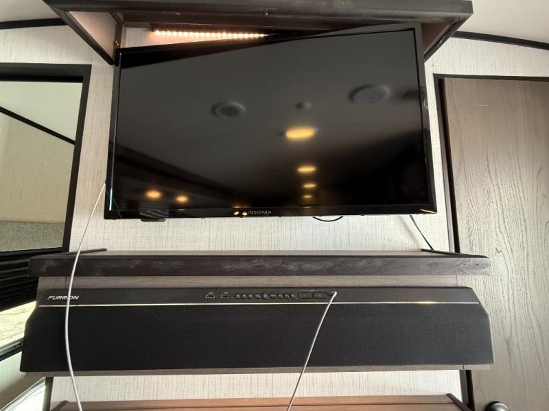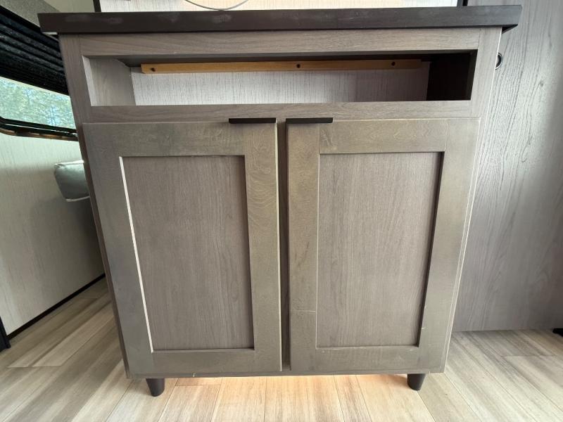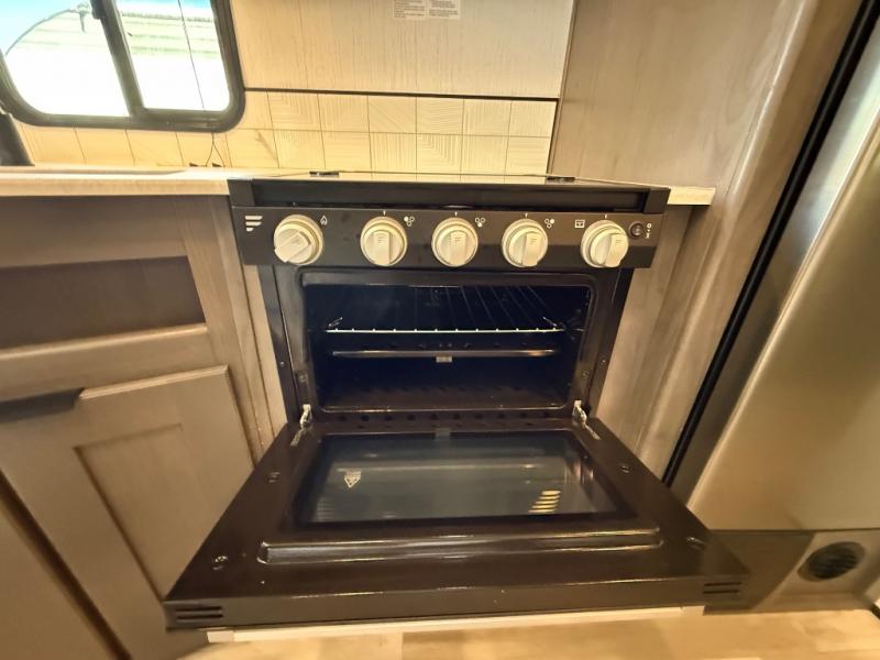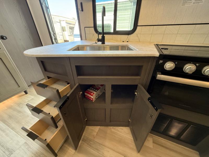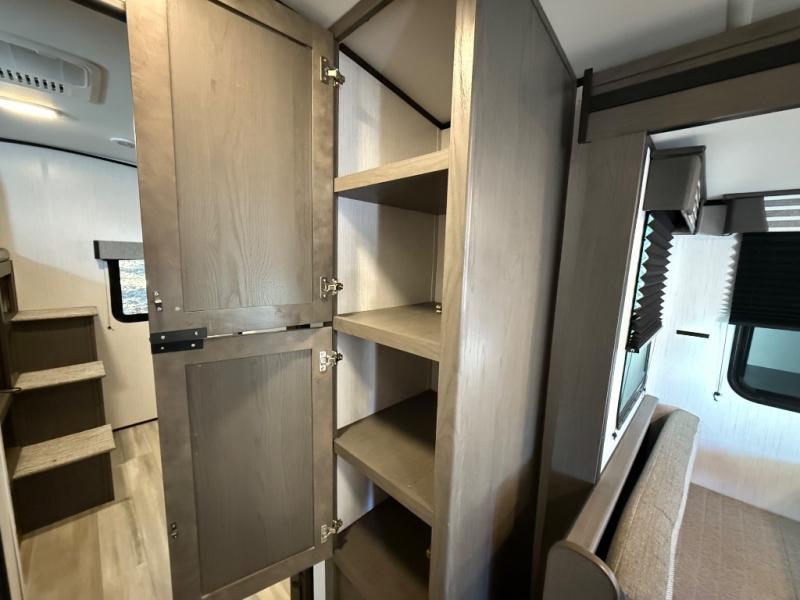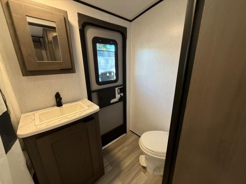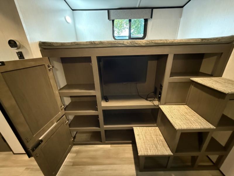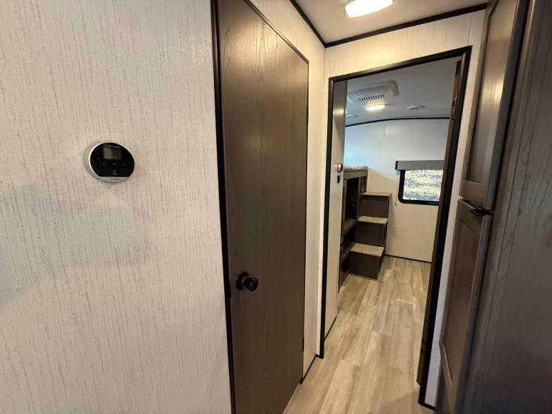 You'll want to take this travel trailer out every other weekend with its sleeping space for eight, dual entry doors, and double slides! Once you arrive at your destination, set up the 19' awning with LED light, then start lunch on the outside kitchen. The kids or your guests can start unpacking their things in the rear private bunkhouse with two bunks and a futon, bunk steps, plus storage, while your clothing and such will be in the dual wardrobes in the front private bedroom. The inside kitchen includes full amenities, the full bathroom offers the second entry/exit door, and the front bedroom has two entries. Everyone can meet in the main living area that includes a large slide with a booth dinette and a sofa. And you can add the optional LED TV for inside entertainment.