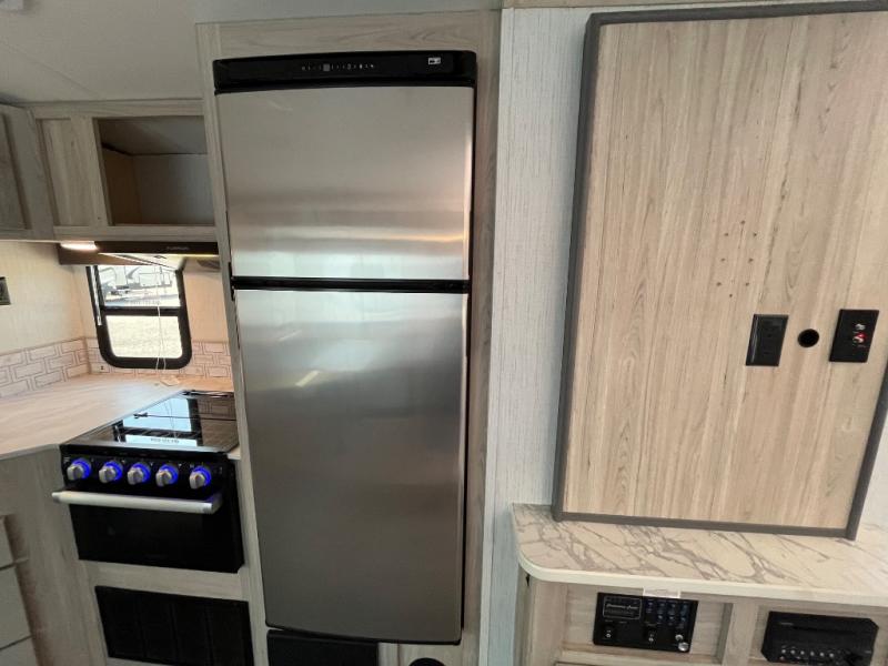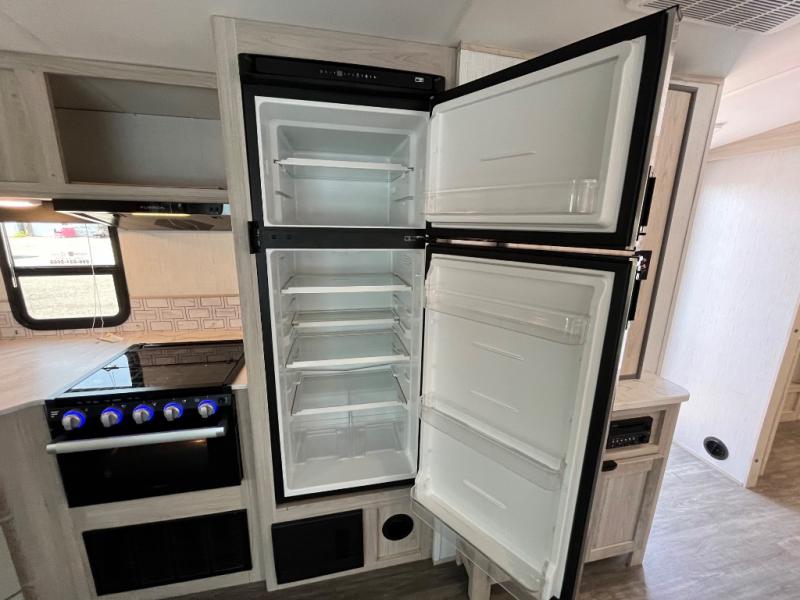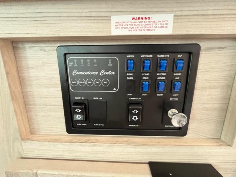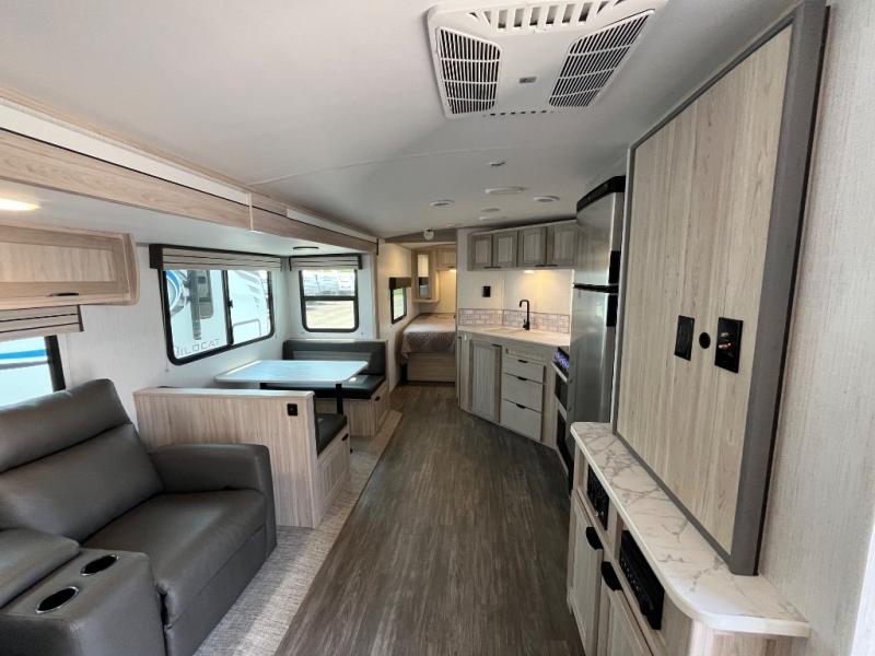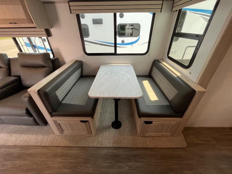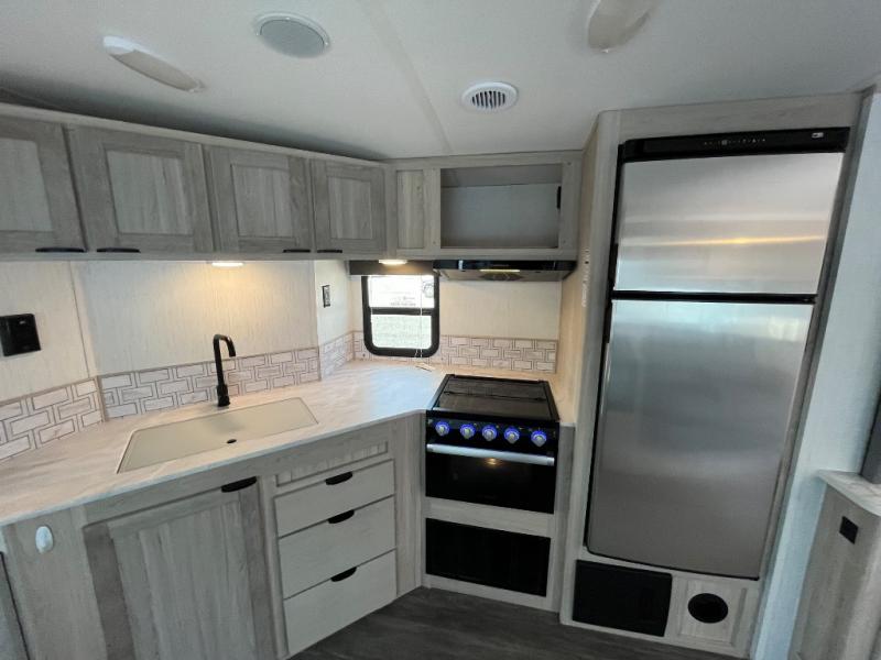 Enjoy a relaxing vacation at the campgrounds with this travel trailer! The full rear bathroom has a full shower for you to rinse the sand out of your hair each day and extra countertop space to set your items. Your bellies will stay full with a walk-in pantry to store your canned goods and snacks, and a three burner cooktop to fry up some bacon. The sofa and booth dinette slide opens up the living/kitchen area while offering comfortable places to dine and socialize, plus they can even transform into extra sleeping spaces. The front private bedroom has a patent pending king bed sliding system with a pet palace underneath so you and your furry friend can enjoy a good night's rest!