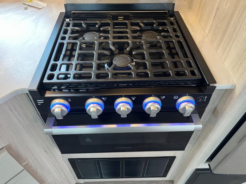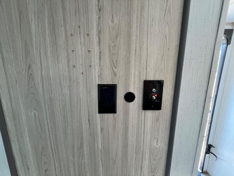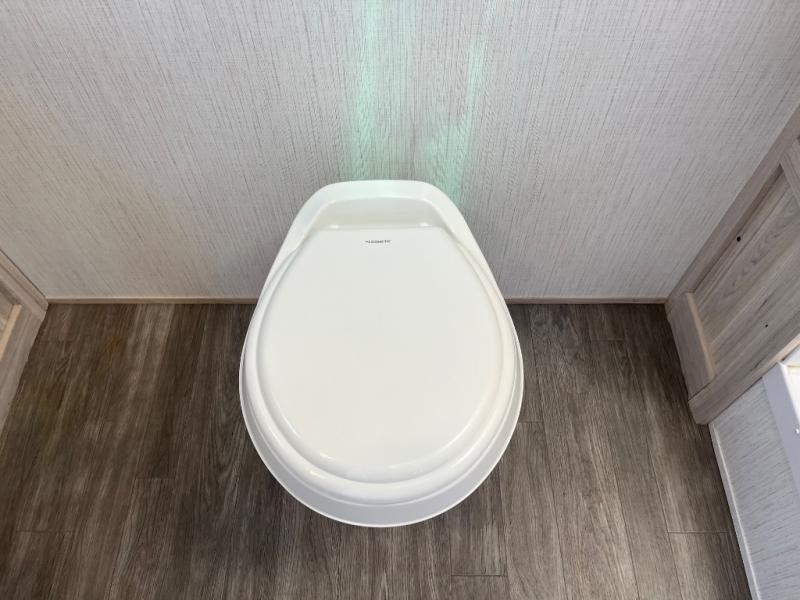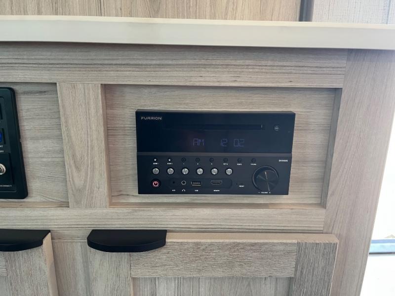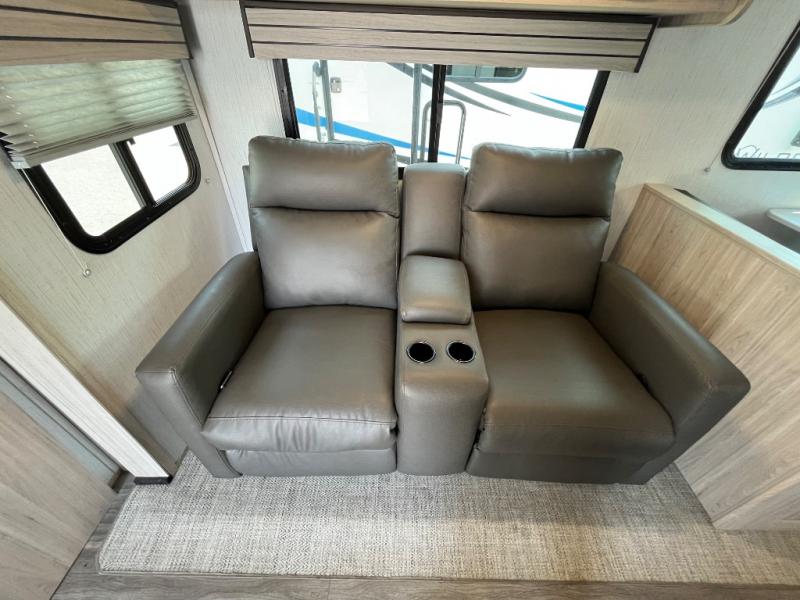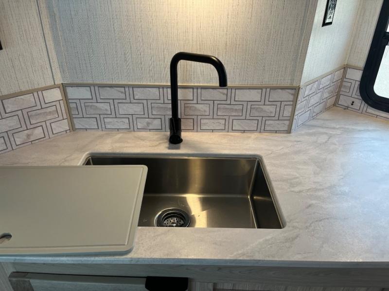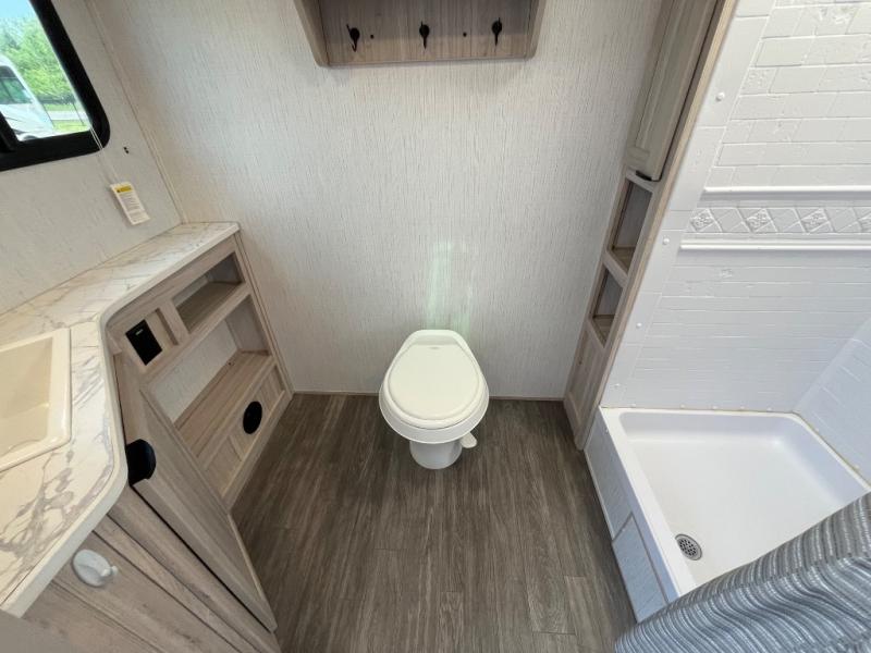 Enjoy a relaxing vacation at the campgrounds with this travel trailer! The full rear bathroom has a full shower for you to rinse the sand out of your hair each day and extra countertop space to set your items. Your bellies will stay full with a walk-in pantry to store your canned goods and snacks, and a three burner cooktop to fry up some bacon. The sofa and booth dinette slide opens up the living/kitchen area while offering comfortable places to dine and socialize, plus they can even transform into extra sleeping spaces. The front private bedroom has a patent pending king bed sliding system with a pet palace underneath so you and your furry friend can enjoy a good night's rest!