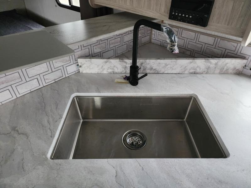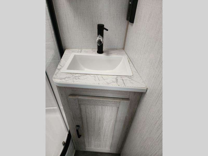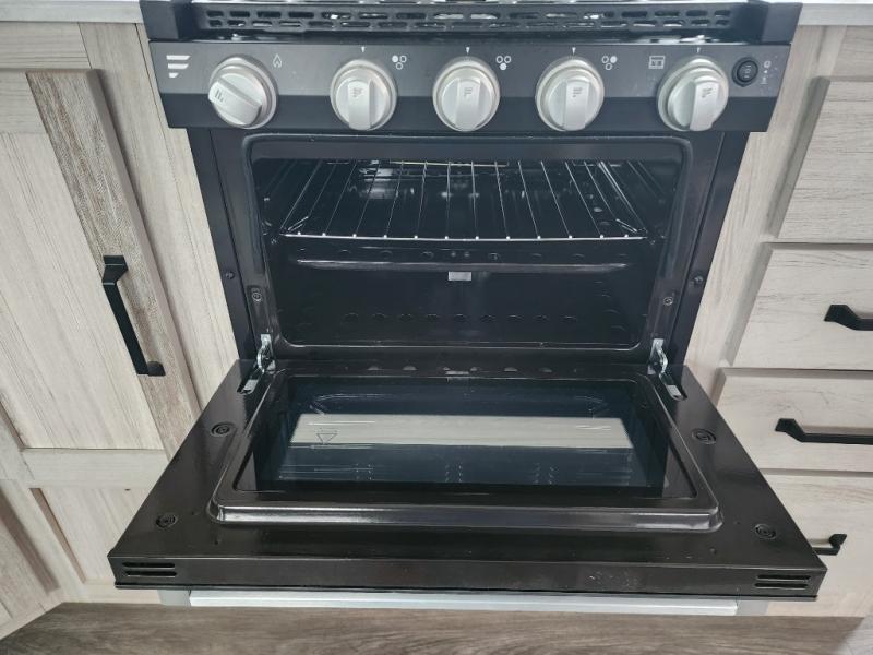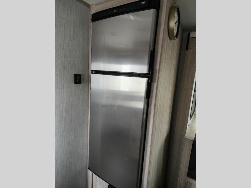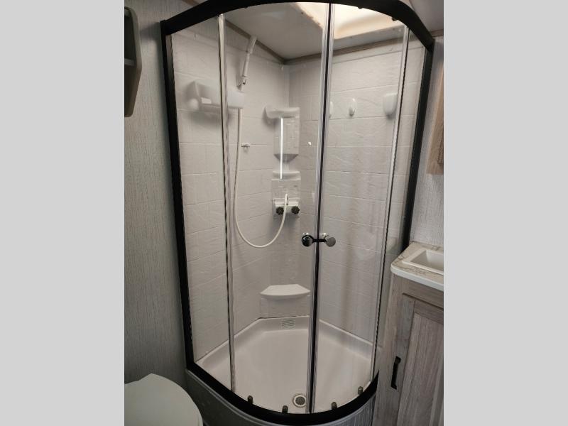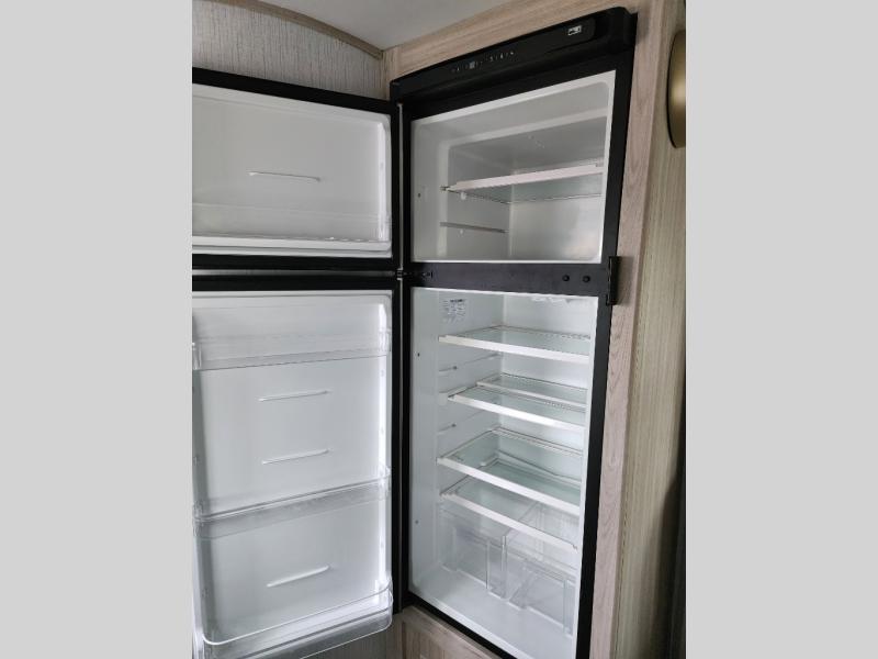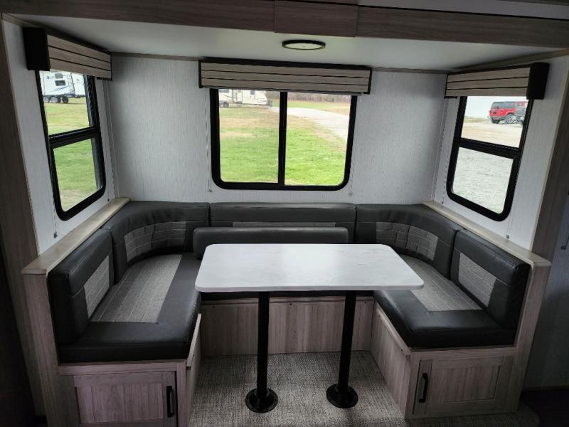 You won't want to camp any other way once you step inside this travel trailer! It features a patent pending king bed sliding system with a pet palace underneath that has a cruise-thru storage design so you and your furry friend will enjoy a good night's rest. When you aren't using the U-shaped dinette to enjoy a meal or play a card game, you can transform it into an extra sleeping space for a guest or two depending on their size. The seamless edge countertops have an enhanced durability and the 10.7 cu. ft. refrigerator will keep your perishables nice and fresh. Freshen up each morning with the radius shower in the rear corner bathroom!