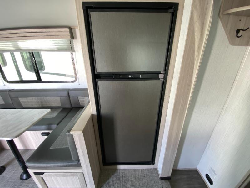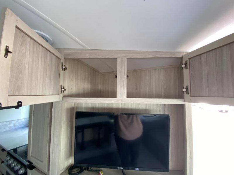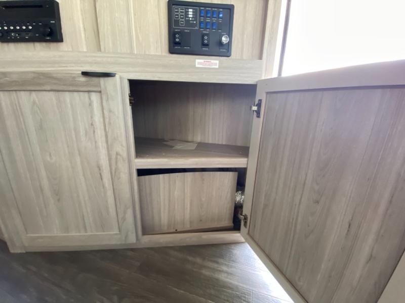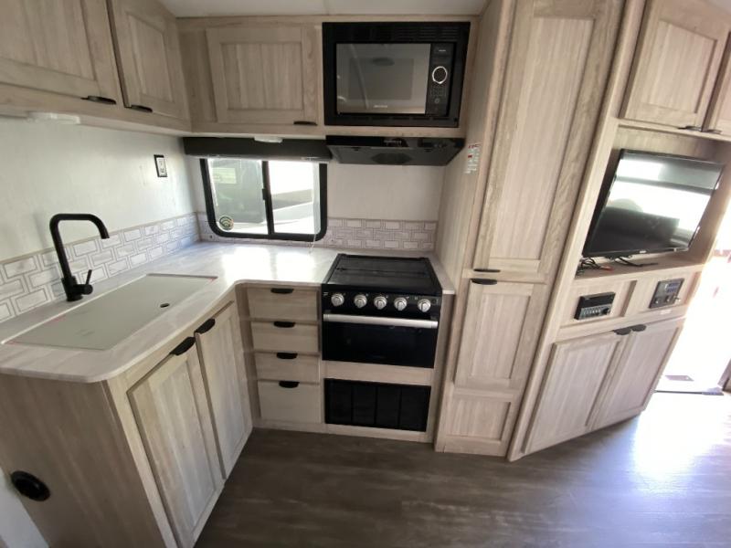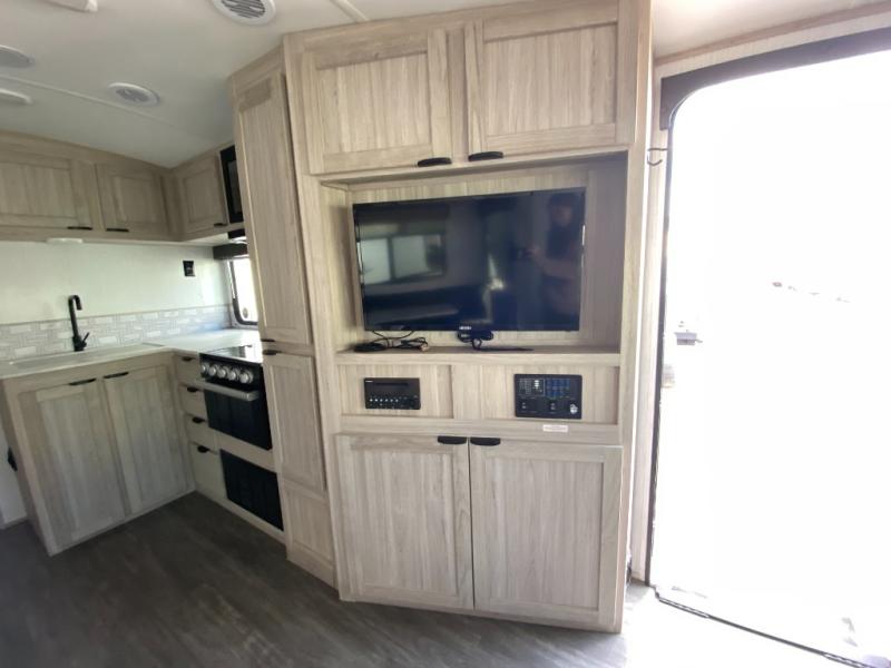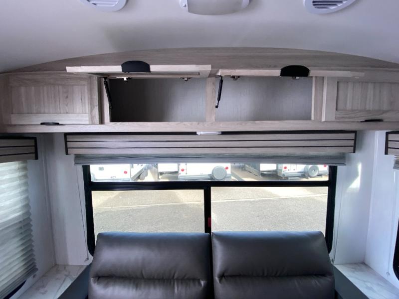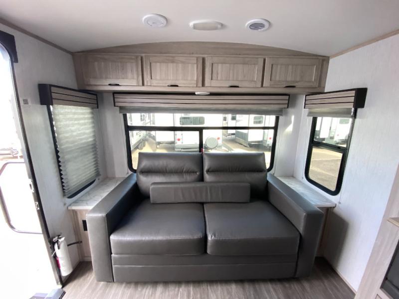 The 269RLS floorplan delivers space where it matters most. Step inside to a bright, open interior featuring a large slide-out that expands the living area and creates room to relax, dine, or entertain. The living space includes plush seating and an entertainment center, perfect for movie nights or unwinding after a day of hiking, fishing, or sightseeing. Large windows bring in natural light and scenic views, making the interior feel inviting and airy.