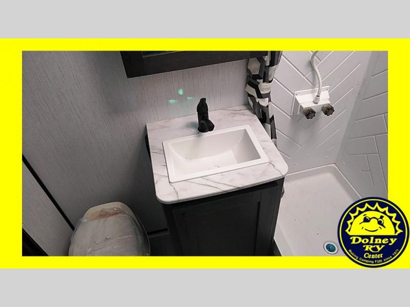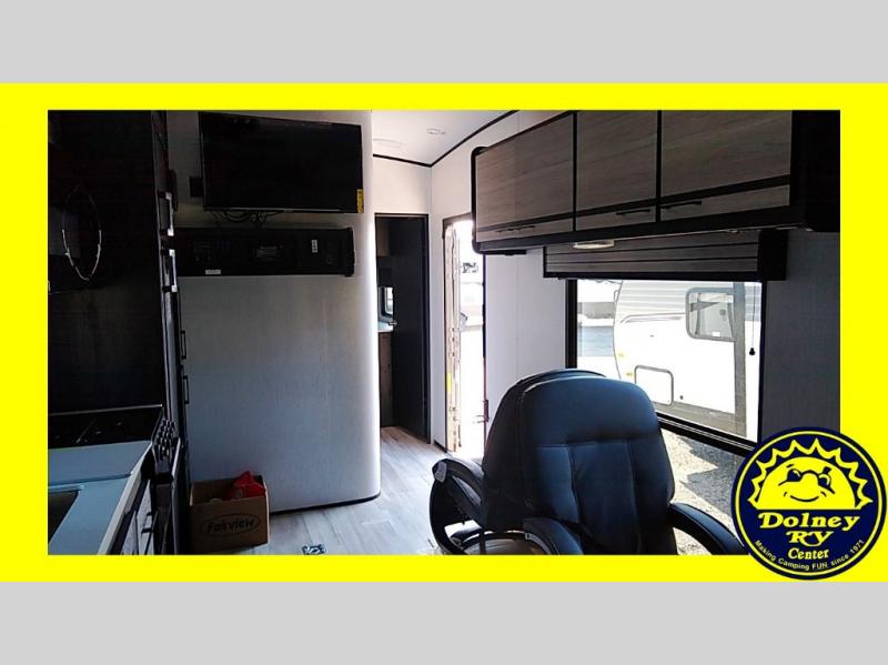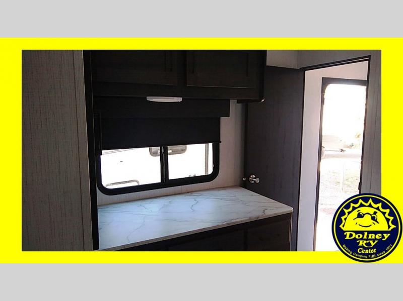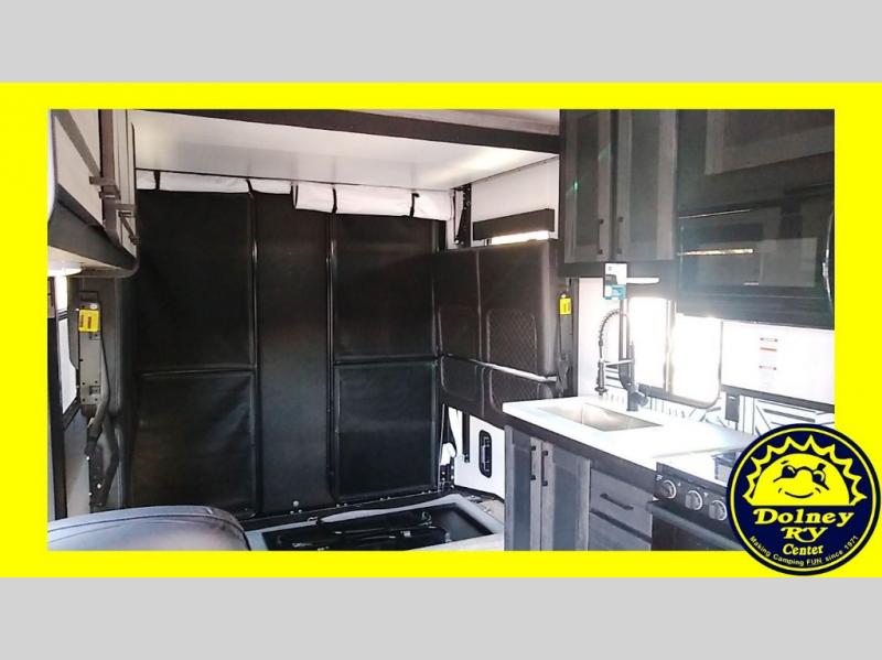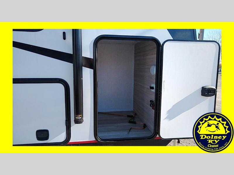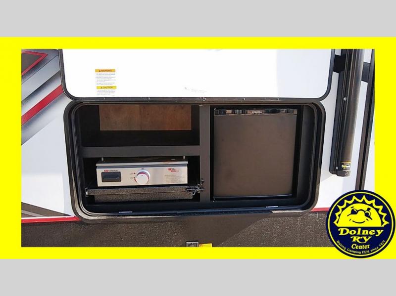 Whether you're camping with friends or family, you can be sure to have a great time in this toy hauler. Unload your bikes from the 14' garage using the 8' ramp door, then enjoy a quick game of cards at the dinette with opposing sofas. There is also a power queen bed here for your guests when they're ready for some shut-eye. This model includes a dual entry bath that will create a front master bedroom you are sure to love. Here, you'll find a king bed slide out, two bedroom dressers, plus a wardrobe for even more storage. Your favorite feature of this toy hauler may be the garage, or it may just be the outdoor kitchen under the power awning with LED lights!