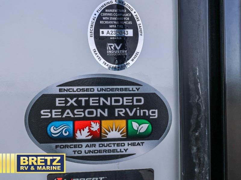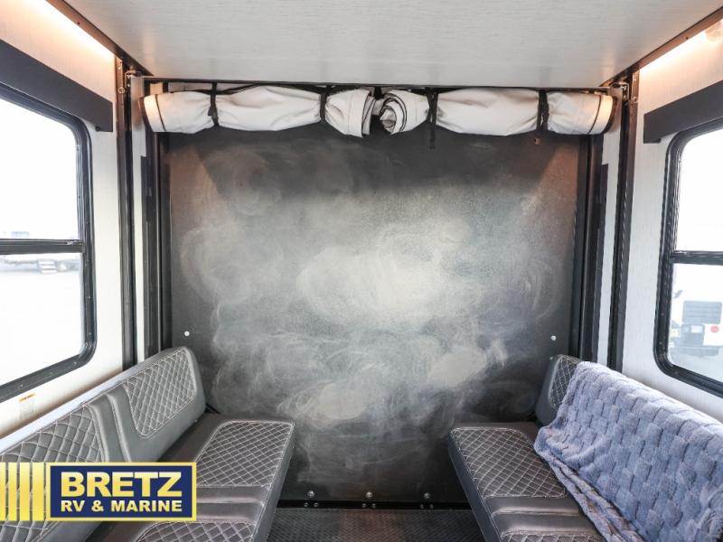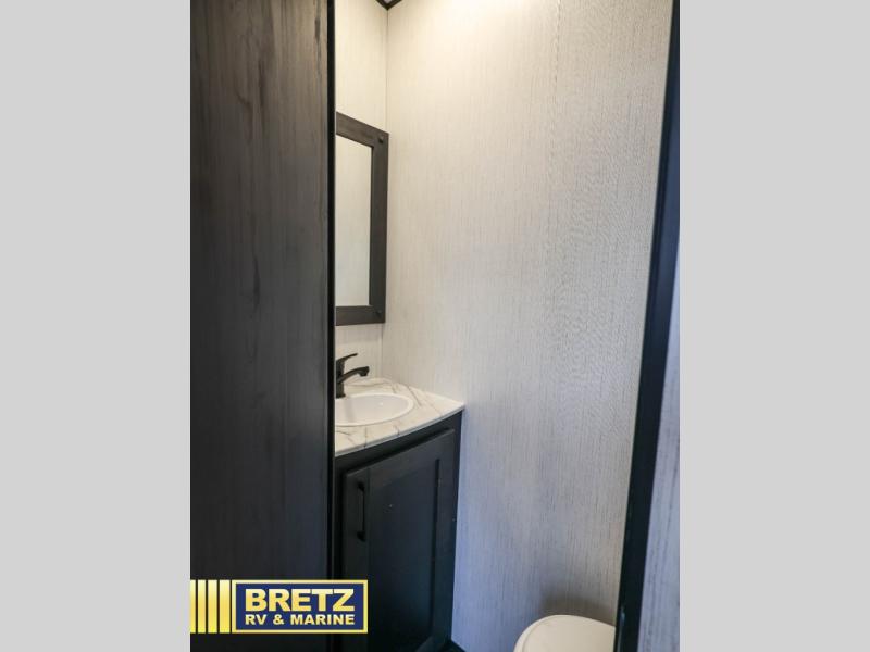 One step inside this feature packed toy hauler and you'll be hooked! The 13' 6" separate garage features 5,000 lb. tie-down rings to keep your toys secure and an 8' ramp door for easy unloading. Your guests can make this area their bedroom at night since there is a dual hinge sofa and a queen bed lift, plus their own half bath! The dual entry full bath up front will create a master bedroom you will fall in love with, especially with a king-size folding bed and a large dresser for your clothes. The interior will have you loving every minute, but don't forget about the exterior with a kitchen, a 19' power awning with LED lights, plus exterior storage for your riding gear!