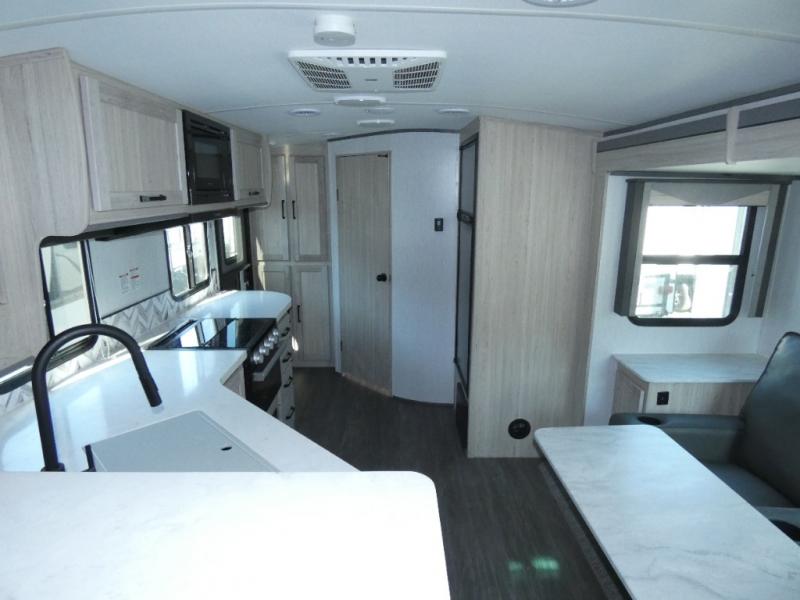 You and one other will love camping in this travel trailer! It features a front king bed with a Serta Comfort mattress with upgraded bedding and seamless countertop nightstands on either side of it. The theater dinette slide is great for enjoying meals. The raised-up bar adds more space to create your best home cooked meals that can be cooked with the Furrion Gourmet recessed oven. The rear corner bathroom has a radius shower for you to freshen up in each morning, and the black-out roller shades offer ultimate privacy day or night!
