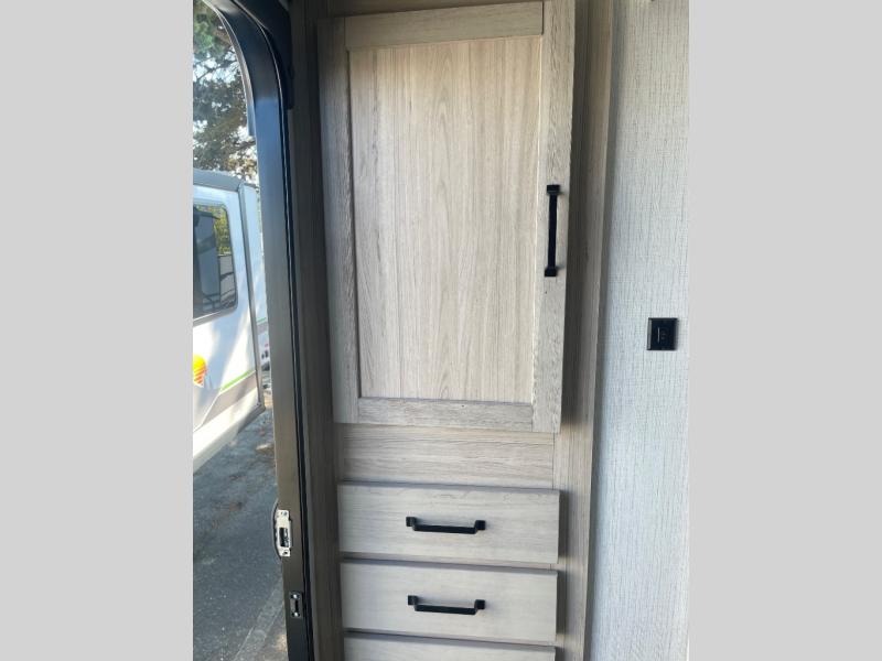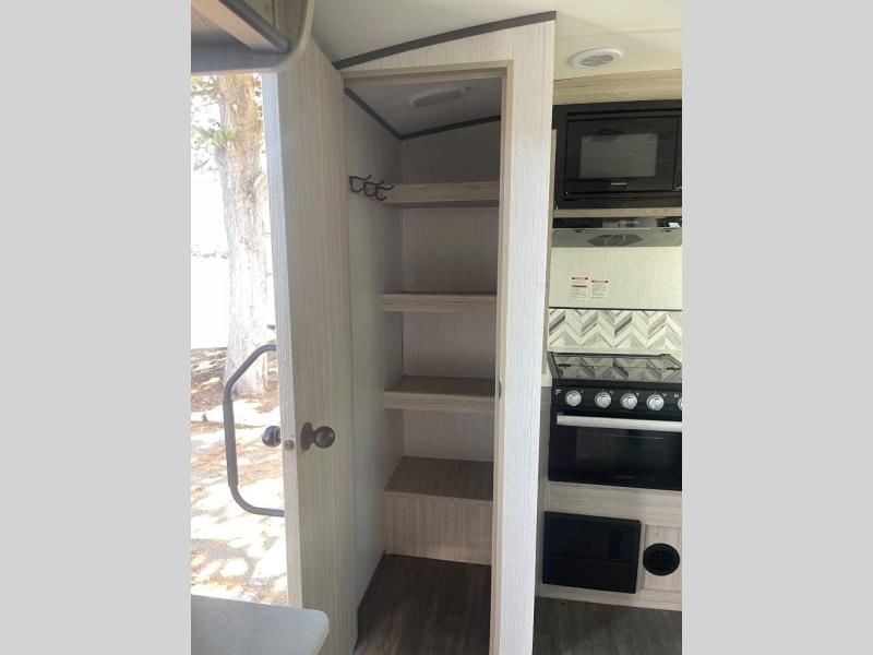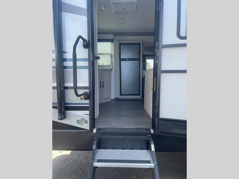 With dual entry doors, you will experience a smooth flow of traffic in and out of this unit! One of the entrances even leads into the front private bedroom which has a king bed with a Serta Comfort mattress and a wardrobe above a dresser to keep your clothes looking nice. Prepare your best meals in the rear kitchen with the Furrion Gourmet recessed oven, solid surface countertops, and even the Furrion RV tested microwave then enjoy them at the dream dinette which has hidden seat storage for games or extra cooking essentials. There is even a walk-in pantry to store your favorite snacks to enjoy on movie night while relaxing in the residential tri-fold sofa.