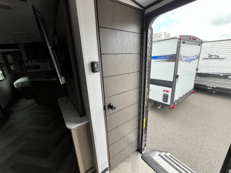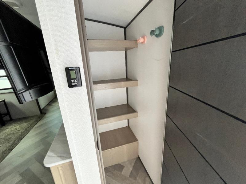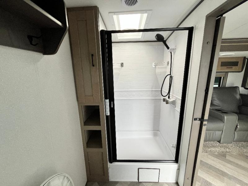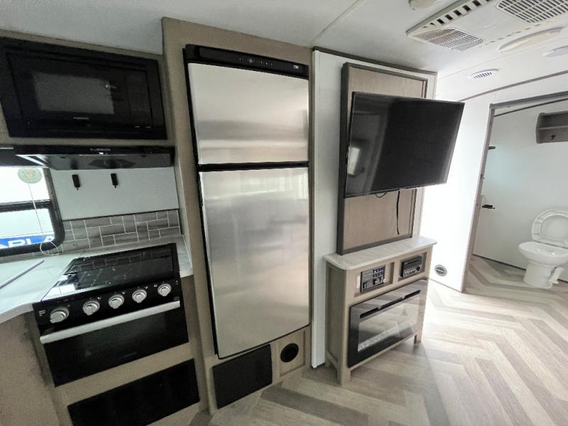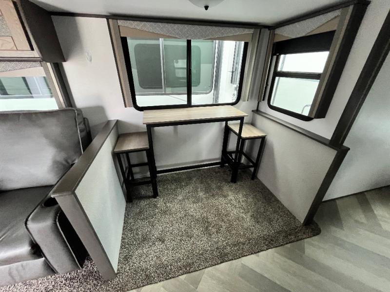 You will appreciate all of the space to move around in this travel trailer provided by the single slide! The large full rear bathroom also has room to move around as you get ready each morning. Grab some eggs from the 10 cu. ft. Norcold stainless steel refrigerator and fry them up on the three burner cooktop then enjoy them at the dream dinette which has hidden seat storage for your games or extra blankets. The residential tri-fold sofa is a great place for an afternoon nap or to watch your favorite movie on the 40" HD LED TV. Plus, you can enjoy your favorite snacks that are stored in the walk-in pantry. When you're ready to wind down your nights, head to the front private bedroom for a good night's rest on the king bed with a Serta Comfort mattress!