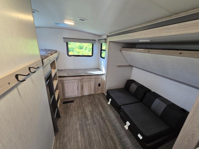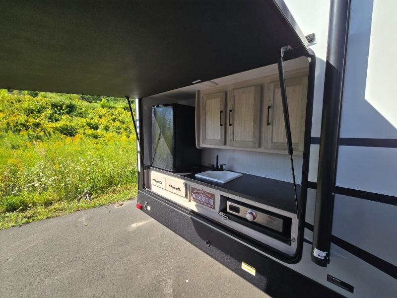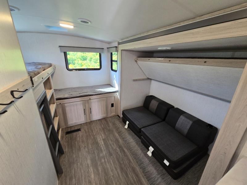 Don't pass up your chance to camp in true comfort with this travel trailer! It features a rear private bunkhouse with a bunk above an entertainment center, a lower bunk next to it, and a flip up bunk above a folding futon so the kids can bring a friend or two along. You will enjoy your own privacy with the front private bedroom with a king bed that has a Serta Comfort mattress. You could even transform the residential tri-fold sofa and dream dinette into extra sleeping spaces when you aren't using them to enjoy a meal or watch a movie with the 40" HD LED TV. The dual entry doors make it easy to access this unit, especially the full bathroom with its exit/entrance door near the outdoor kitchen!