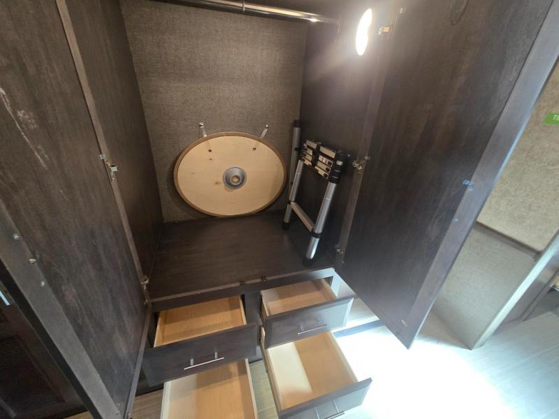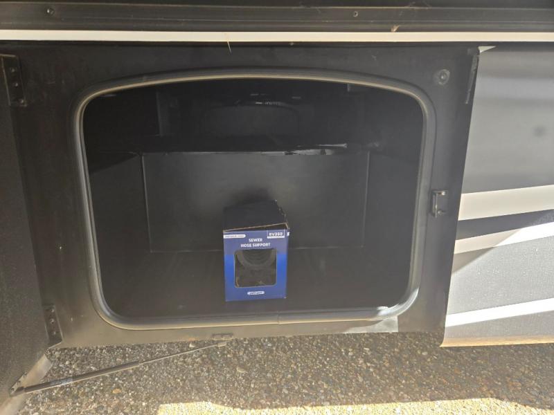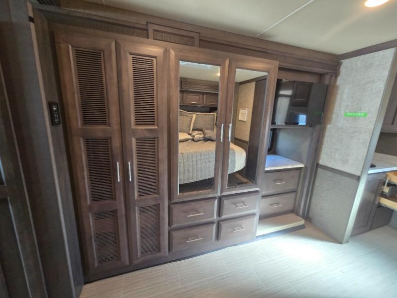 This motorhome features a full-wall slide, plus two additional slides for maximum space and comfort. You can sleep seven people thanks to the drop-down overhead bunk, the king bed slide out, and the furniture in the main living area. The fireplace and retractable 49" TV will make it feel a little more like home, and the residential kitchen is any chef's dream. Since this model includes a bath and a half, your guests won't have to wait in line, and you'll find plenty of storage space throughout for everyone's belongings.
