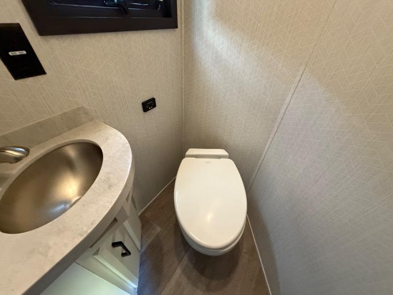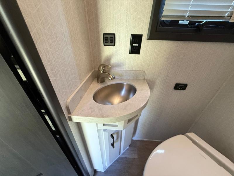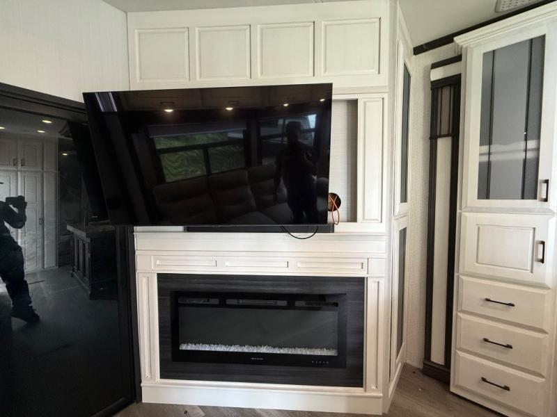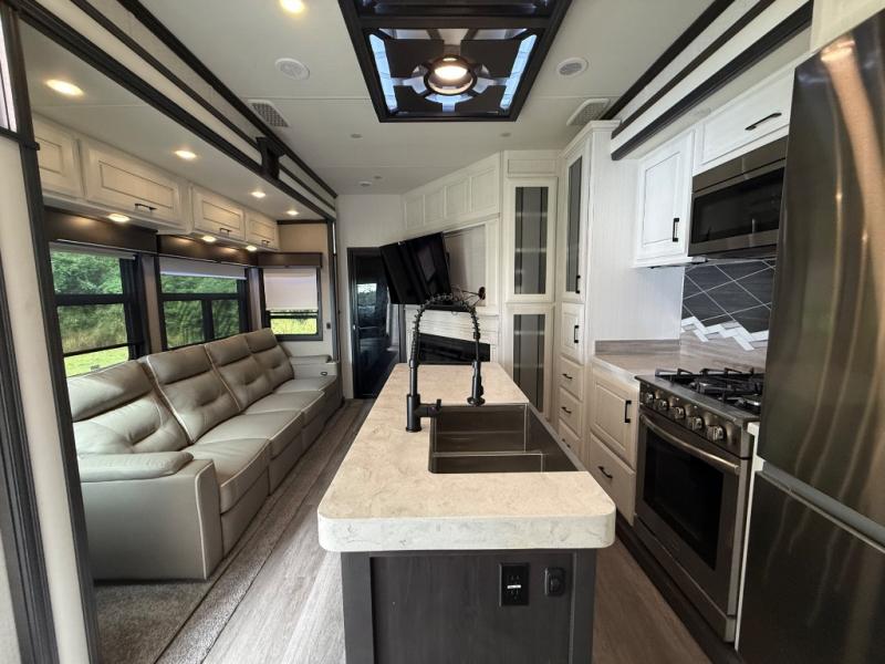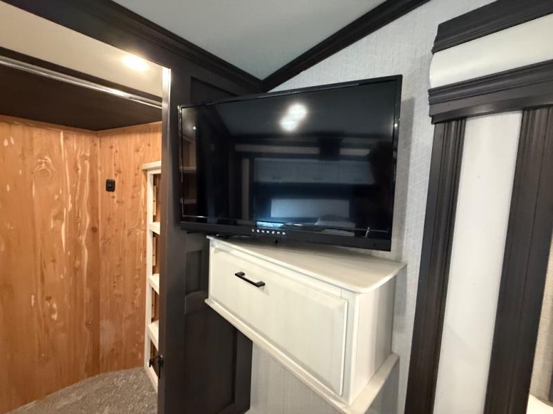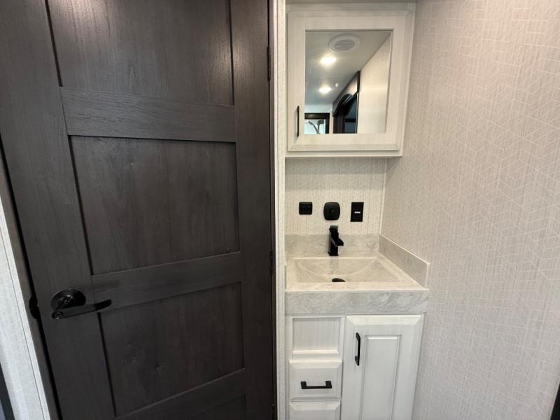 One of the best things about this Full House fifth wheel toy hauler is the fact that it comes with both a full and half bathroom! You'll also find extra convenience in the kitchen with the island that delivers some extra space for meal prep, and additionally, the opposing slides will provide more interior living space in this area as well. Throughout this entire unit, you will find three LED TVs which means that it will be super easy to stay entertained even if the weather outside isn't cooperating, and there is superb storage with the walk-in closet and vanity slide in the front bedroom.
