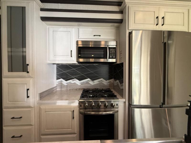 You will find full-time living at its best in the DRV Luxury Suites Full House fifth wheel toy hauler! This luxurious brand features several items that most toy haulers tend to ignore when it comes to residential living, but the Full House toy hauler truly is a full house on wheels! The garage features industrial metal cabinetry, LED lighting, a touchscreen entertainment system, a 50" LED HDTV, and dual 30-gallon fuel tanks. You can even choose to amp up the garage to the next level by adding the optional patio and the electric drop-down bed. A six-point hydraulic leveling system keeps your Full House in place, and the Onan gasoline generator supplies power to your unit. The interior is rather glamorous with its hand-laid vinyl floor tile, its crown molding, its plush residential high-durability carpet, and its ceiling fan, and the residential kitchen is undoubtedly going to be an essential feature for full-time living.